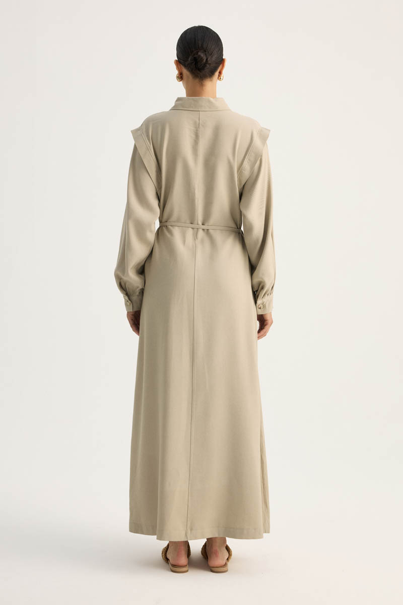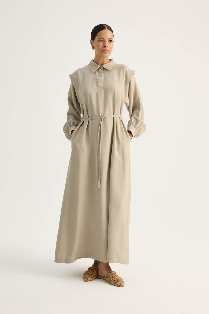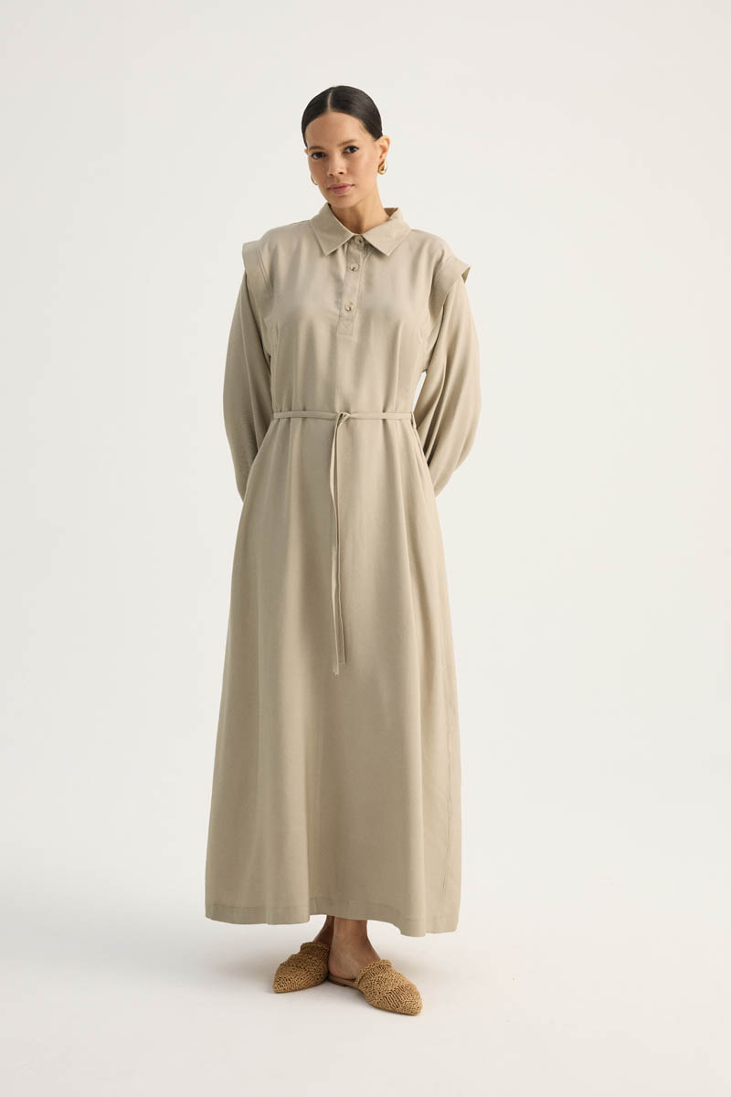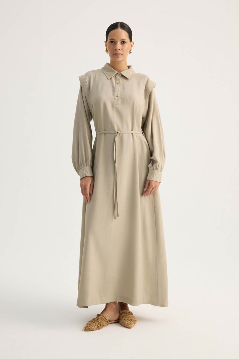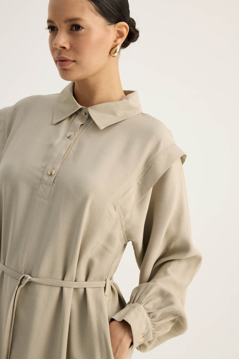 Polo Yaka Elbise Taş. Polo yakadır, önden yarım düğmelidir, kolu parça dikiş aller detaylıdır, biye kuşaklıdır, düşük omuzludur, kolları büzgülü manşetlidir, yandan ceplidir, astarsızdır, iç göstermez. Günlük kullanım ve özel günlerinizde tercih edebilirsiniz.