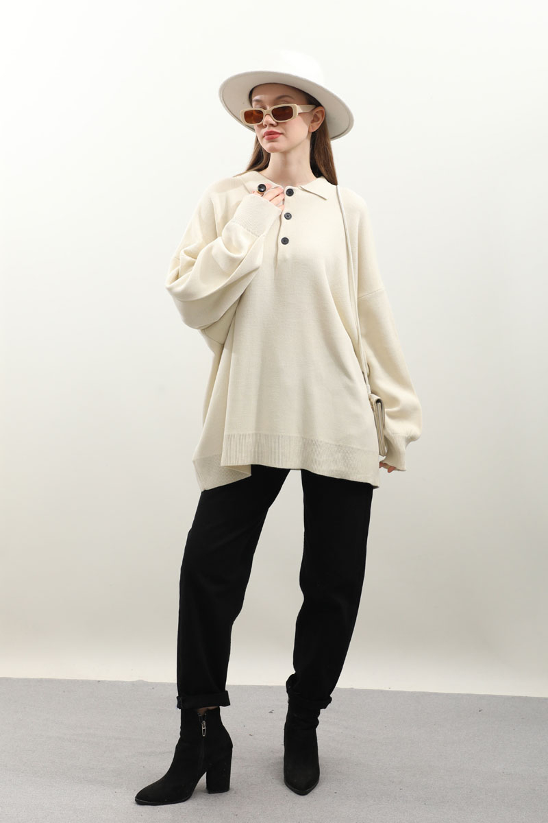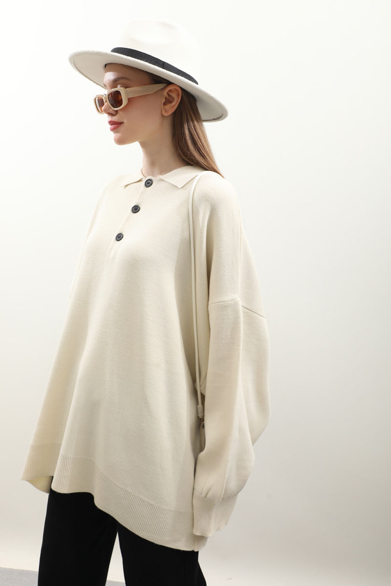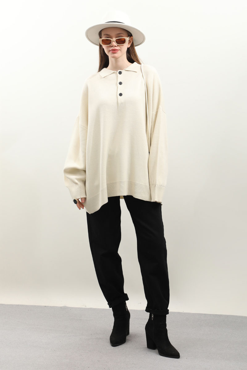 Polo Yaka Uzun Kazak Krem. Gömlek yakadır, önden yarım düğmelidir, düşük omuzlu, etek ucu ve manşetleri ribanalıdır, cepsizdir, astarsızdır. Günlük kullanım için uygundur.