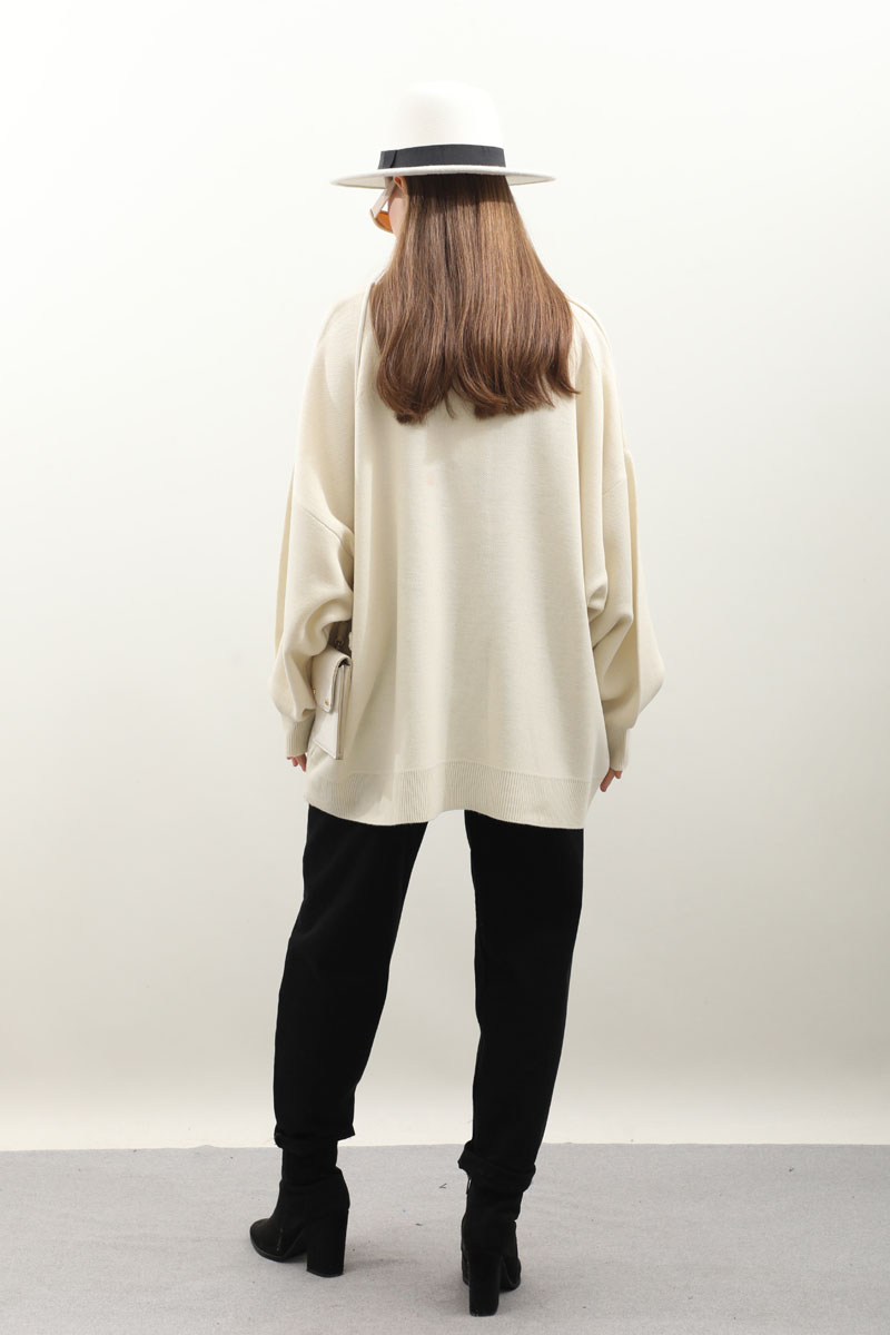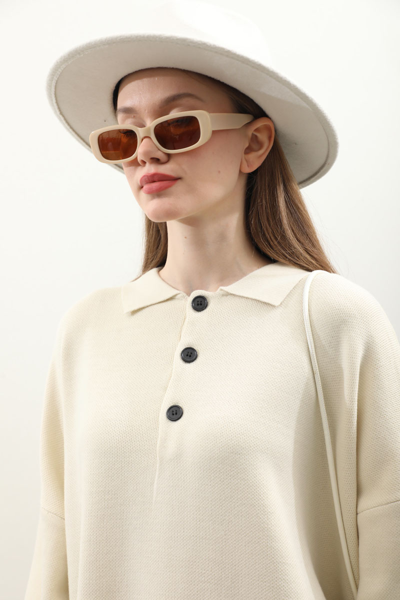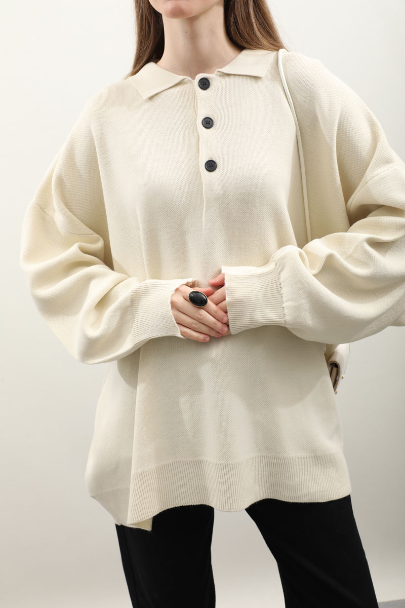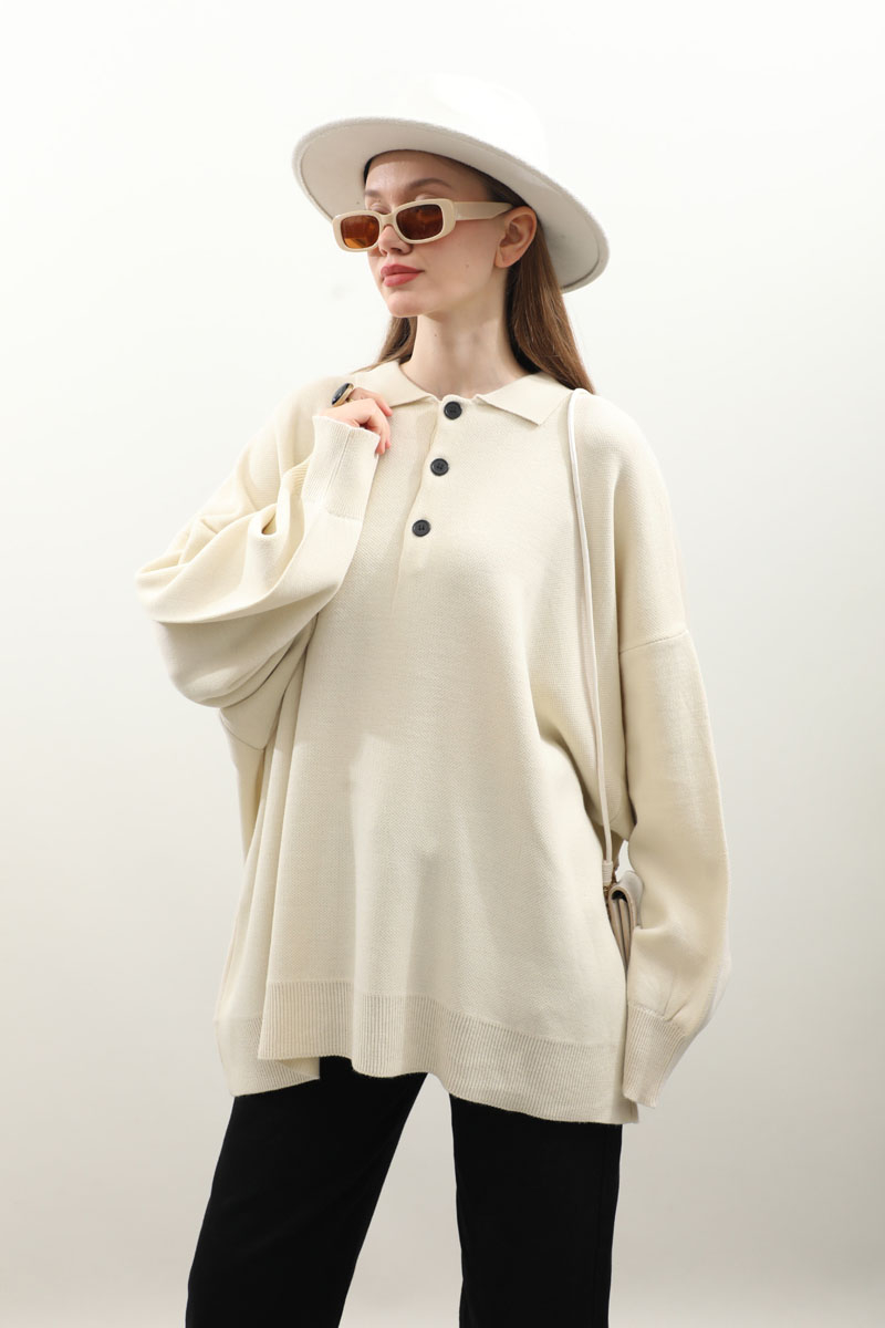 Polo Yaka Uzun Kazak Krem. Gömlek yakadır, önden yarım düğmelidir, düşük omuzlu, etek ucu ve manşetleri ribanalıdır, cepsizdir, astarsızdır. Günlük kullanım için uygundur.