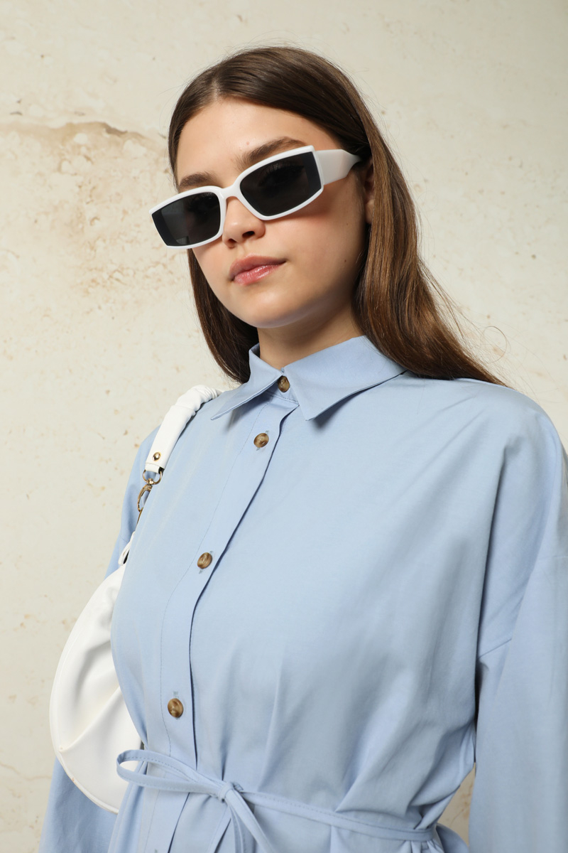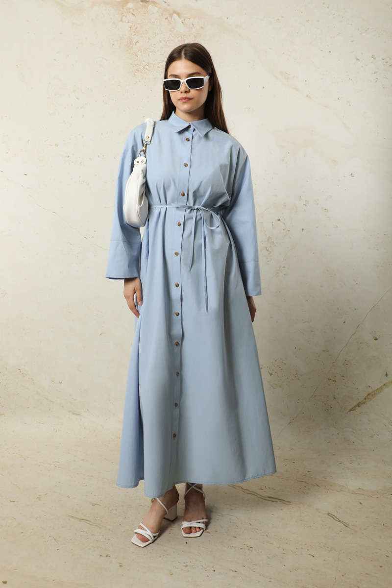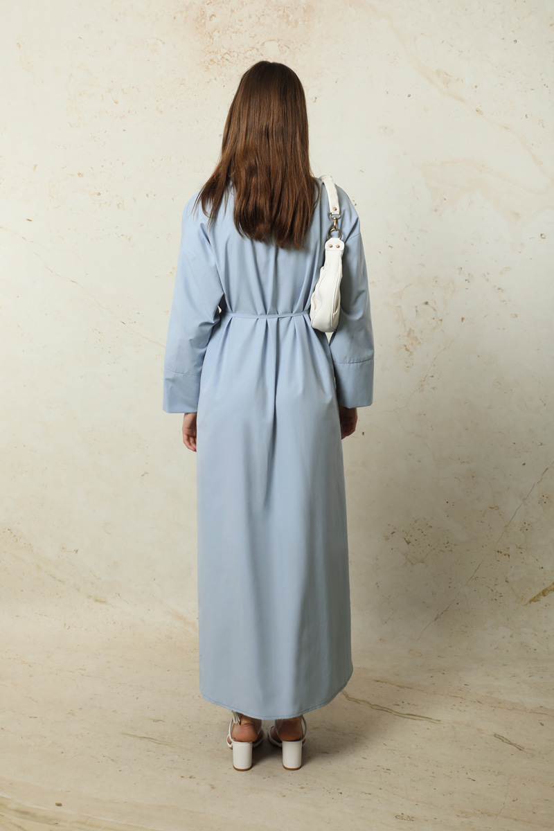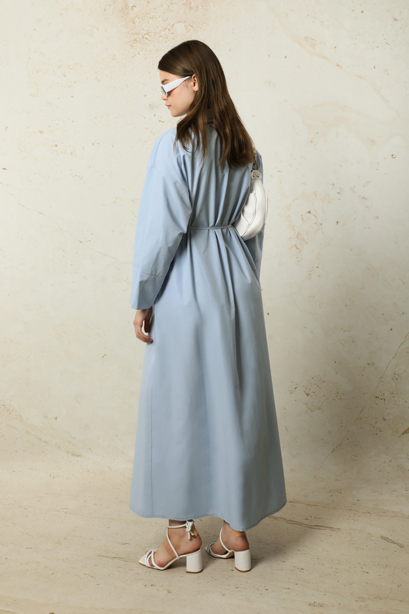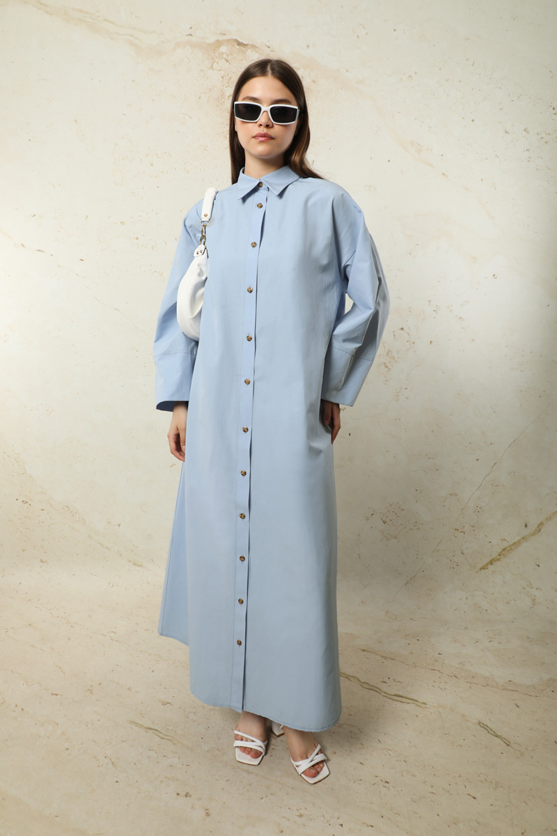 Poplin Gömlek Elbise Bebe Mavisi. Ürünümüz önden düğmelidir. İnce kuşaklıdır.Kalın manşet detaylıdır. Günlük hayatınızda abaya, tunik veya elbise olarak tercih edebilirsiniz
