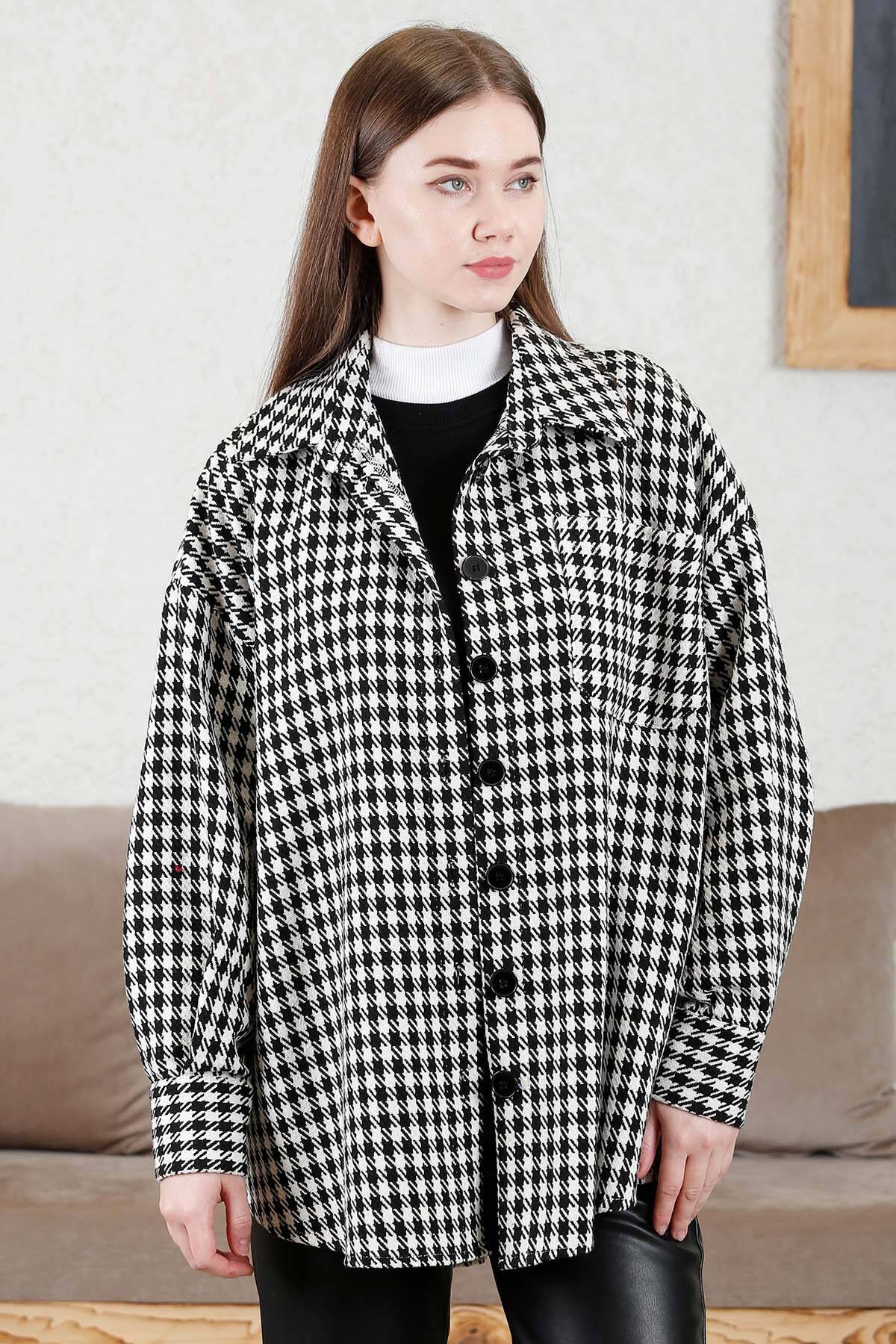 Yakalı, düğmeli, oversize siyah beyaz renktedir. Kumaş kalındır kış için tasarlandı.