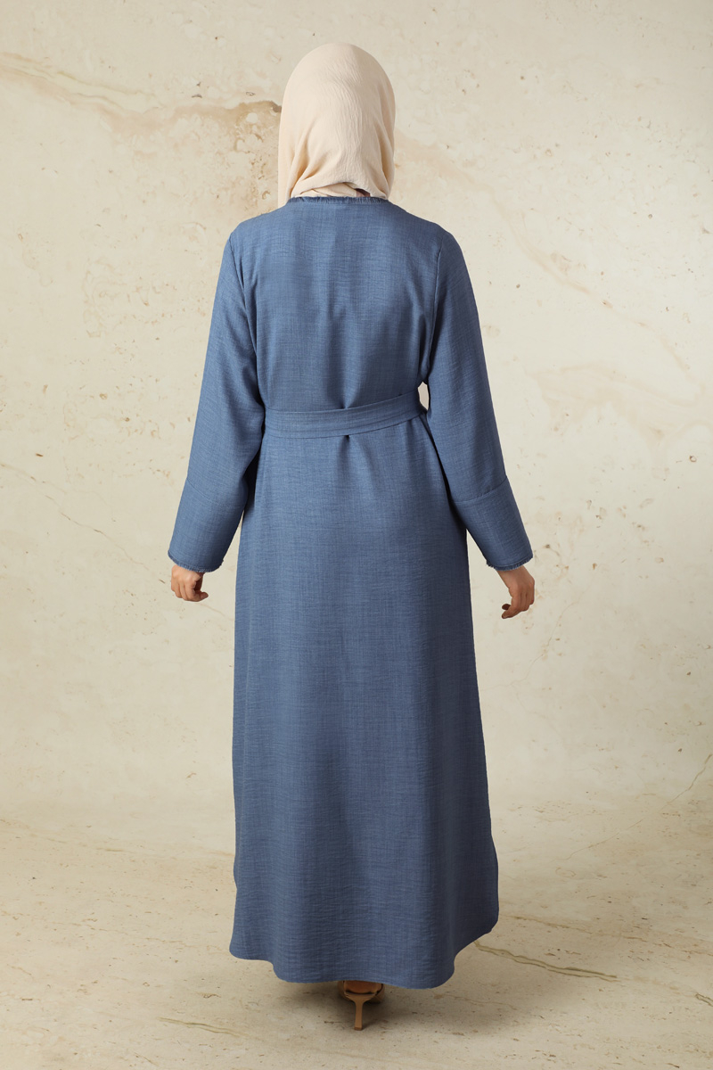 Püsküllü Abaya Takım Bebe Mavisi. Abaya yandan ceplidir. Manşeti geniş dikiş detaylıdır. Yandan yırtmaçlıdır. Ön patı ve kolları püskül detaylıdır. içlik arkadan fermuarlıdır. İçlik sıfır kolluludur. Günlük kullanım ve özel günlerinizde tercih edebilirsiniz.