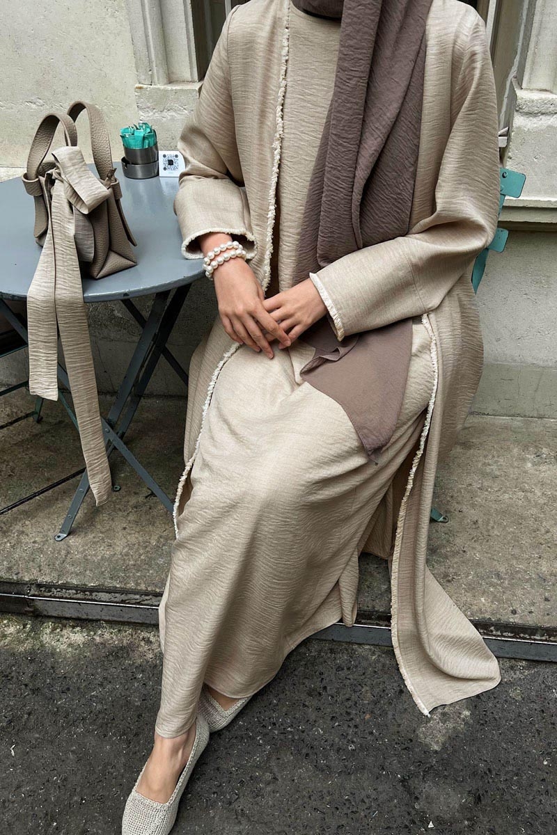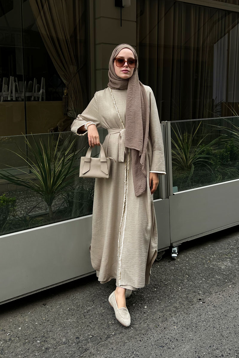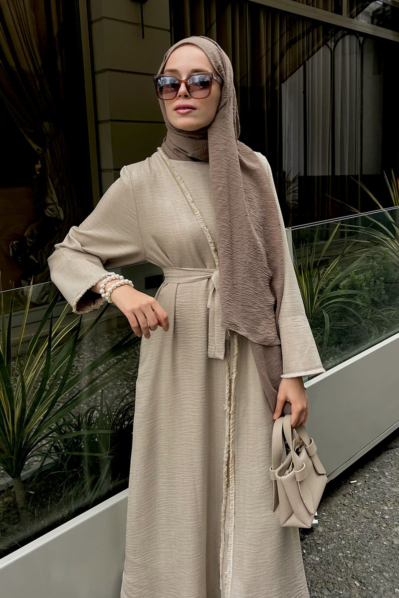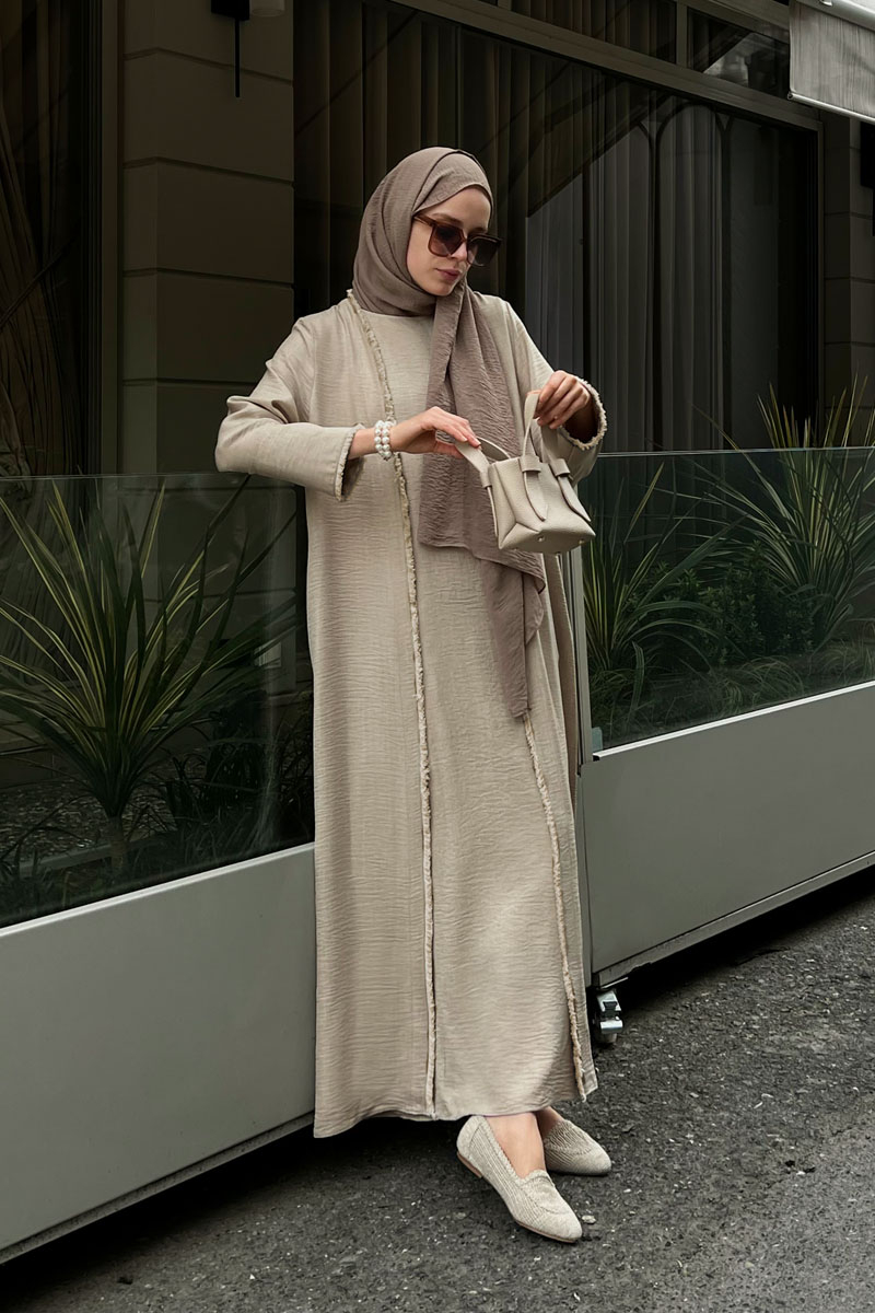 Püsküllü Abaya Takım Taş. Abaya yandan ceplidir. Manşeti geniş dikiş detaylıdır. Yandan yırtmaçlıdır. Ön patı ve kolları püskül detaylıdır. içlik arkadan fermuarlıdır. İçlik sıfır kolluludur. Günlük kullanım ve özel günlerinizde tercih edebilirsiniz.