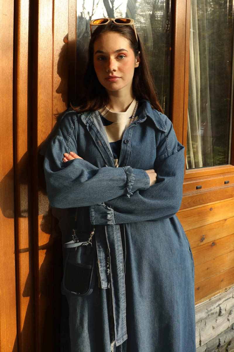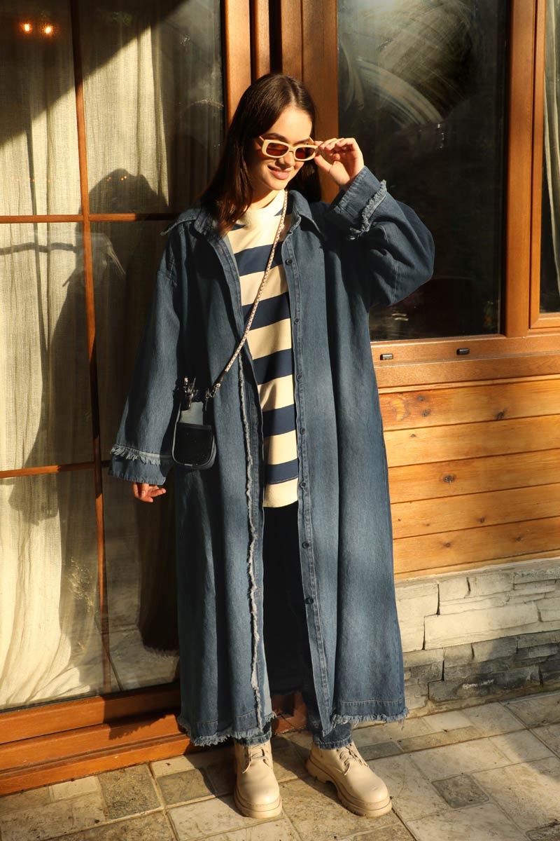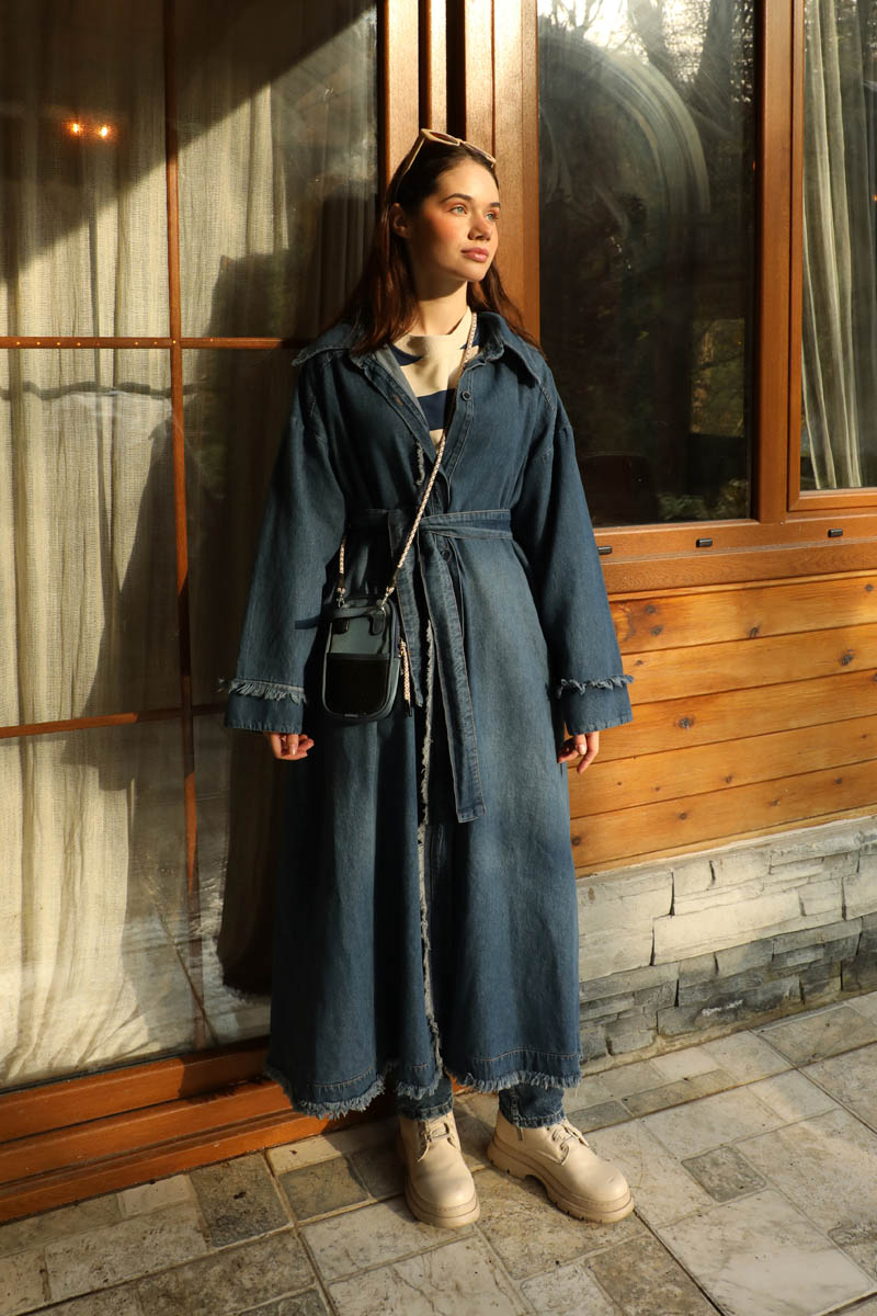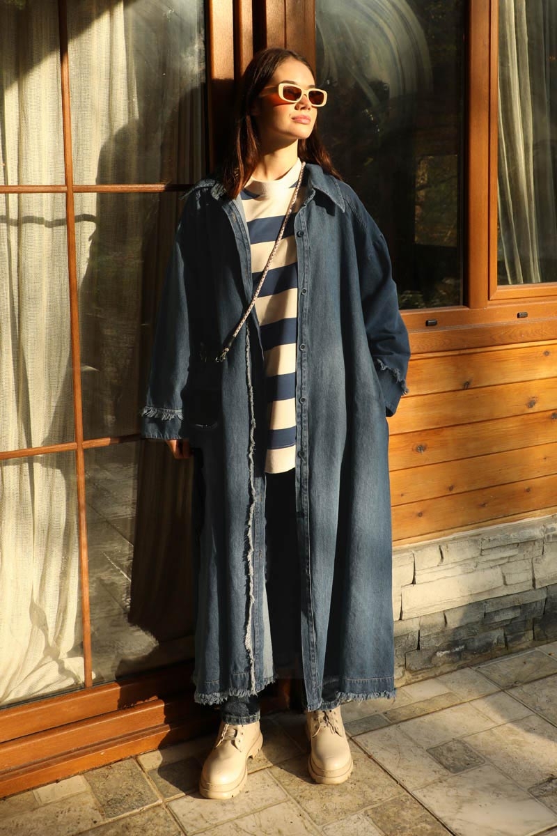 Püsküllü Denim Kap Koyu Mavi. Uzun gömlek yakadır, düşük kolludur, omuzda robalıdır, kendiliğinden püskül detaylıdır, önü düğmelidir, yandan ceplidir, astarsızdır. Günlük kullanım ve özel günlerinizde tercih edebilirsiniz.