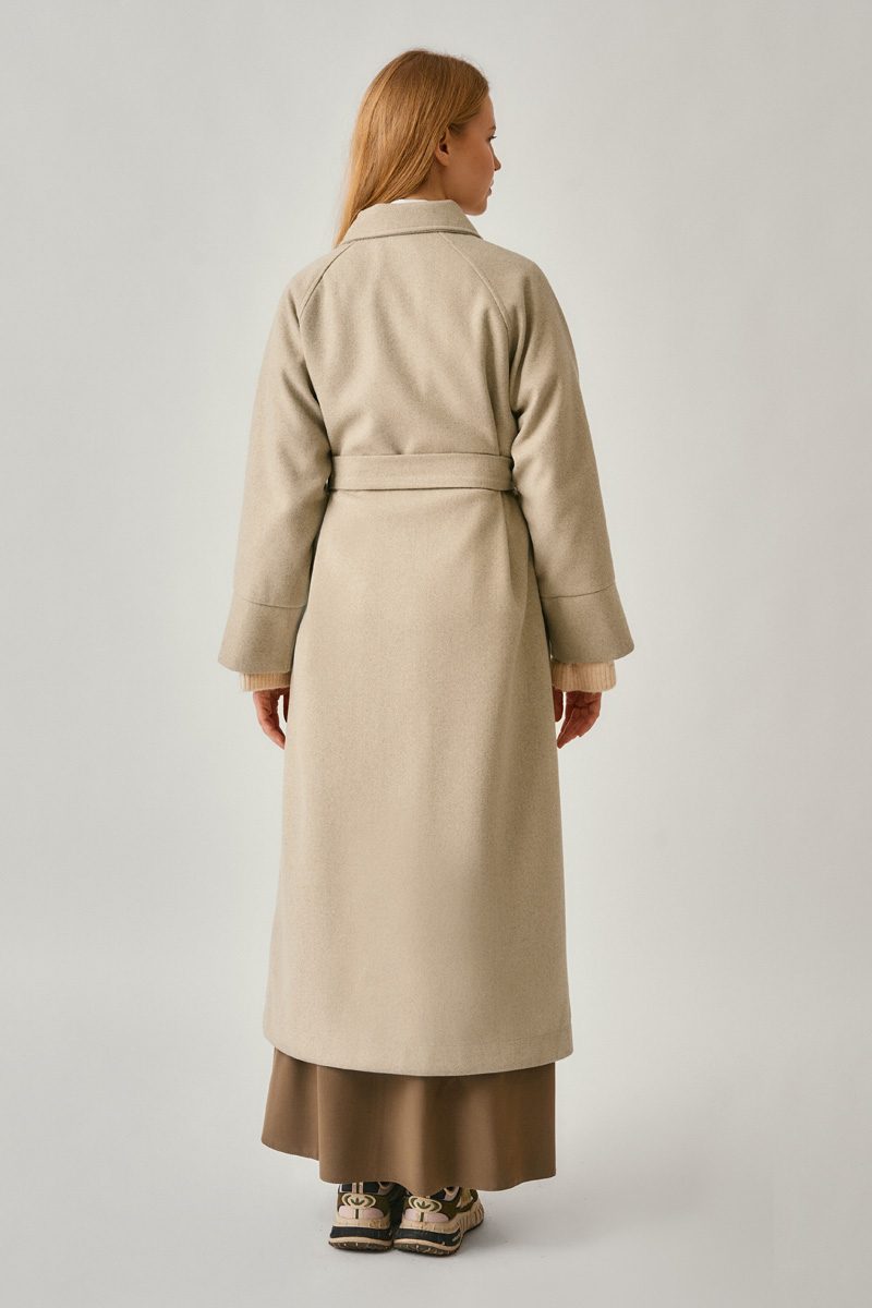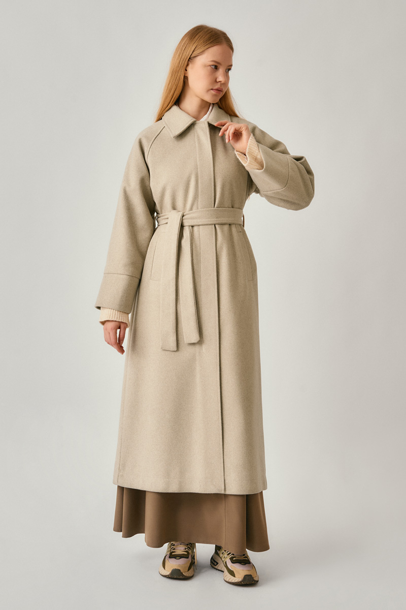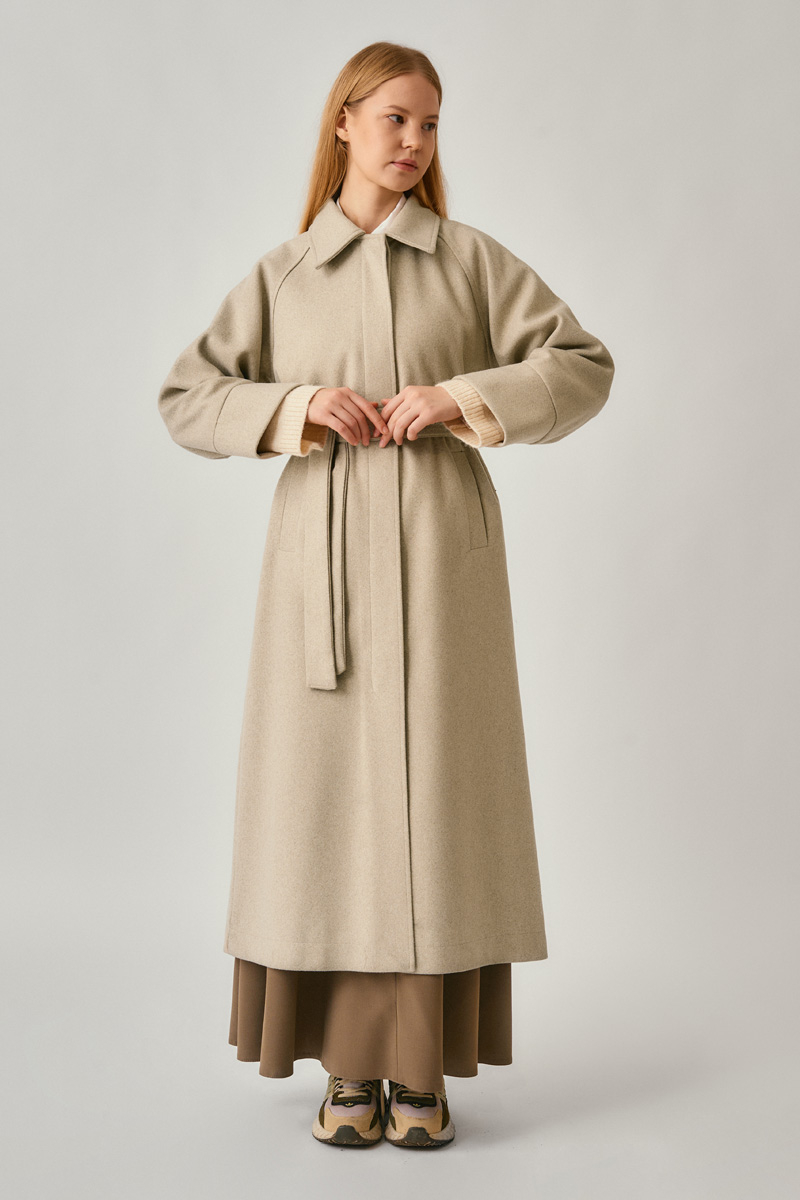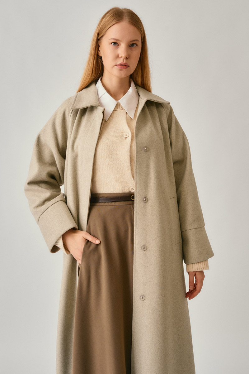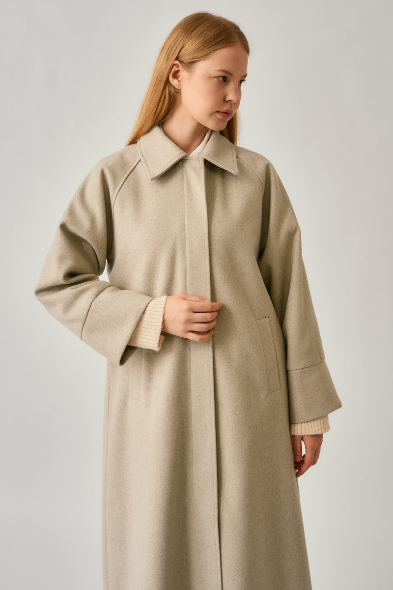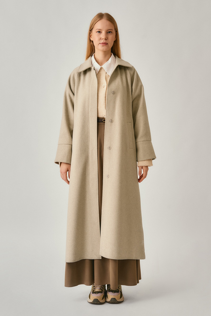 Raglan Sleeve Basic Coat Stone offers timeless elegance with its clean, minimal lines. Designed with raglan sleeves for a relaxed fit, this piece maintains its structured stance thanks to its firm fabric. The minimal button detailing and straight cut make it suitable for both classic and modern combinations. A key outerwear piece that complements everyday and city looks throughout the winter season.