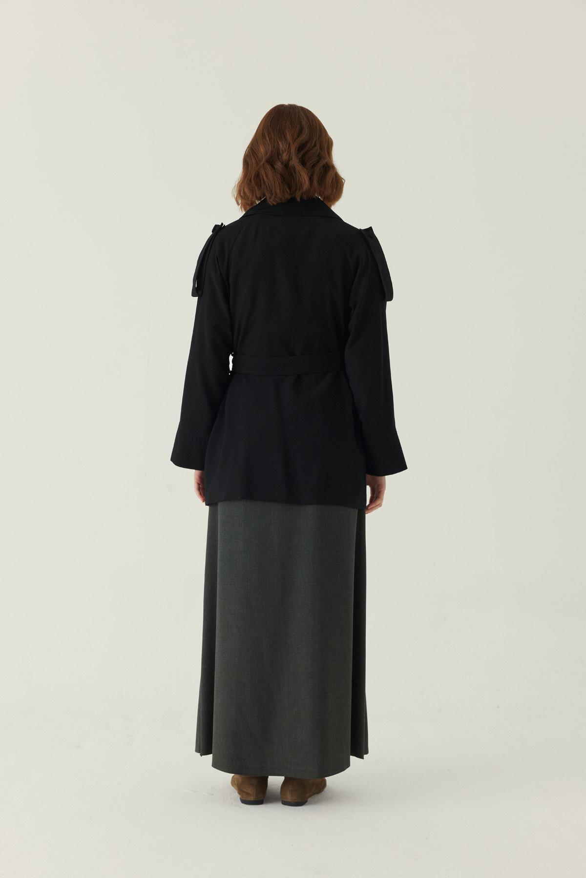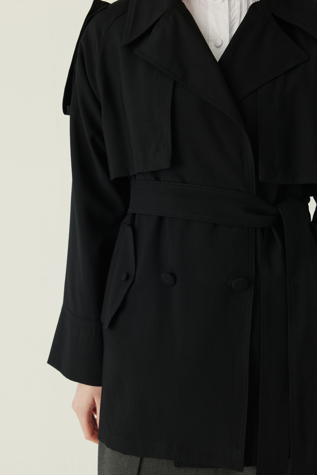 Raglan Sleeve Trench Coat – Black is a strong piece that reinterprets the classic trench coat form with modern details. The raglan sleeve cut creates a soft and balanced shoulder line, while the double-breasted front closure gives the trench a distinctive character. The structured waist and button details refine the silhouette, and the soft khaki tone offers a timeless, easy-to-style look. Suitable for a wide range of outfits, from everyday city wear to more polished combinations.