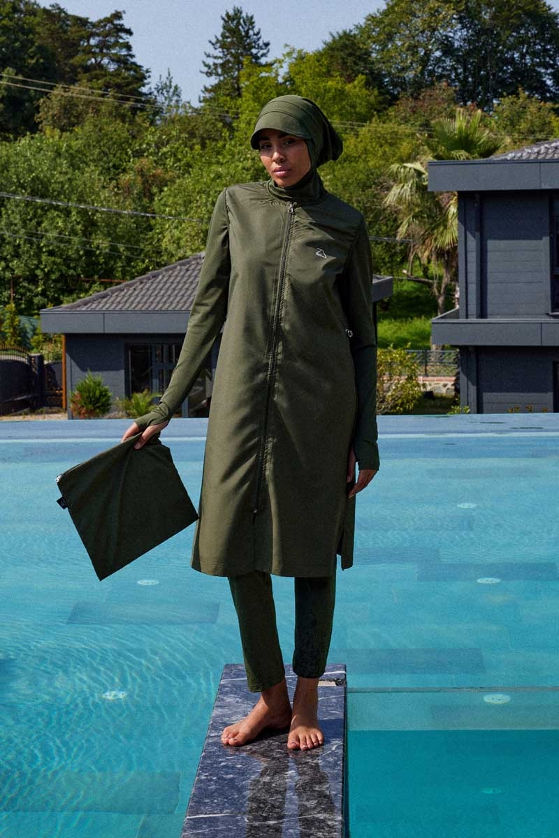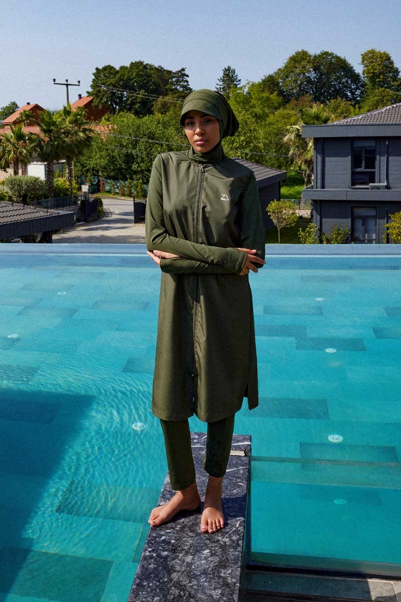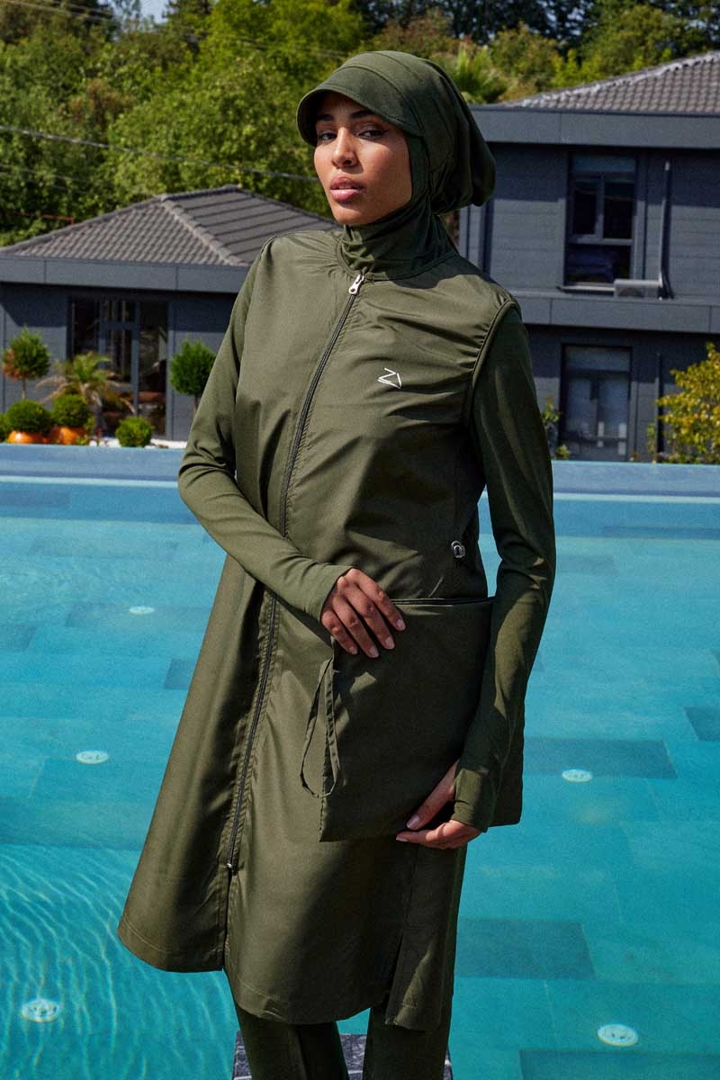 Reglan Kol Tesettür Mayo Takım Haki. Bisiklet yakalıdır, bel kısmında ayarlanabilir stoper mevcuttur, bilek kısmı parmak geçirme detaylıdır, kollarda kullanılan likra kumaş sayesinde hareket özgürlüğü sağlar, önden tam fermuarlıdır, cepsizdir, yandan kısa yırtmaçlıdır, tayt beli lastiklidir, boru paçalıdır, esnektir. Paket İçeriği: Üst tunik, tayt,ve bonesi takım olarak satılmaktadır. (Şapka takıma dahil değildir.)