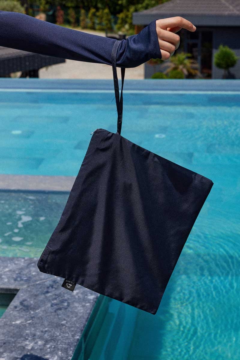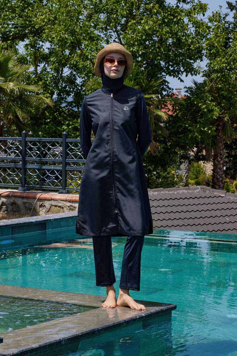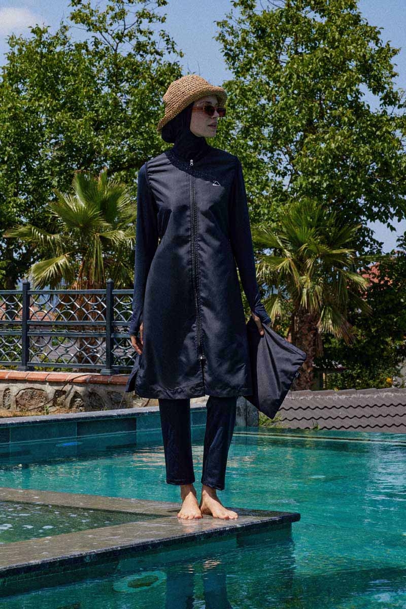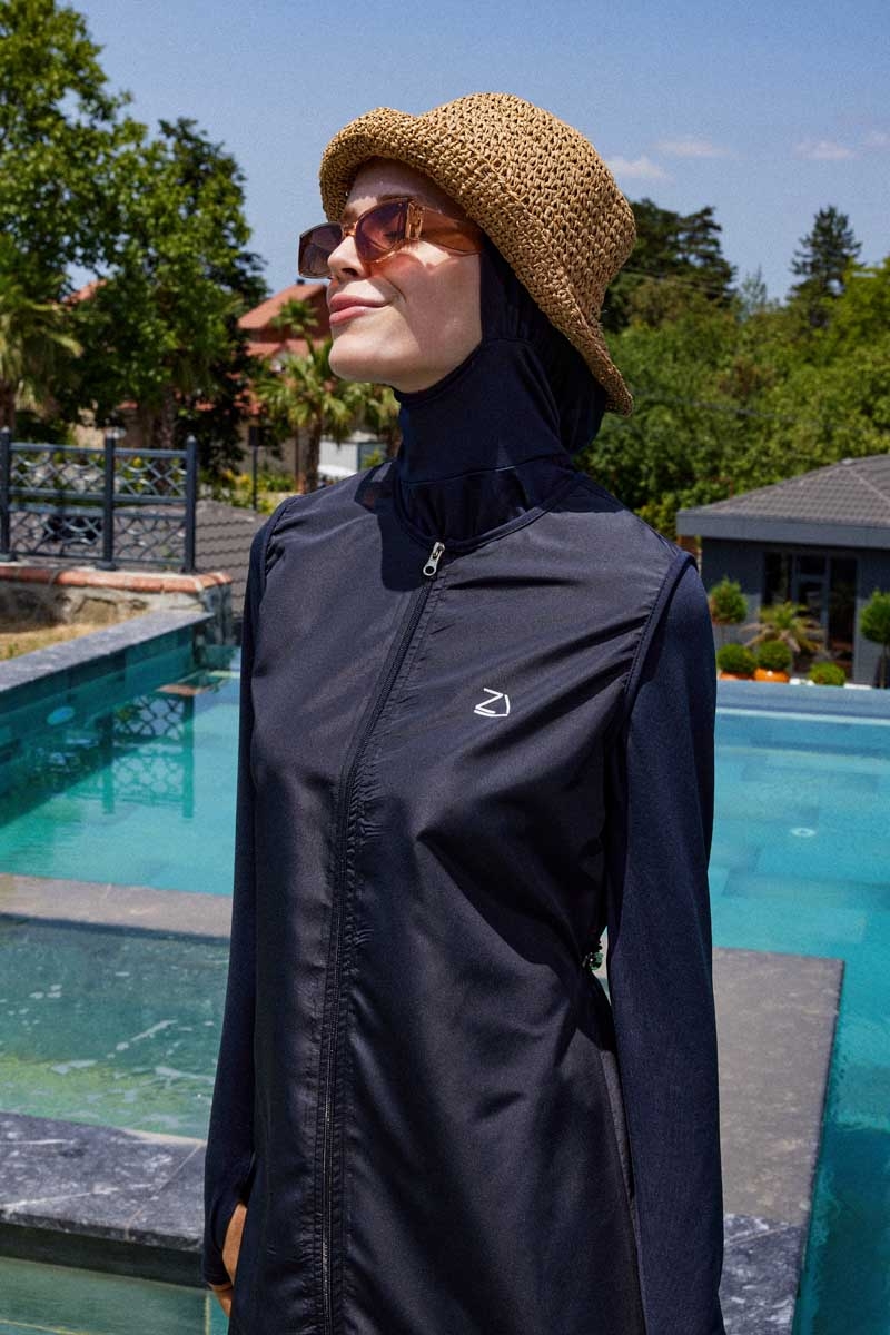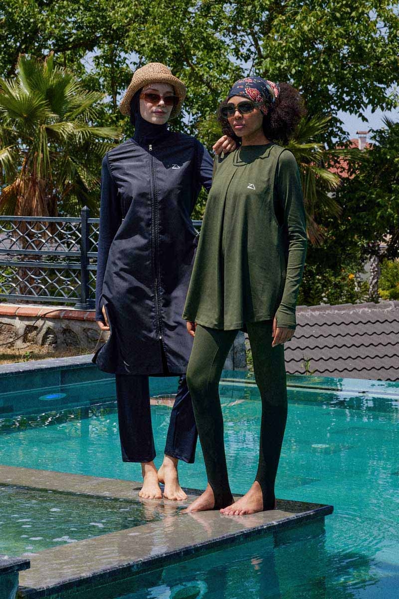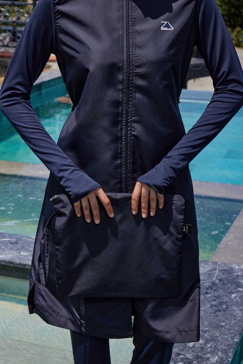 Reglan Kol Tesettür Mayo Takım Lacivert. Bisiklet yakalıdır, bel kısmında ayarlanabilir stoper mevcuttur, bilek kısmı parmak geçirme detaylıdır, kollarda kullanılan likra kumaş sayesinde hareket özgürlüğü sağlar, önden tam fermuarlıdır, cepsizdir, yandan kısa yırtmaçlıdır, tayt beli lastiklidir, boru paçalıdır, esnektir. Paket İçeriği: Üst tunik, tayt,ve bonesi takım olarak satılmaktadır. (Şapka takıma dahil değildir.)
