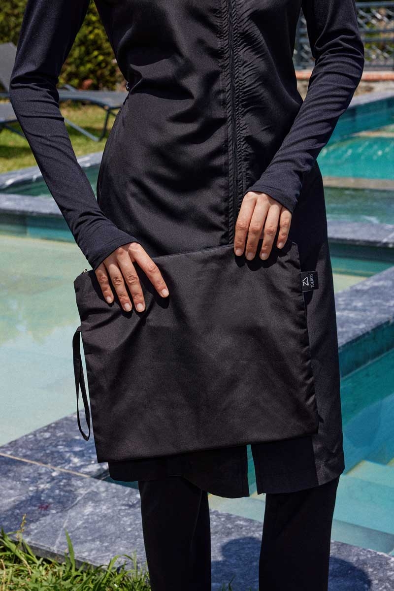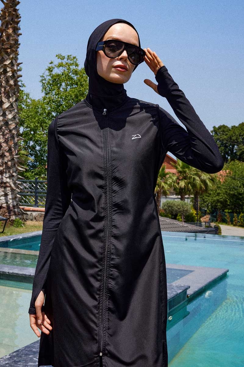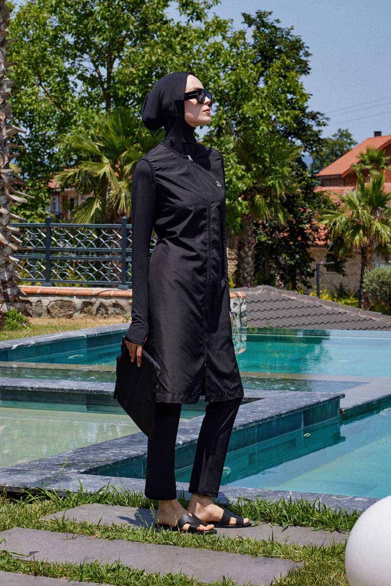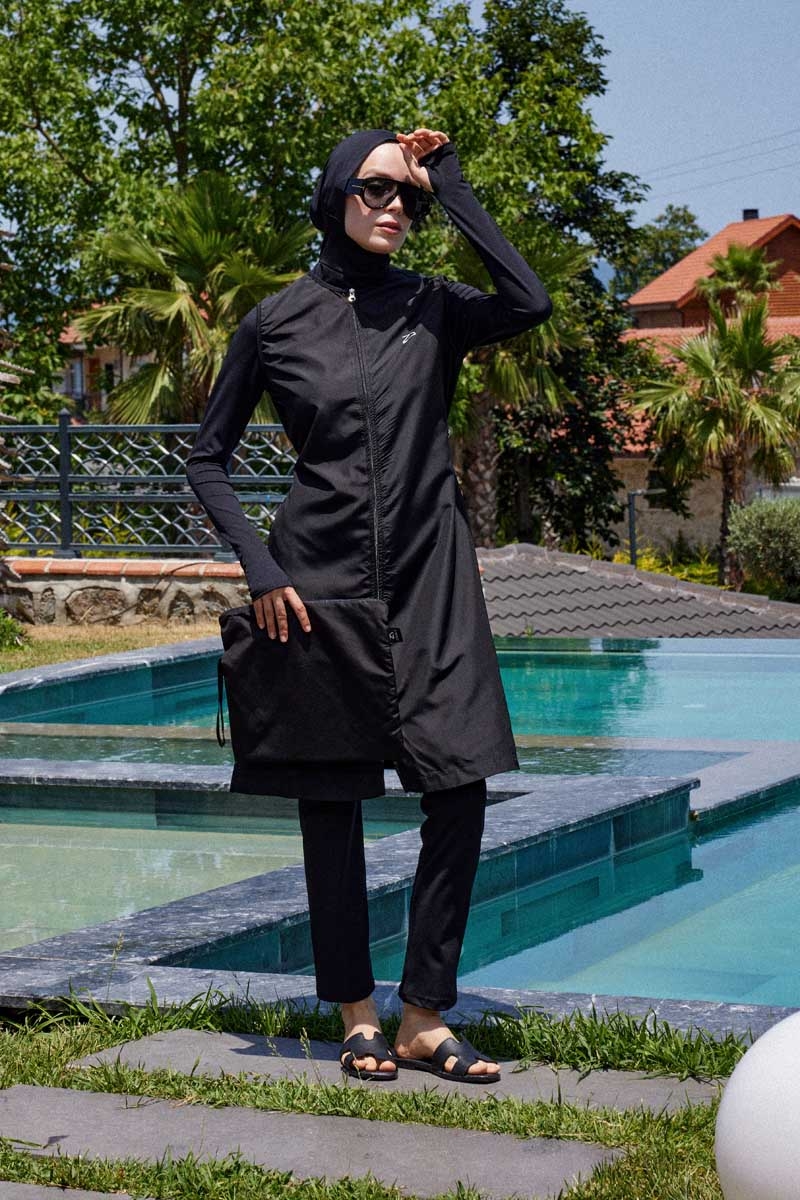 Reglan Kol Tesettür Mayo Takım Siyah. Bisiklet yakalıdır, bel kısmında ayarlanabilir stoper mevcuttur, bilek kısmı parmak geçirme detaylıdır, kollarda kullanılan likra kumaş sayesinde hareket özgürlüğü sağlar, önden tam fermuarlıdır, cepsizdir, yandan kısa yırtmaçlıdır, tayt beli lastiklidir, boru paçalıdır, esnektir. Paket İçeriği: Üst tunik, tayt,ve bonesi takım olarak satılmaktadır. (Şapka takıma dahil değildir.)