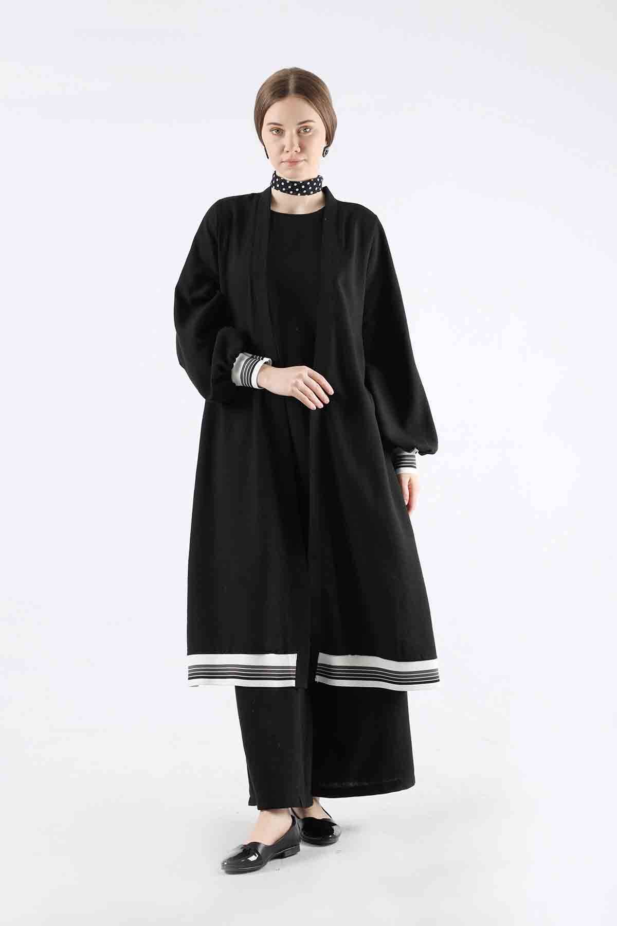 Ribanalı Abaya Takım Siyah. Abaya Manşeti ve Ön beden başlangıcı ribanalıdır. Bluz bisiklet yakalıdır. Pantolon bol paçadır ve lastiklidir. Ceplidir. Yeni sezonun favori ürünüdür.