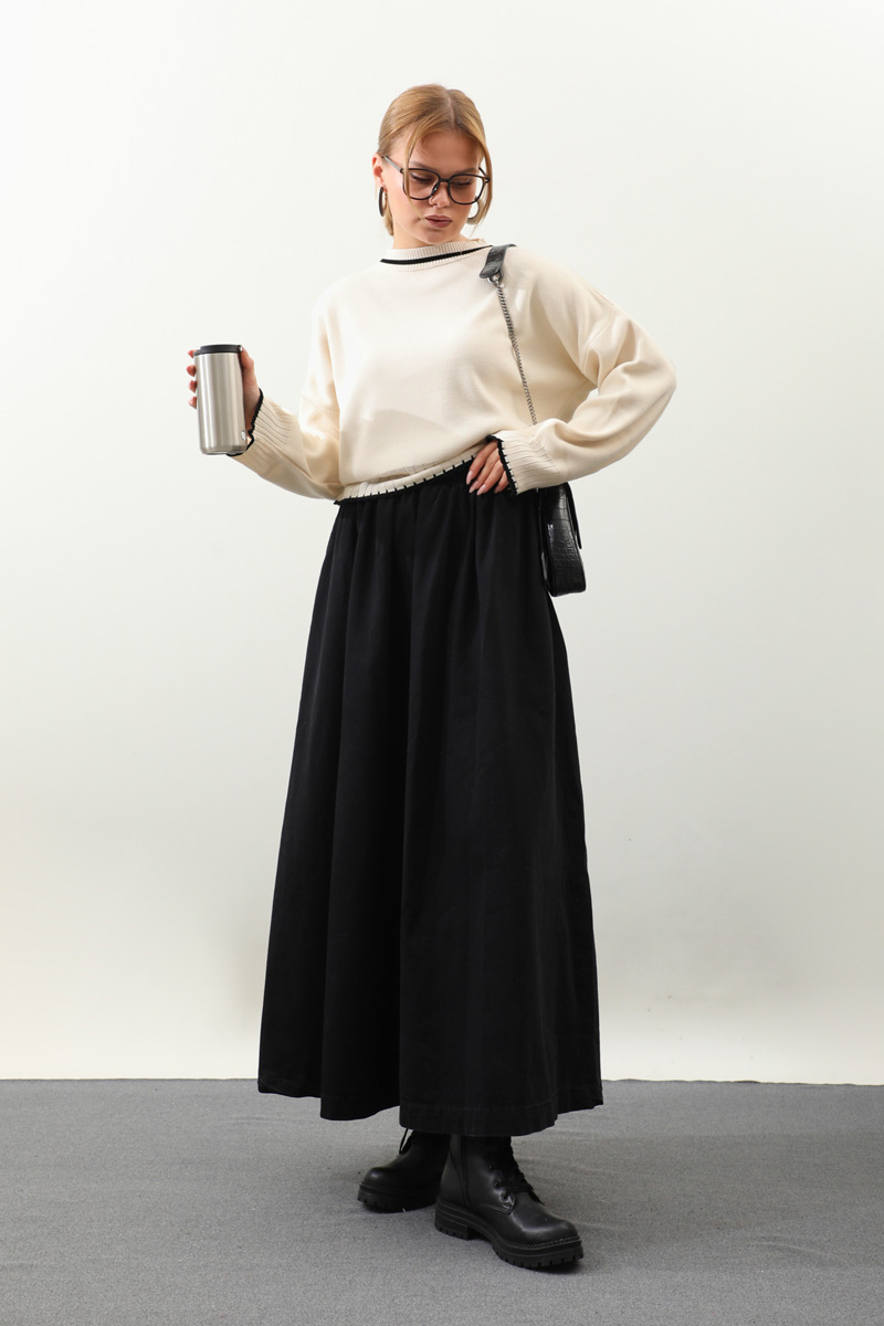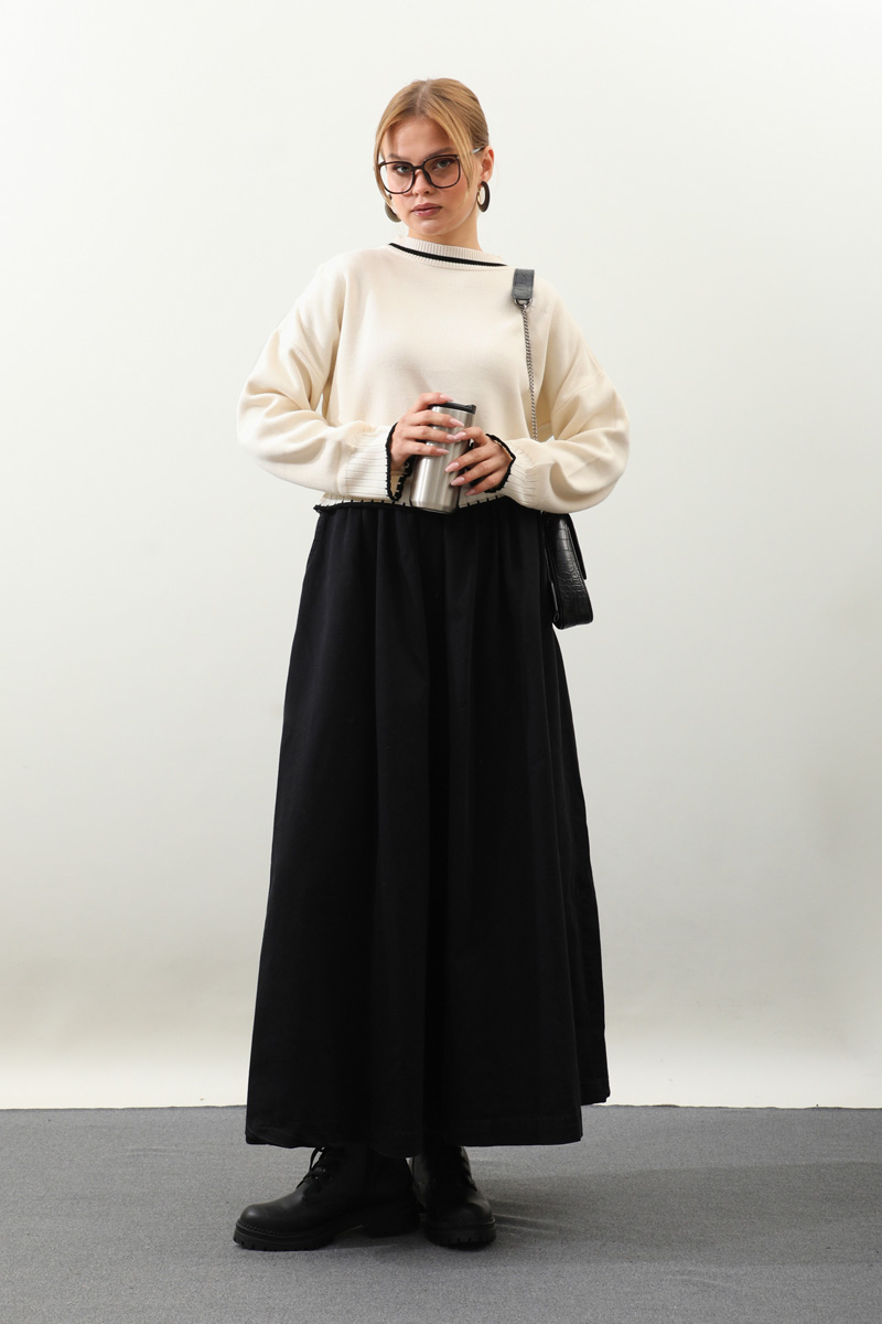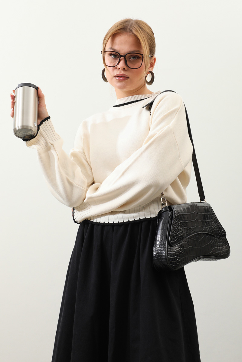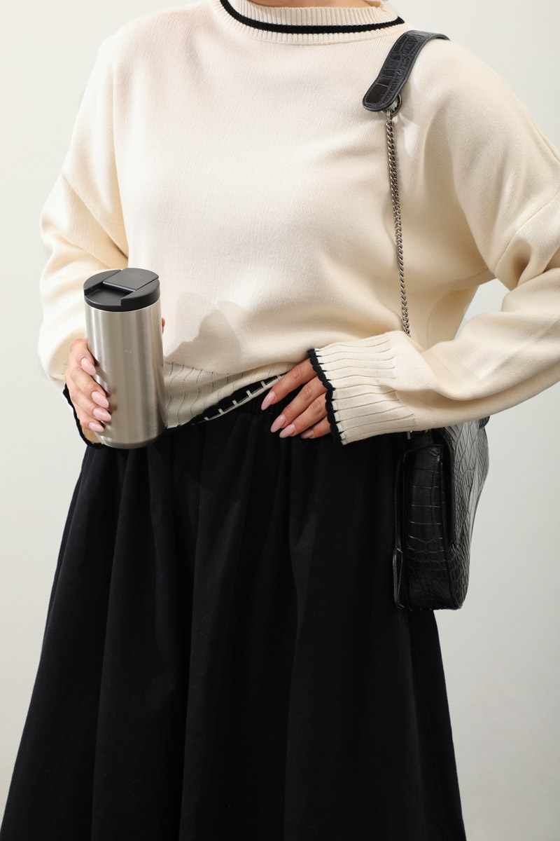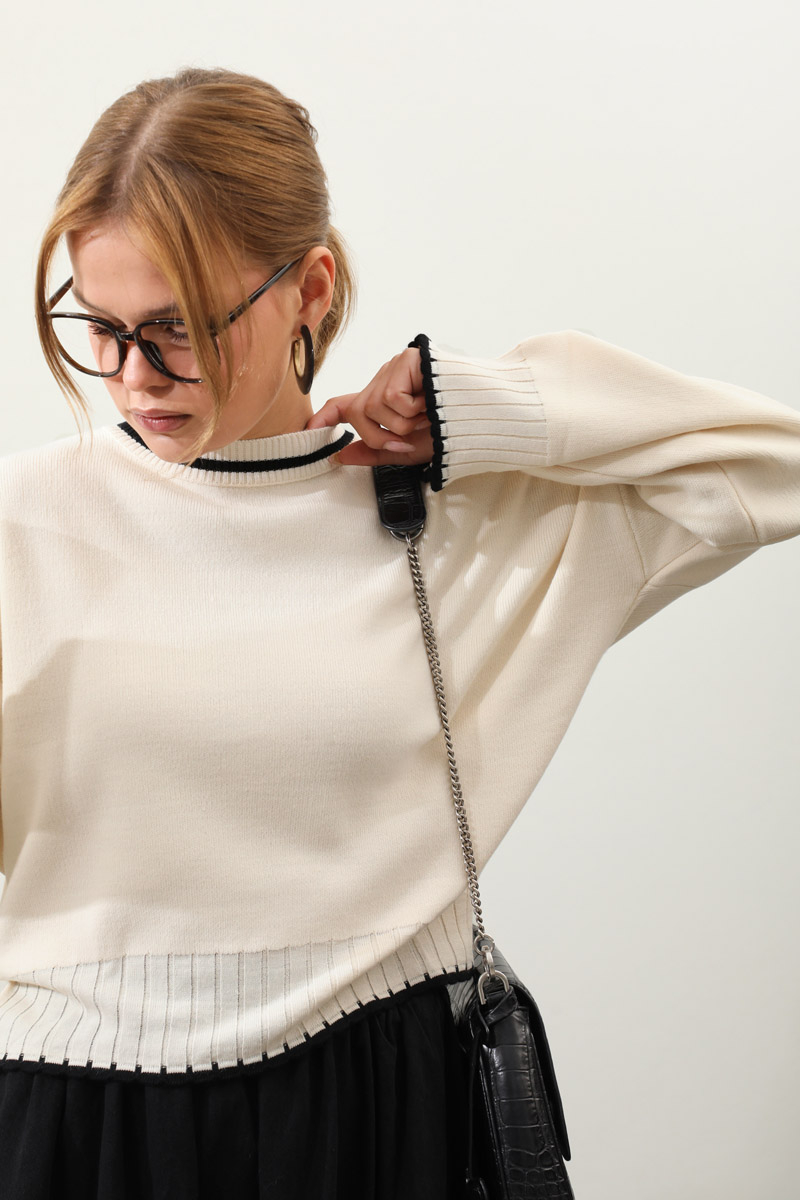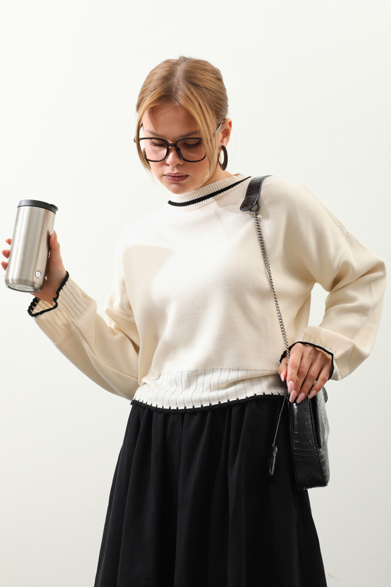 Ribanalı Kısa Kazak Krem. Bisiklet yakadır, Düşük omuzludur, manşeti ve etek uçları ribana detaylıdır. Günlük kullanım ve özel günlerinizde tercih edebilirsiniz.