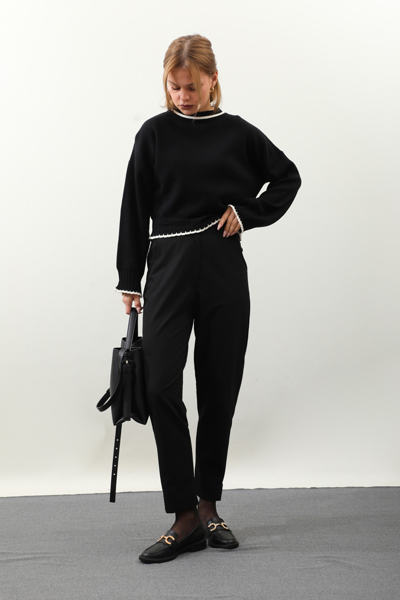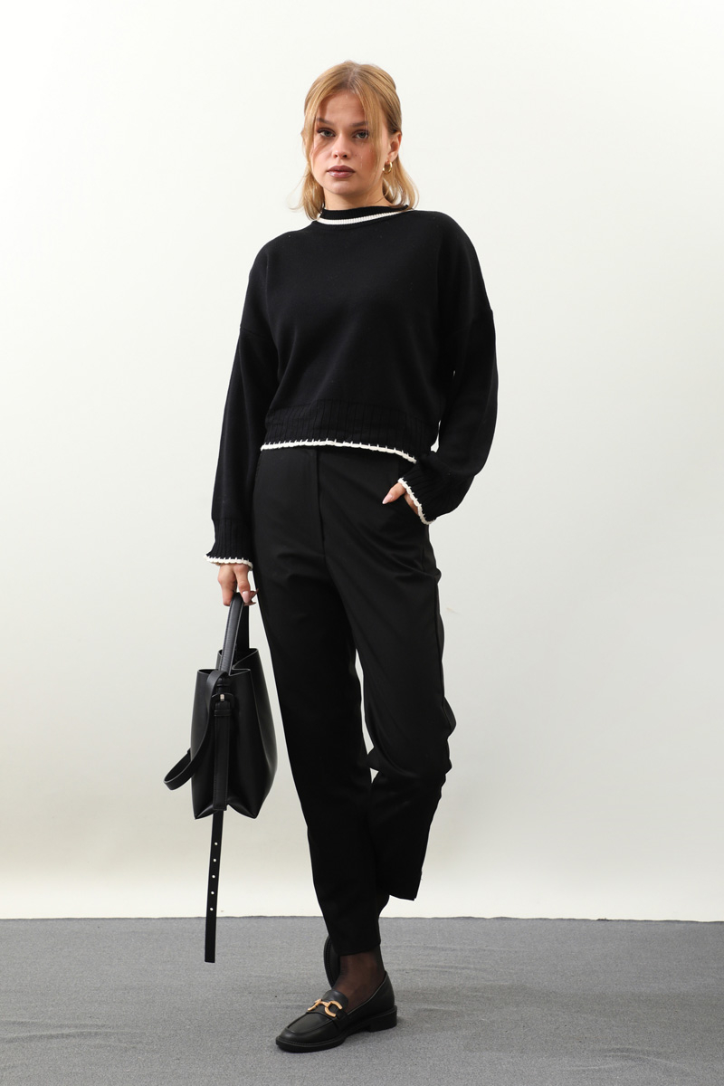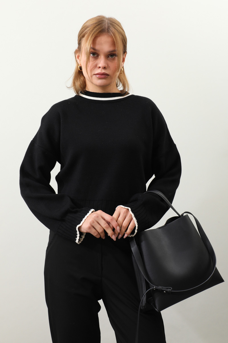 Ribanalı Kısa Kazak Siyah. Bisiklet yakadır, Düşük omuzludur, manşeti ve etek uçları ribana detaylıdır. Günlük kullanım ve özel günlerinizde tercih edebilirsiniz.