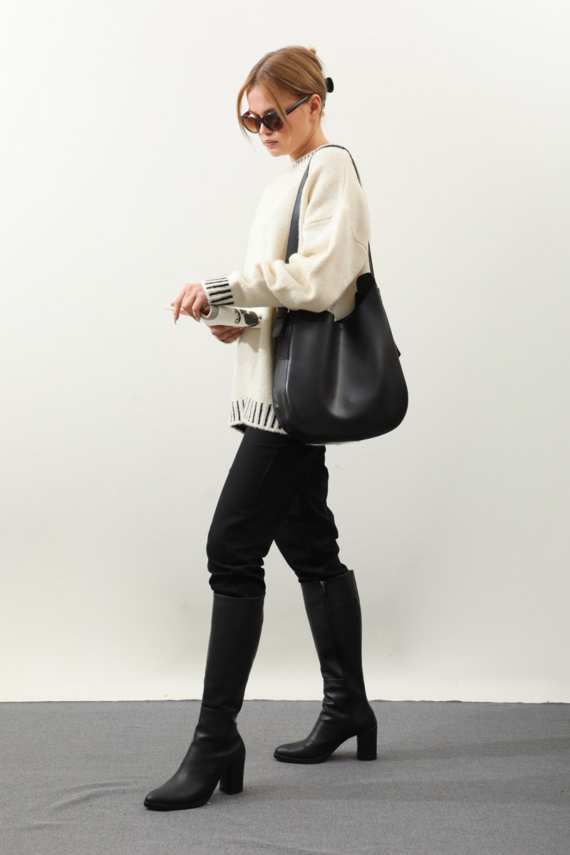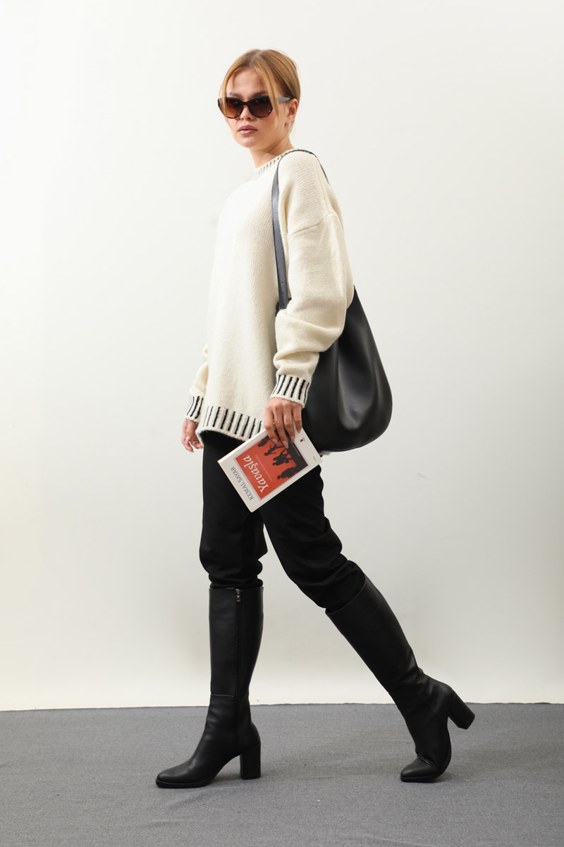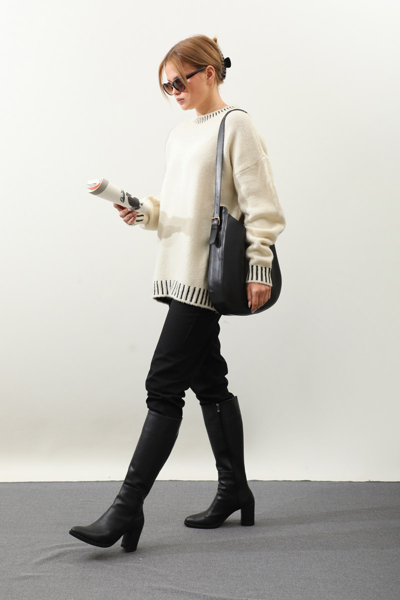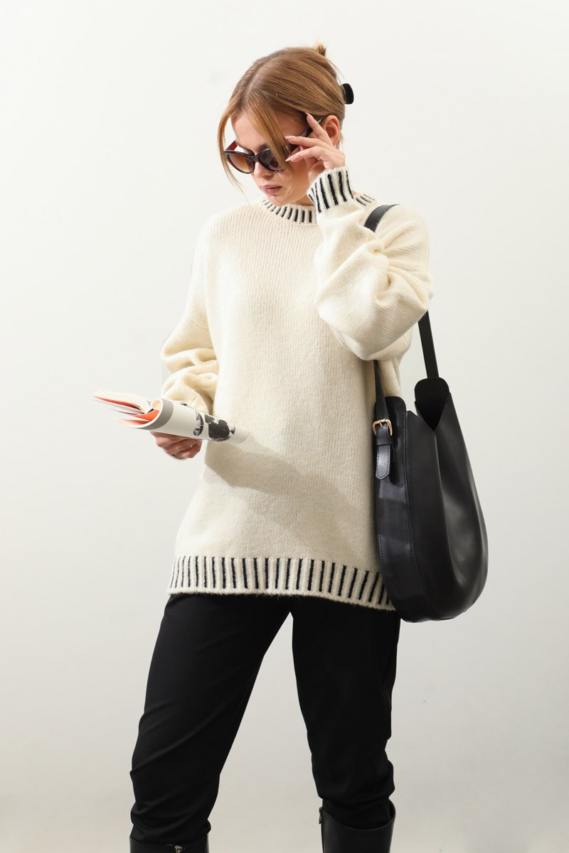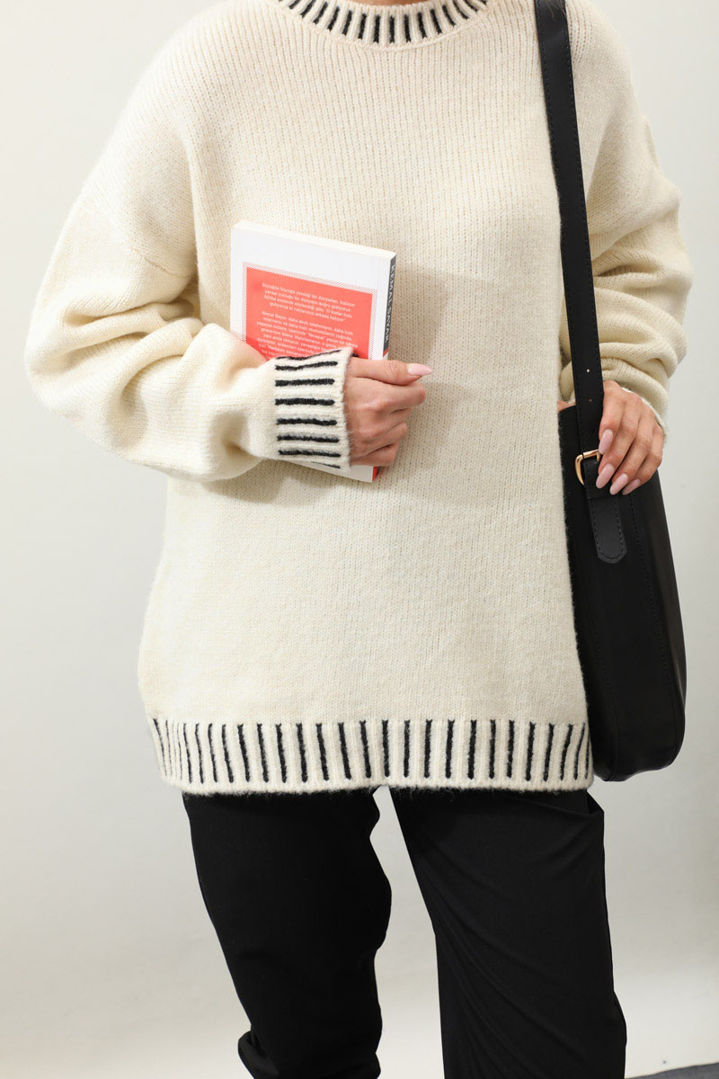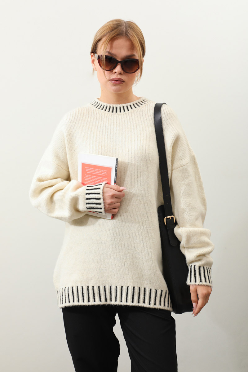 Ribanası İki Renkli Kazak Krem. Bisiklet yakadır, düşük omuzludur, manşeti ve etek ucu ribanalıdır, kalın trikodur, ribanası iki renklidir,