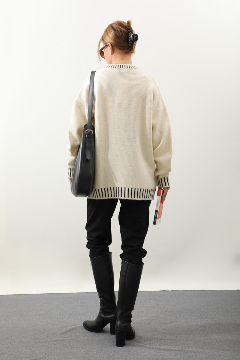 Ribanası İki Renkli Kazak Krem