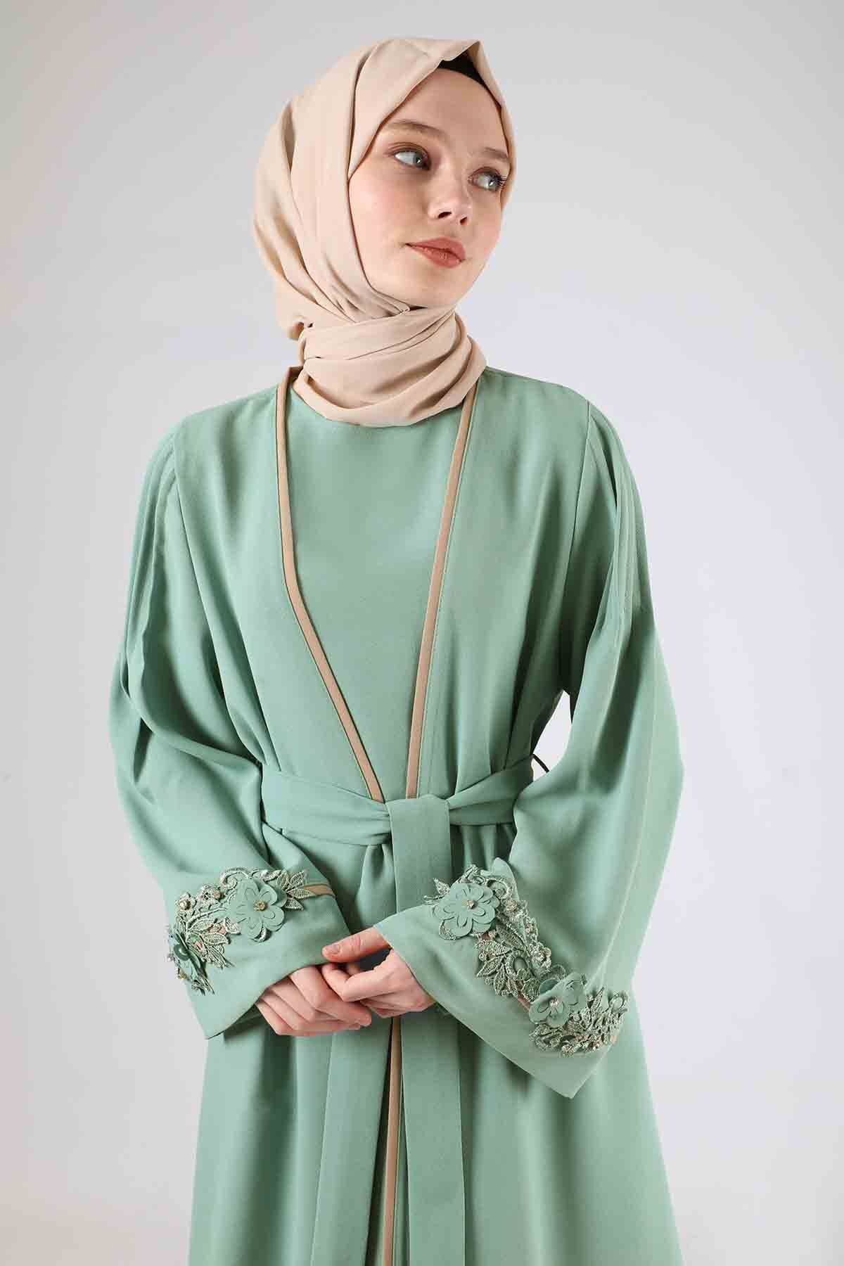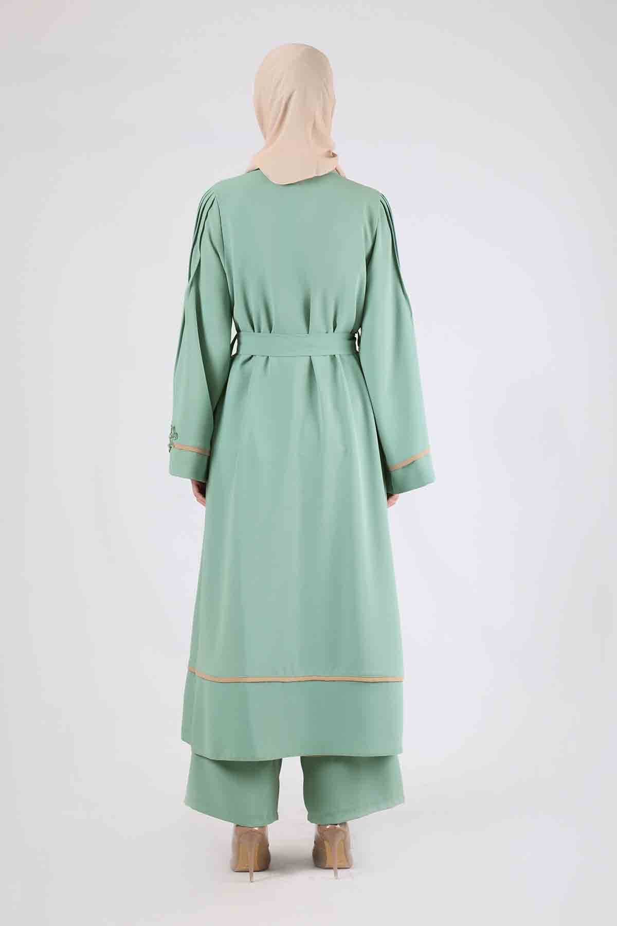 Ribbed Abaya Suit Water Green. Rib Detail, There is a floral appliqué detail on the cuff. Trousers have elastic waist. Sold as a set of three.
