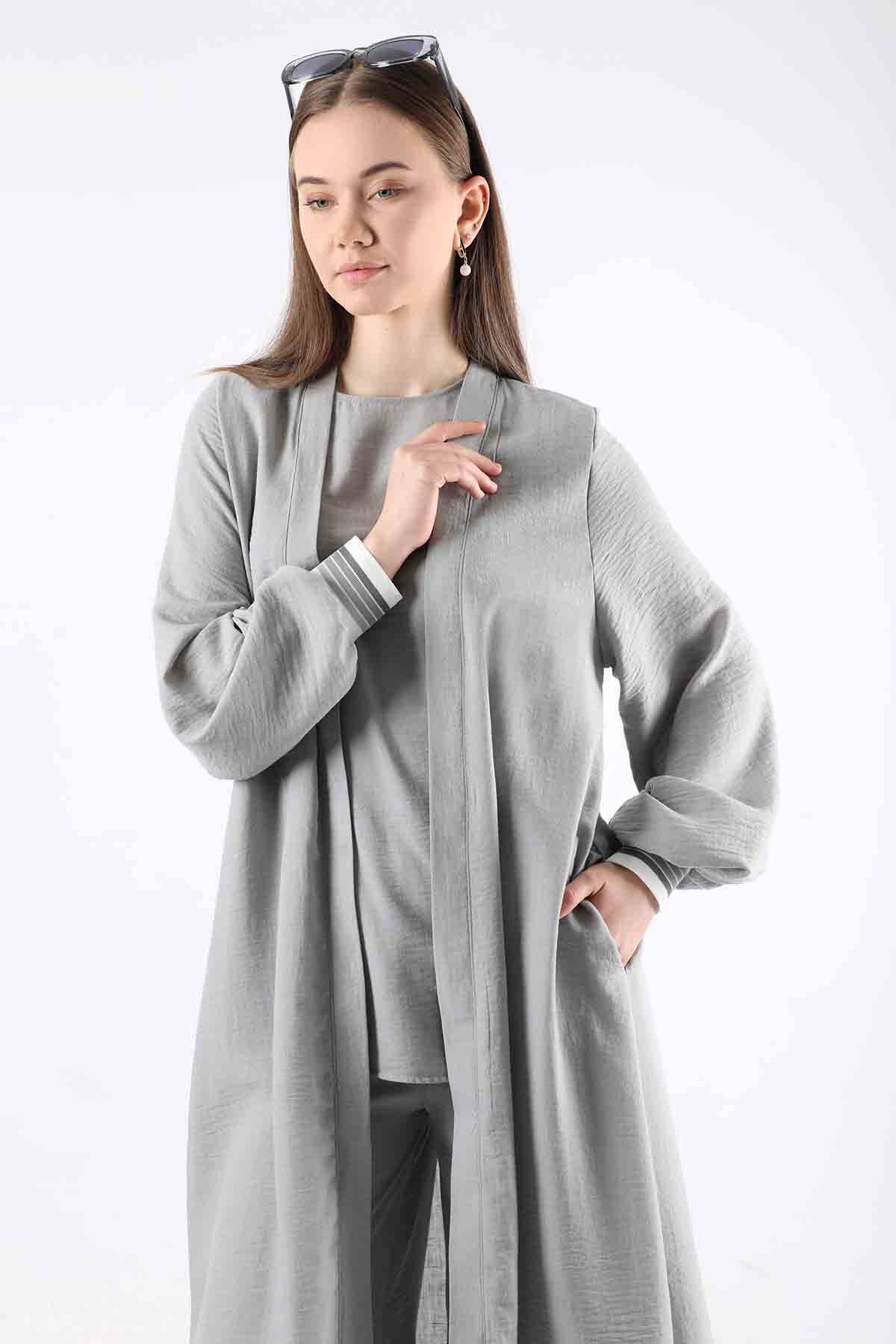 Ribbed Abaya Suit Gray. Abaya Cuff and Front body start are ribbed. The blouse has a crew neck. The trousers are wide leg and elastic. It has pockets. It is the favorite product of the new season.