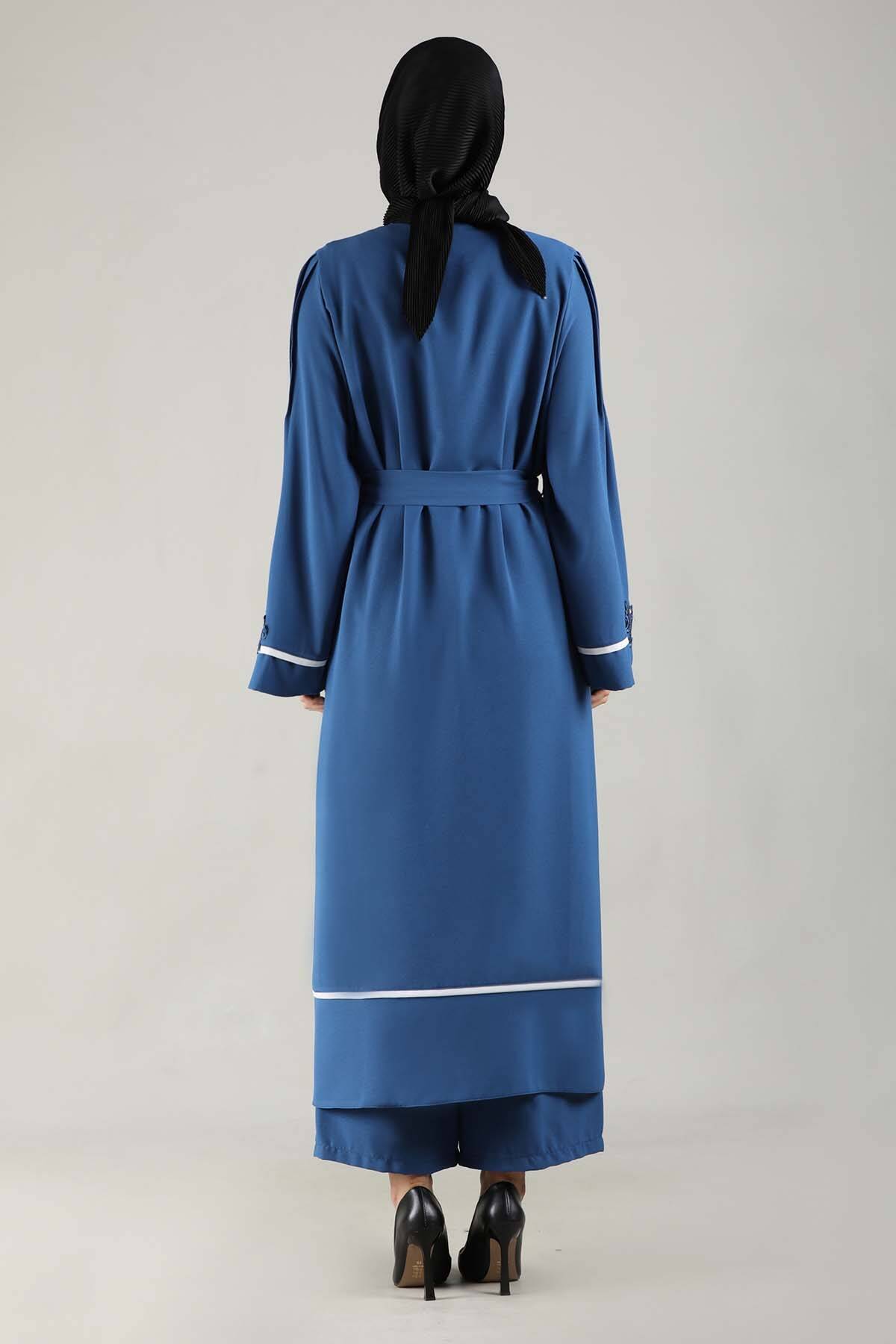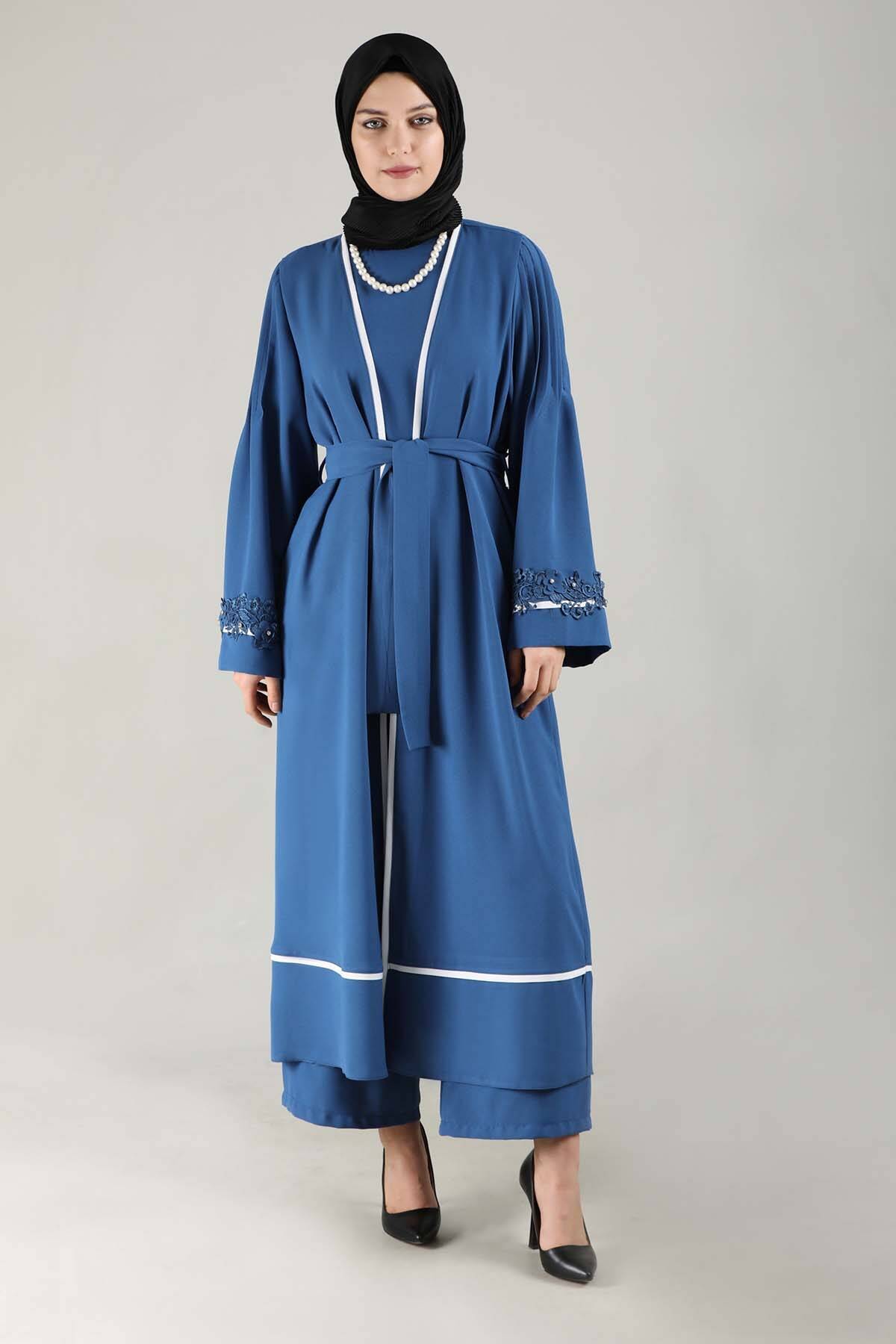 Ribbed Abaya Suit İndigo. Rib Detail, There is a floral appliqué detail on the cuff. Sold as a set of three.