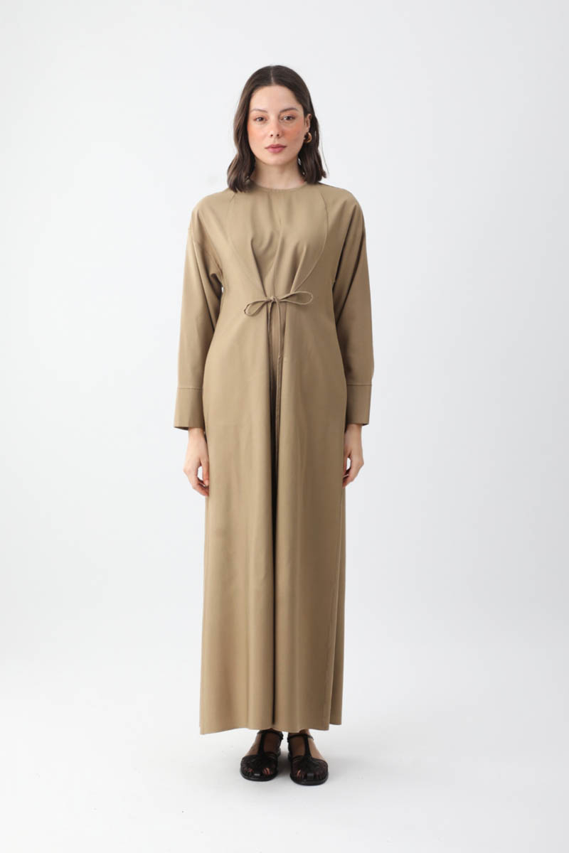 Features a crew neckline, front cup seam detail, ribbon tie detail, long sleeves with thick cuffs, side pockets, and is unlined. Suitable for both daily wear and special occasions.