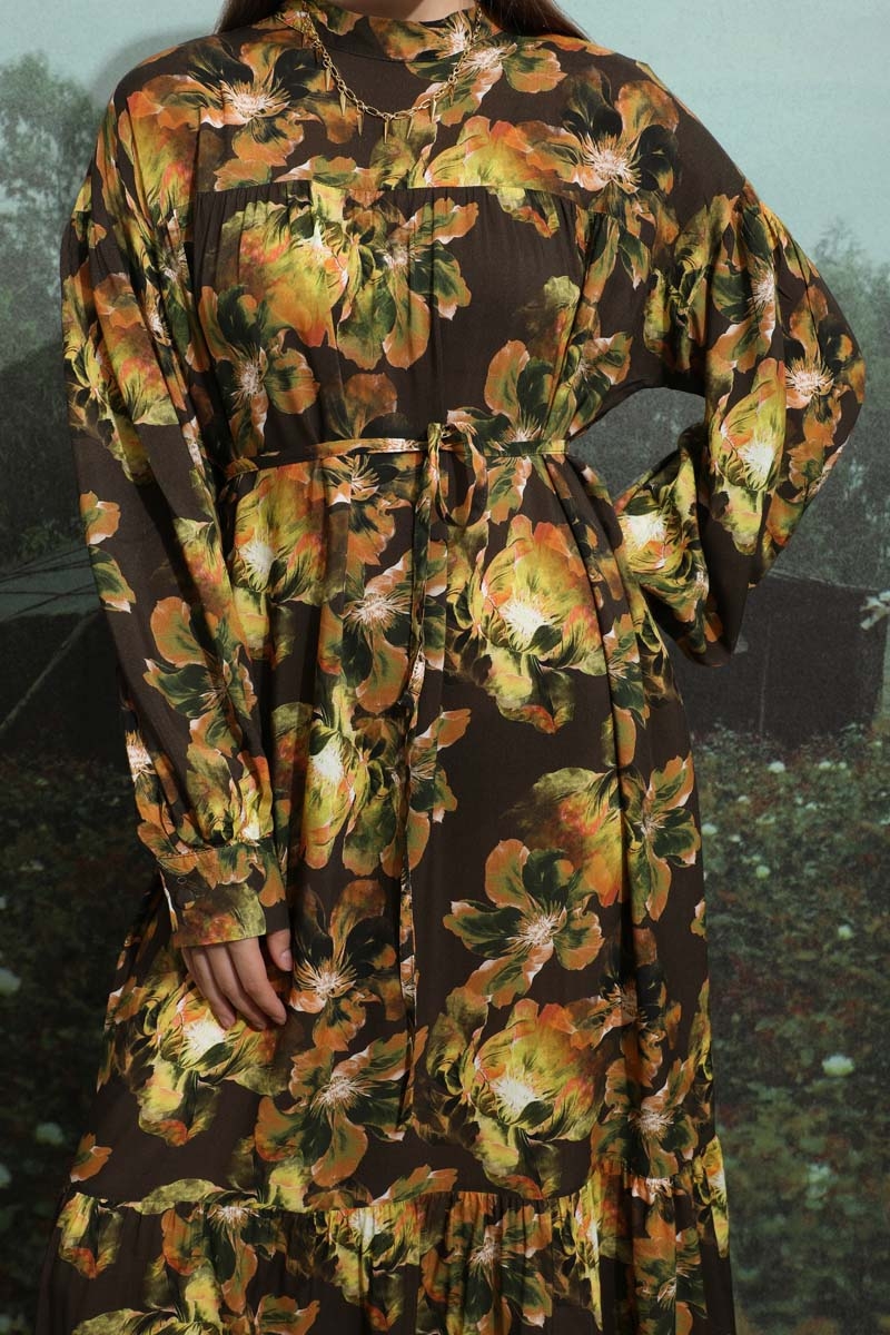Robalı Desenli Elbise Kahverengi