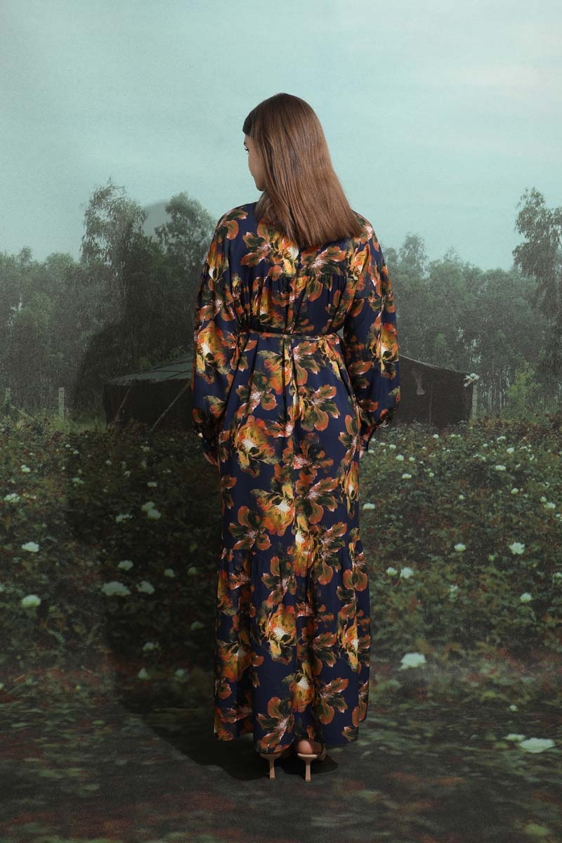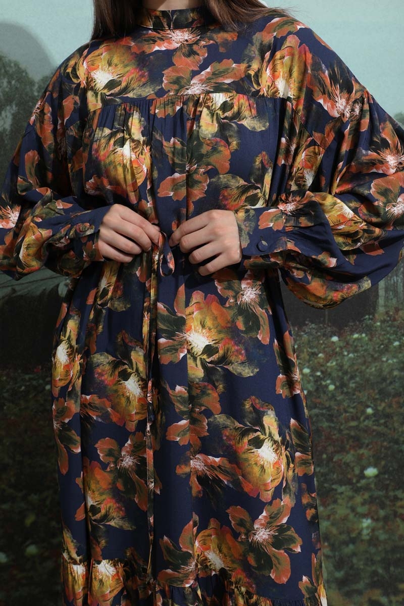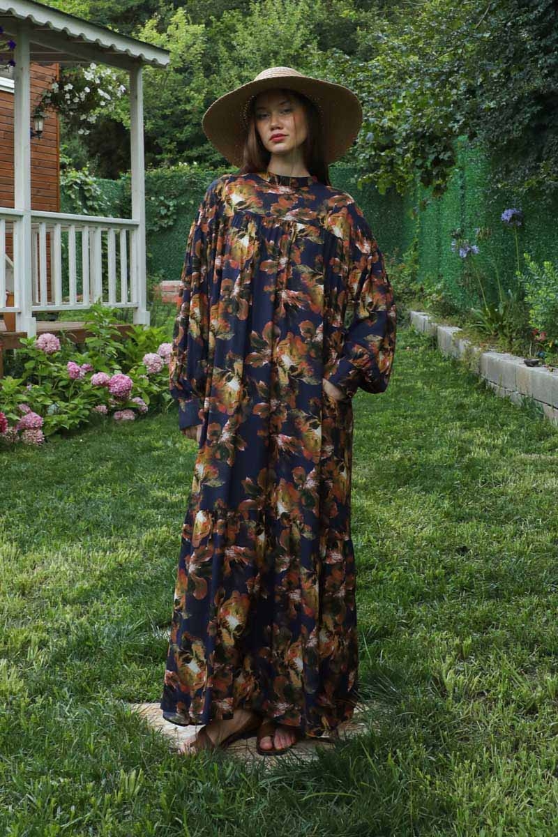 Robalı Desenli Elbise Lacivert. Hakim yakalıdır, kuşaklıdır, arkadan fermuarlıdır, astarsızdır, yandan ceplidir, robası ve etek ucu büzgülüdür, günlük kullanıma uygundur.