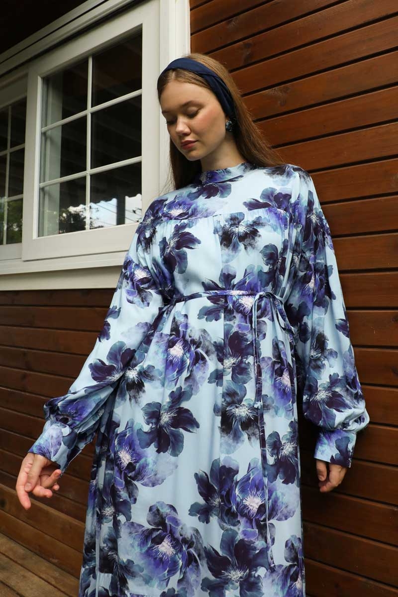 Robalı Desenli Elbise Mavi. Hakim yakalıdır, kuşaklıdır, arkadan fermuarlıdır, astarsızdır, yandan ceplidir, robası ve etek ucu büzgülüdür, günlük kullanıma uygundur.