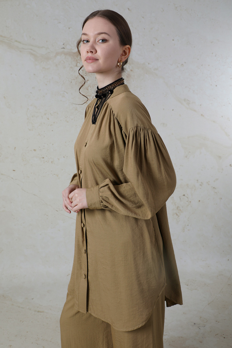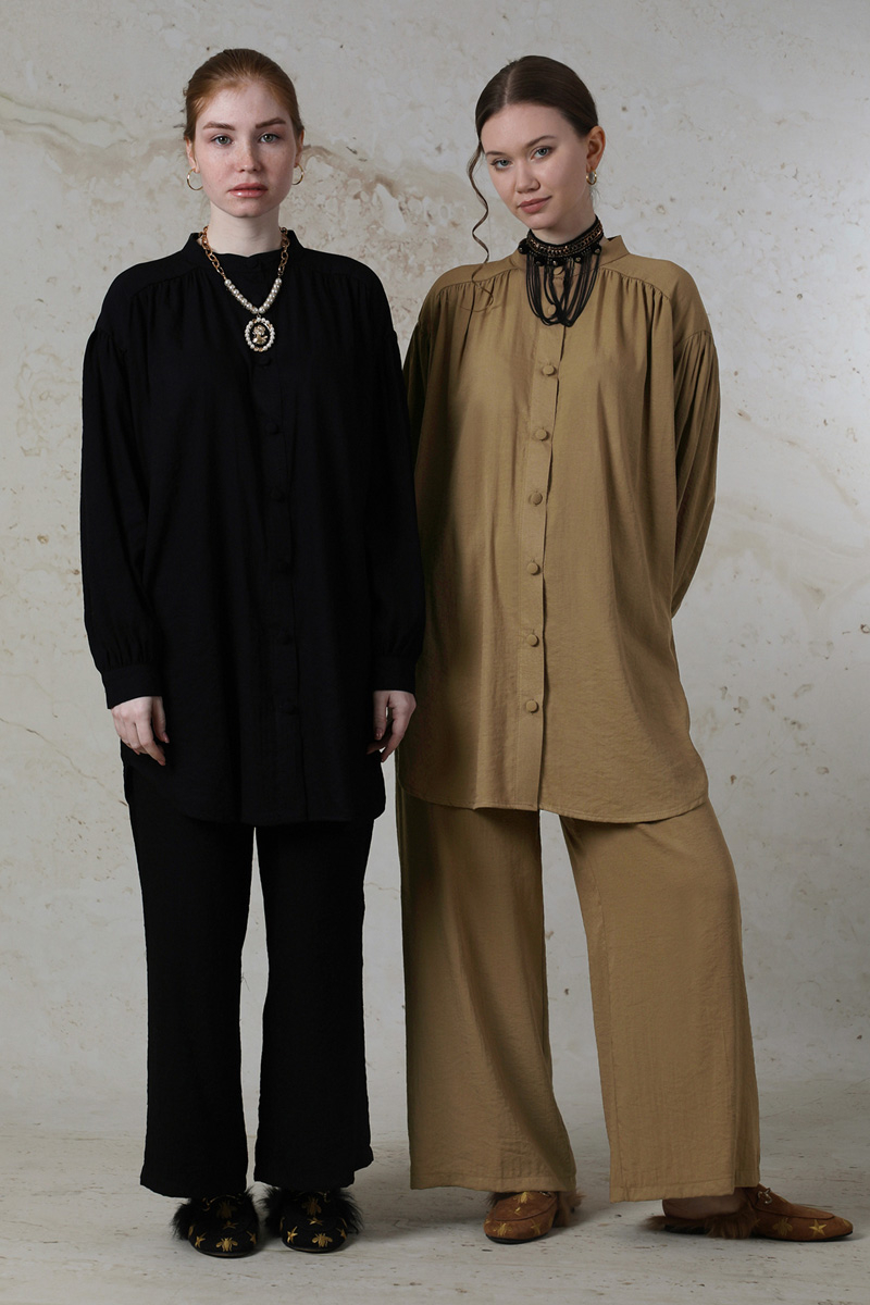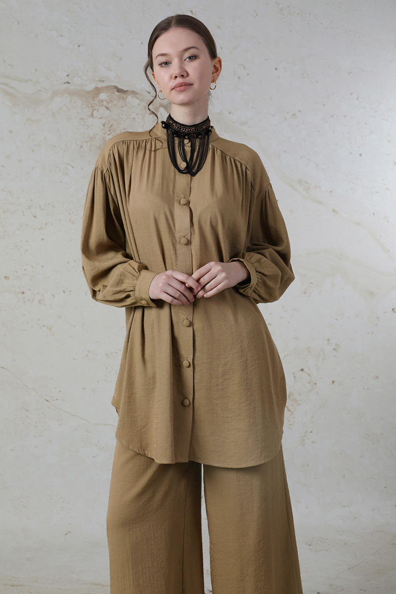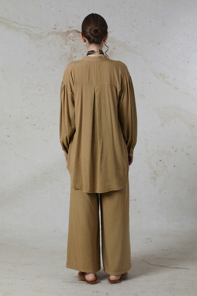 Salaş Pantolon Takım Camel. Hakim yakalıdır. Düşük kolludur. Manşetli ve kolları büzgü detaylıdır. Robası büzgülüdür. Önden düğmelidir. Pantolon beli lastiklidir. Yan cep detaylıdır. Günlük kullanım ve özel günlerinizde tercih edebilirsiniz.