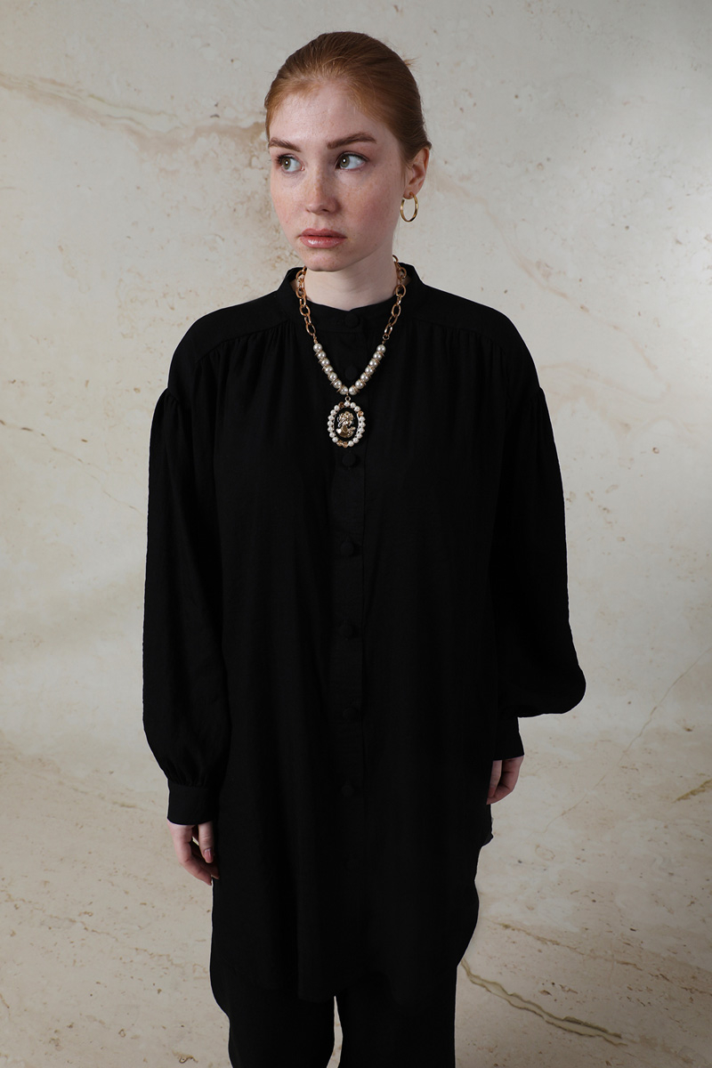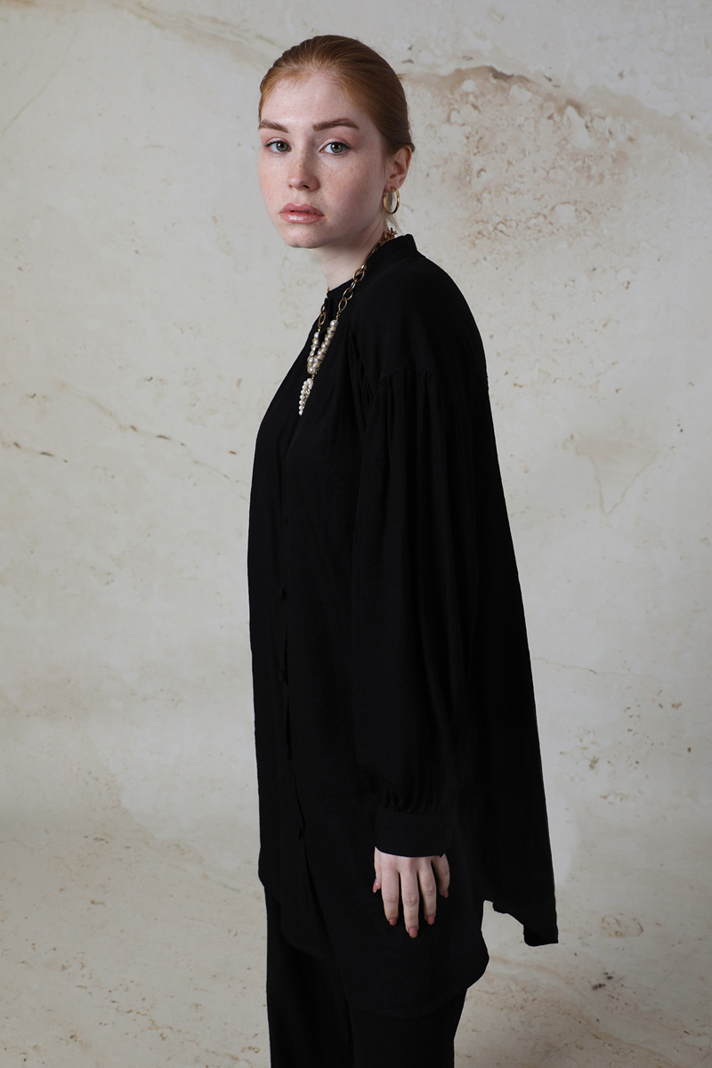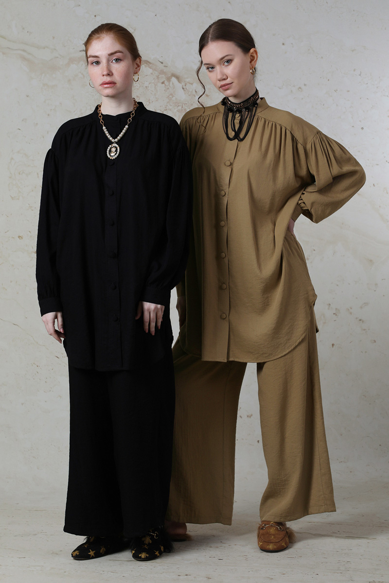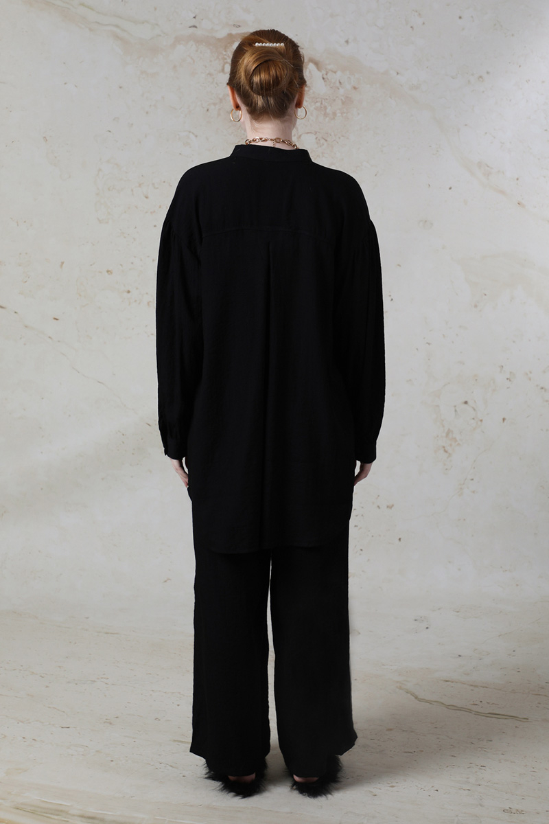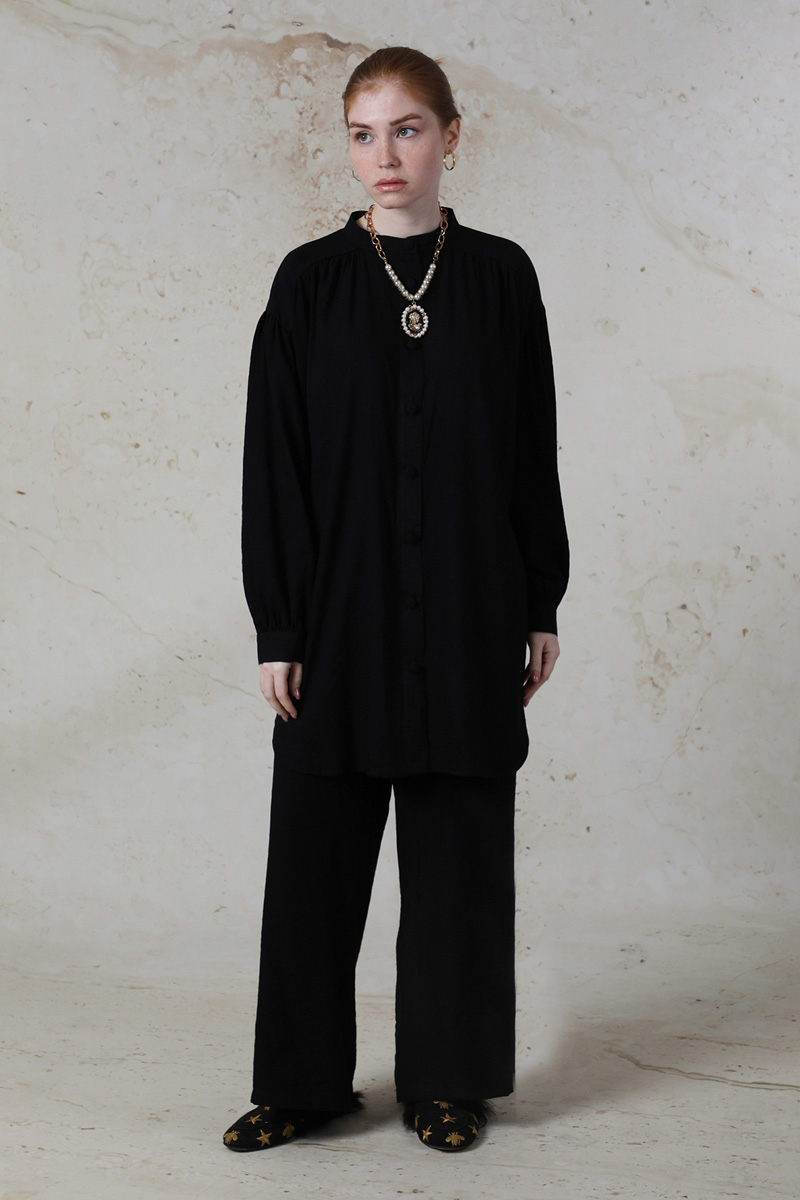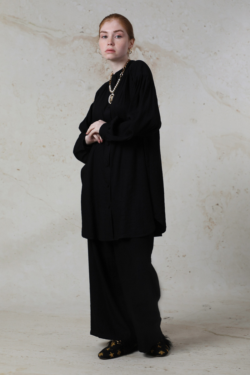 Salaş Pantolon Takım Siyah. Hakim yakalıdır. Düşük kolludur. Manşetli ve kolları büzgü detaylıdır. Robası büzgülüdür. Önden düğmelidir. Pantolon beli lastiklidir. Yan cep detaylıdır. Günlük kullanım ve özel günlerinizde tercih edebilirsiniz.