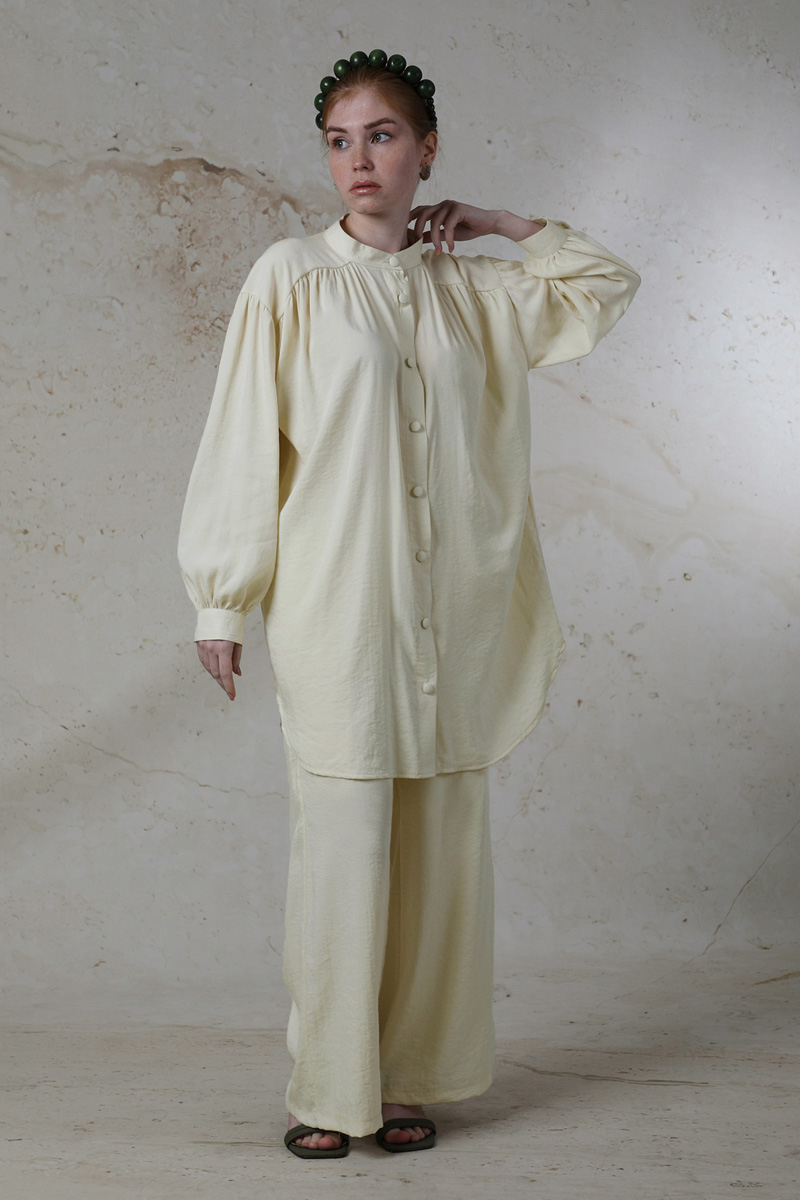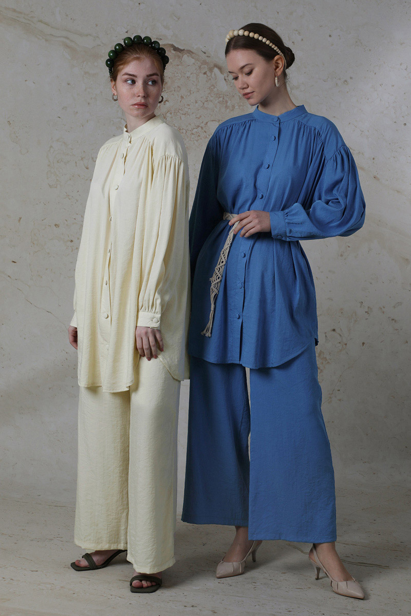 Salaş Pantolon Takım Taş. Hakim yakalıdır. Düşük kolludur. Manşetli ve kolları büzgü detaylıdır. Robası büzgülüdür. Önden düğmelidir. Pantolon beli lastiklidir. Yan cep detaylıdır. Günlük kullanım ve özel günlerinizde tercih edebilirsiniz.