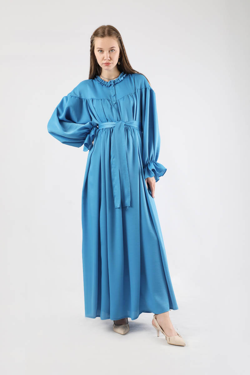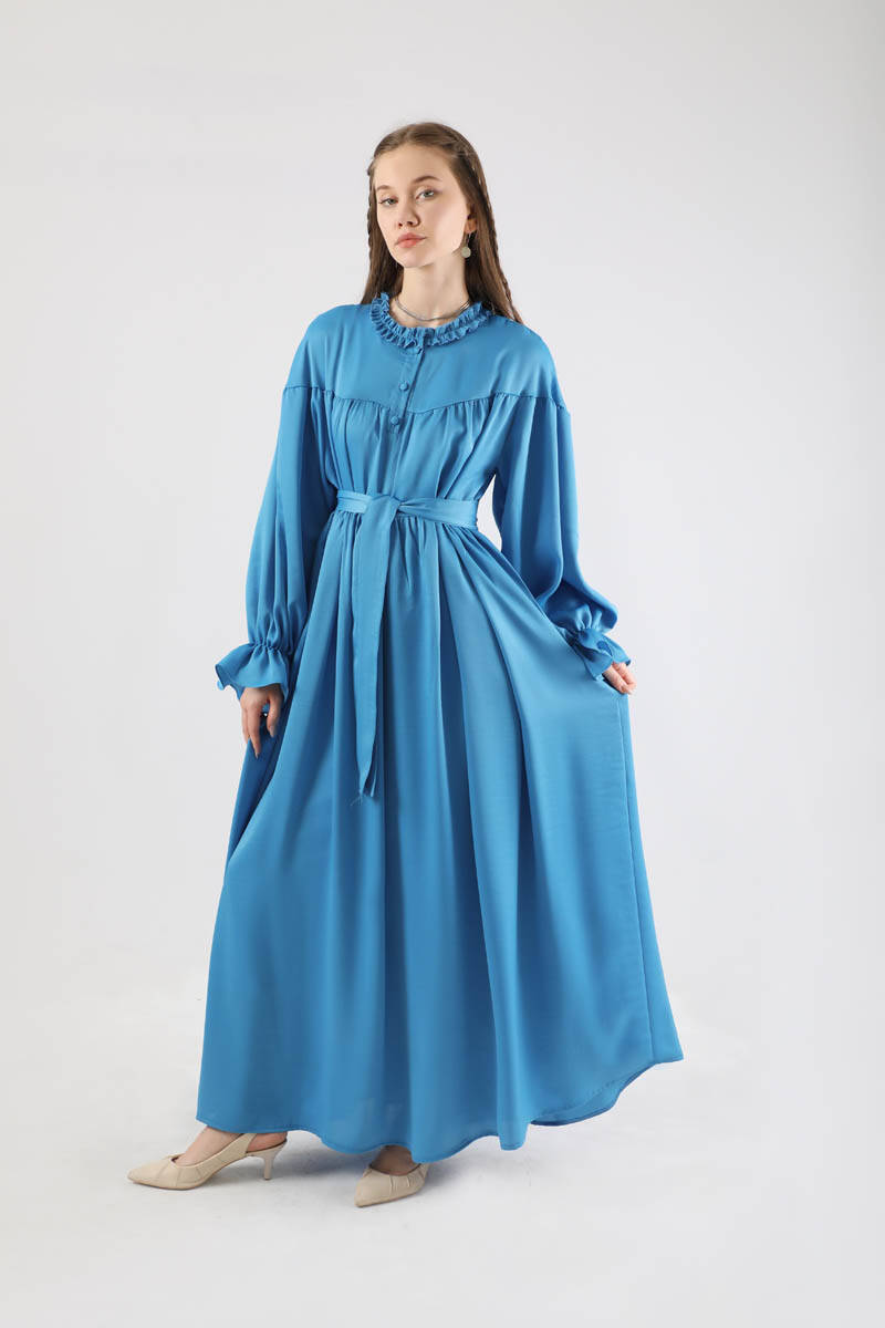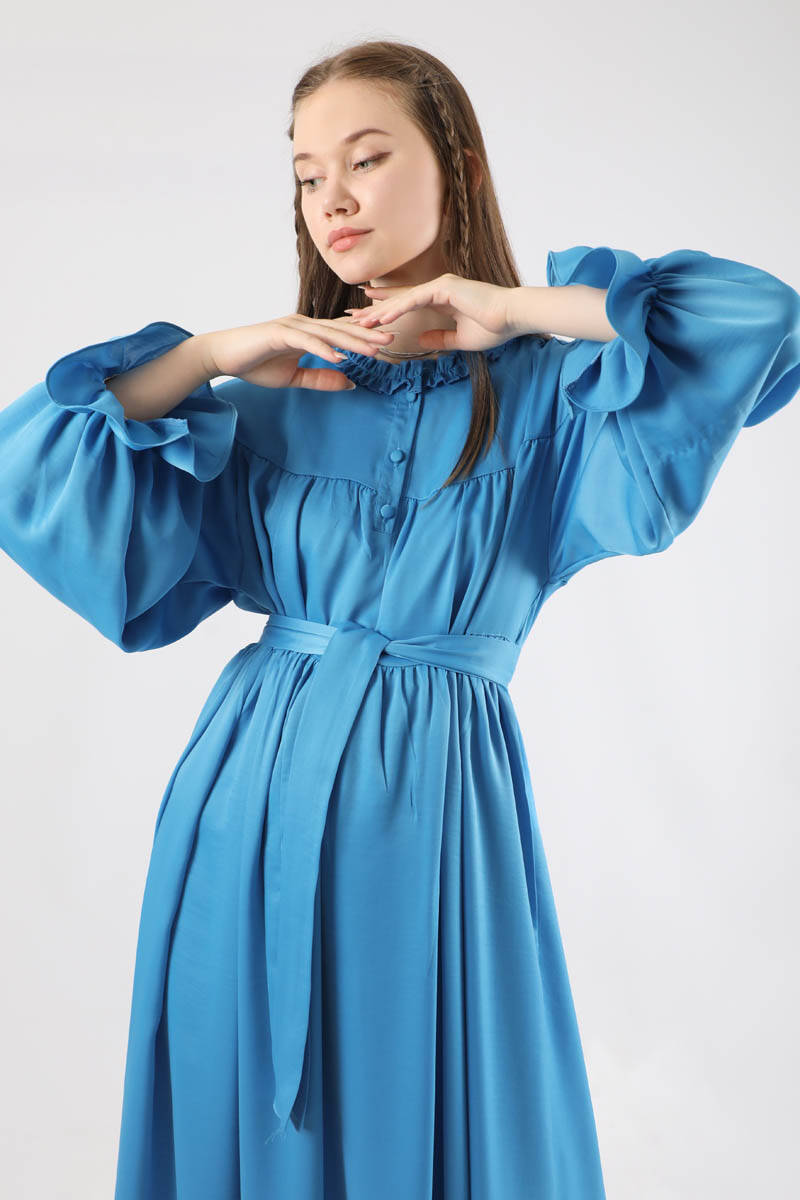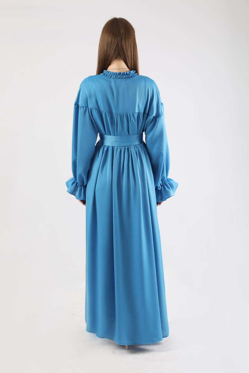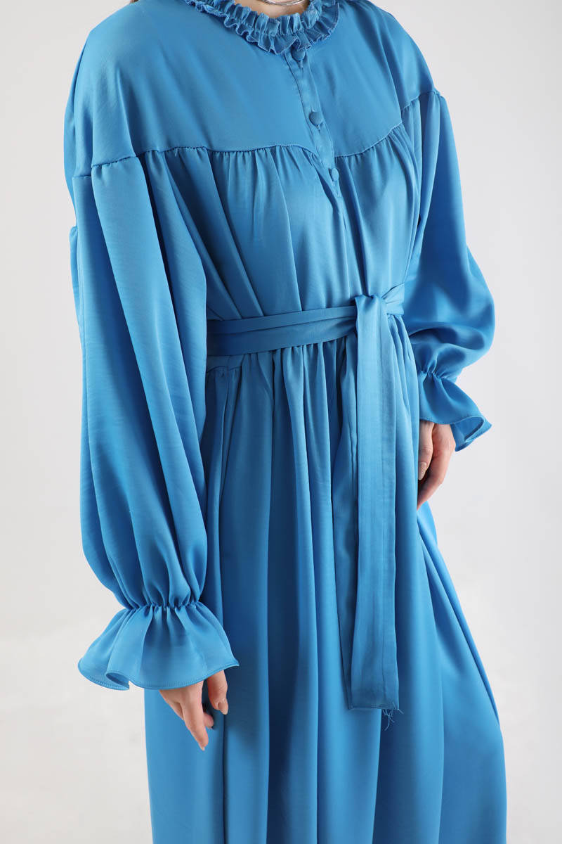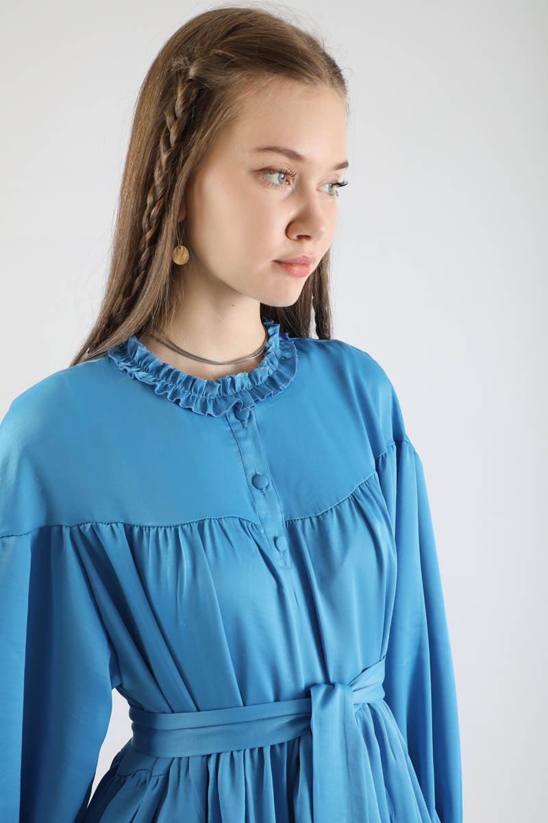 Robalı Saten Elbise Mavi. Yakası fırfır detaylıdır. Robalı büzgü detaylıdır. Manşeti lastik volanlıdır. Belden kesik detaylıdır. Beli kuşaklıdır. Kaplama düğmelidir. Astarsızdır. Günlük kullanım ve özel günlerinizde tercih edebilirsiniz.