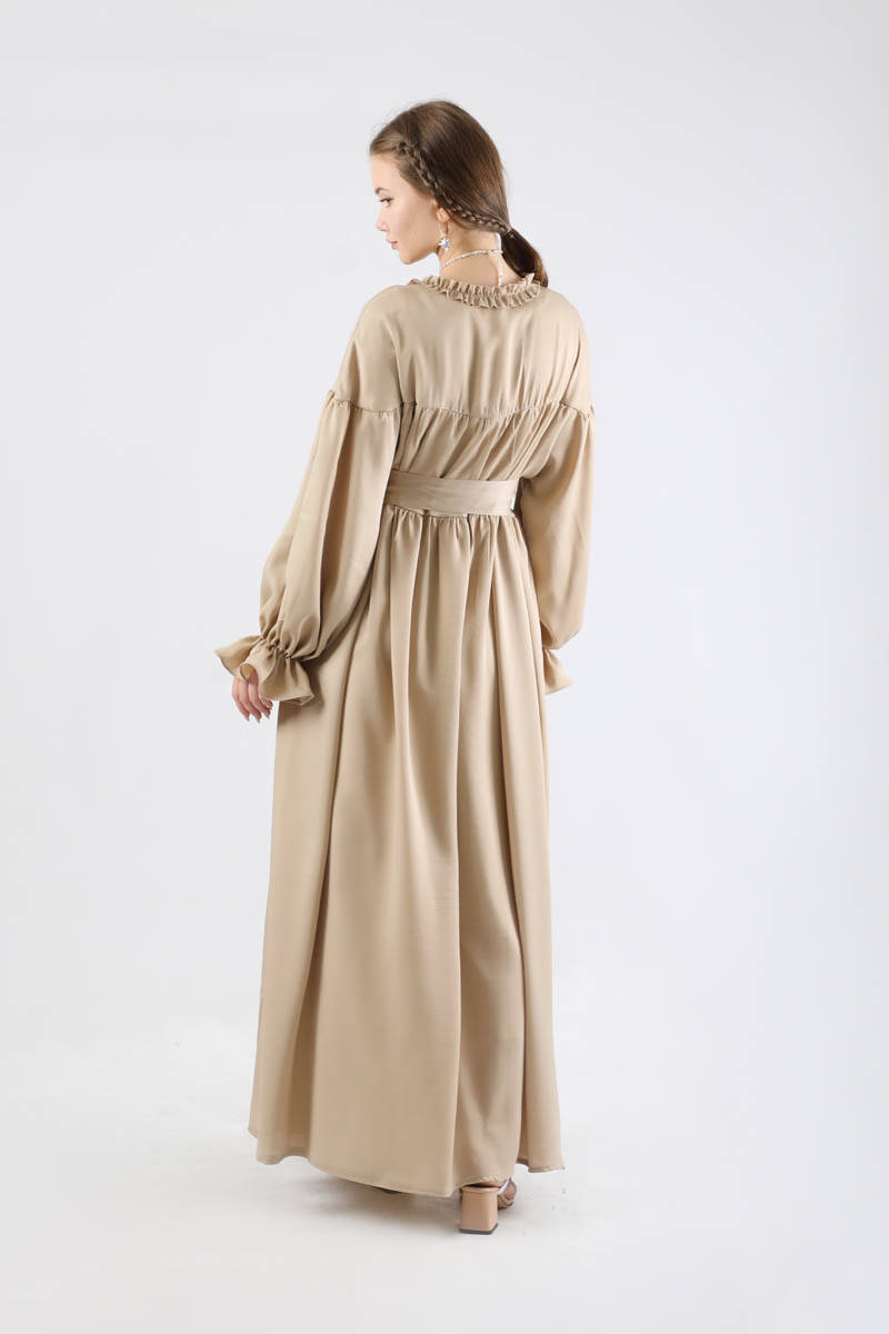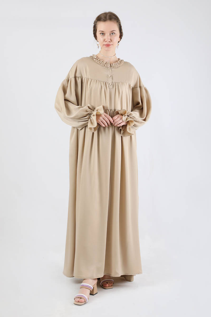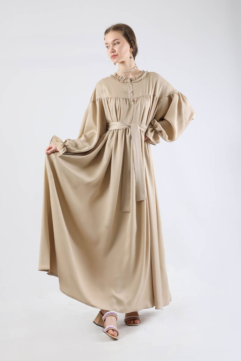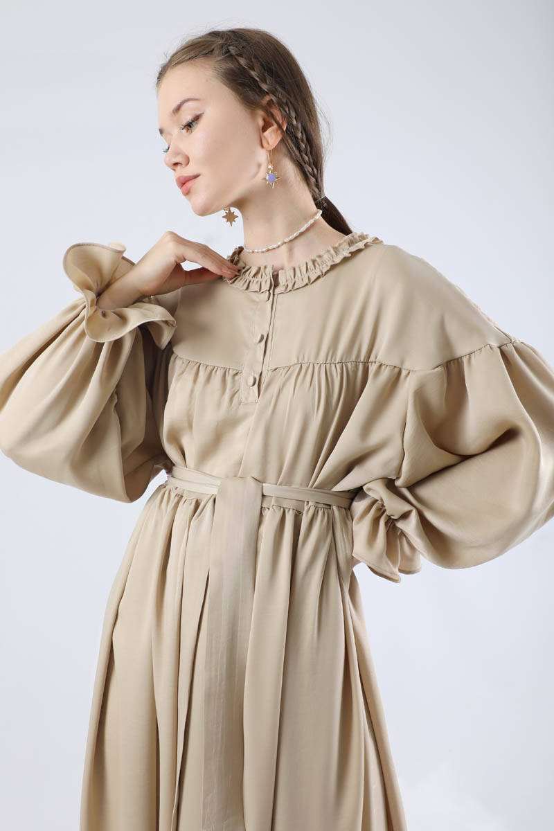 Robalı Saten Elbise Taş. Yakası fırfır detaylıdır. Robalı büzgü detaylıdır. Manşeti lastik volanlıdır. Belden kesik detaylıdır. Beli kuşaklıdır. Kaplama düğmelidir. Astarsızdır. Günlük kullanım ve özel günlerinizde tercih edebilirsiniz.