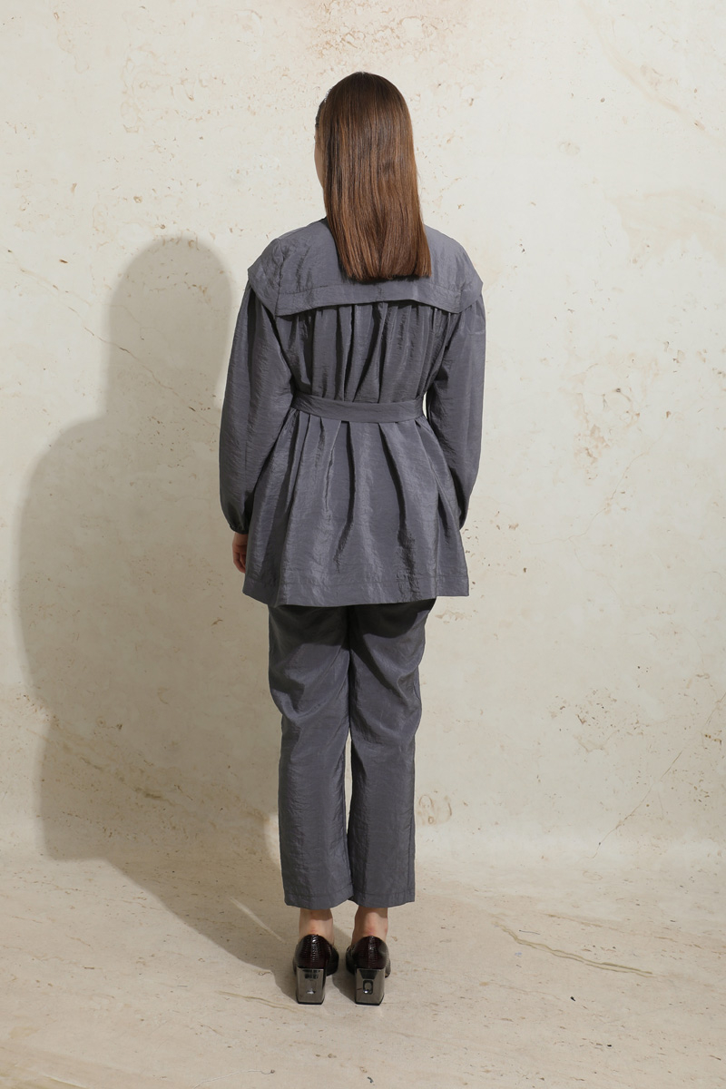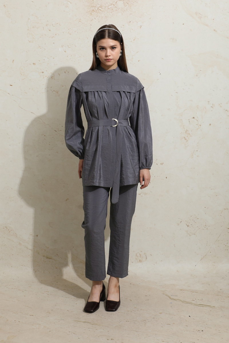 Robası Detaylı Tunik Takım Füme. Robası parçalıdır, büzgülü ve üzerine dökülen parçası bulunmaktadır, önden tam boy gizli düğmelidir, kuşaklıdır, kuşağı D tokalıdır. Pantolon beli lastiklidir, düz paçadır.