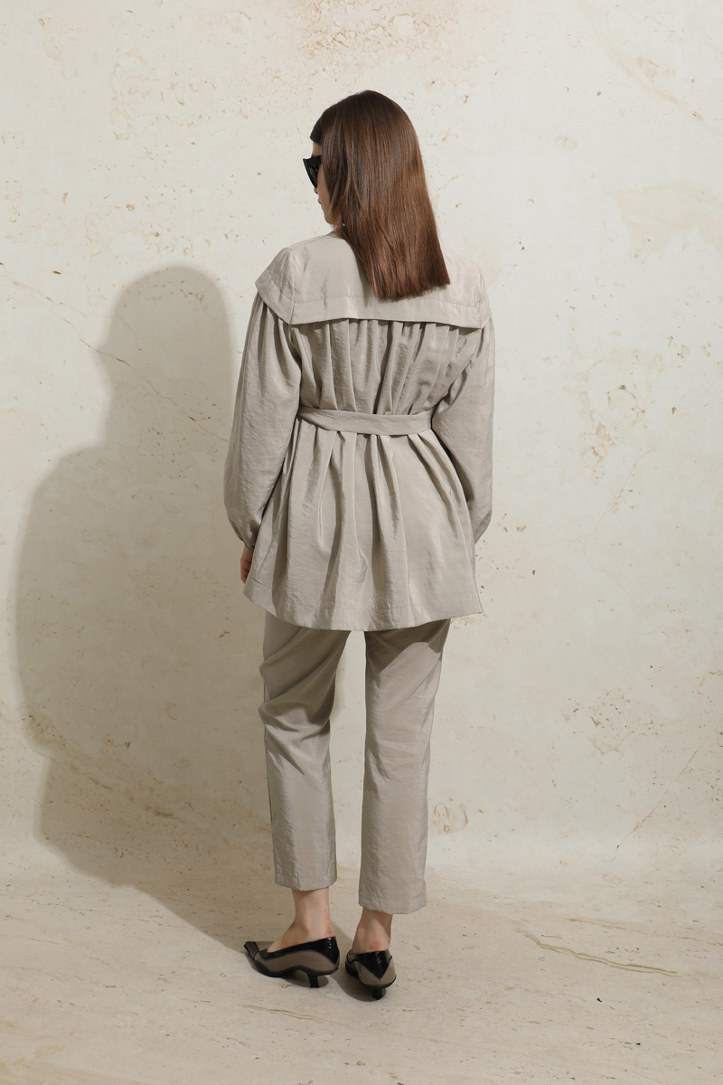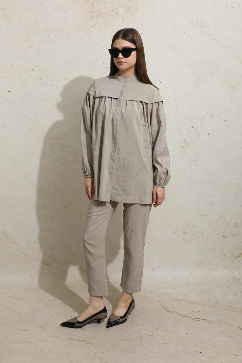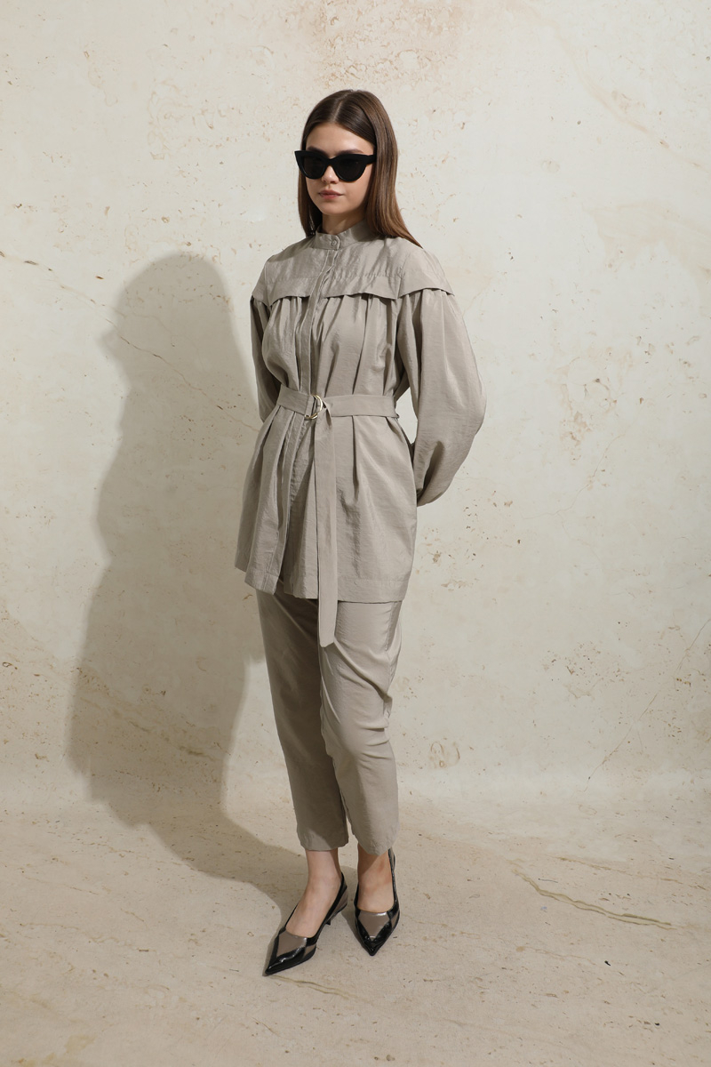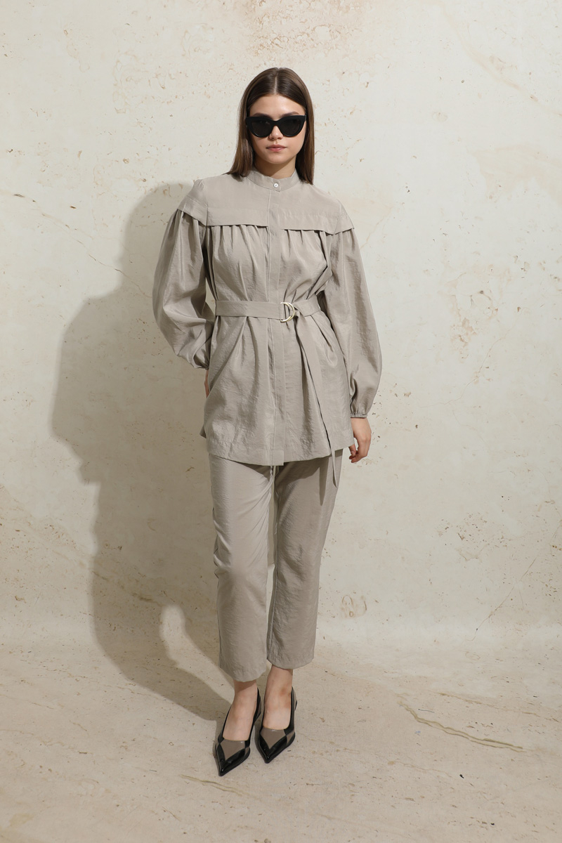Robası Detaylı Tunik Takım Taş. Robası parçalıdır, büzgülü ve üzerine dökülen parçası bulunmaktadır, önden tam boy gizli düğmelidir, kuşaklıdır, kuşağı D tokalıdır. Pantolon beli lastiklidir, düz paçadır.