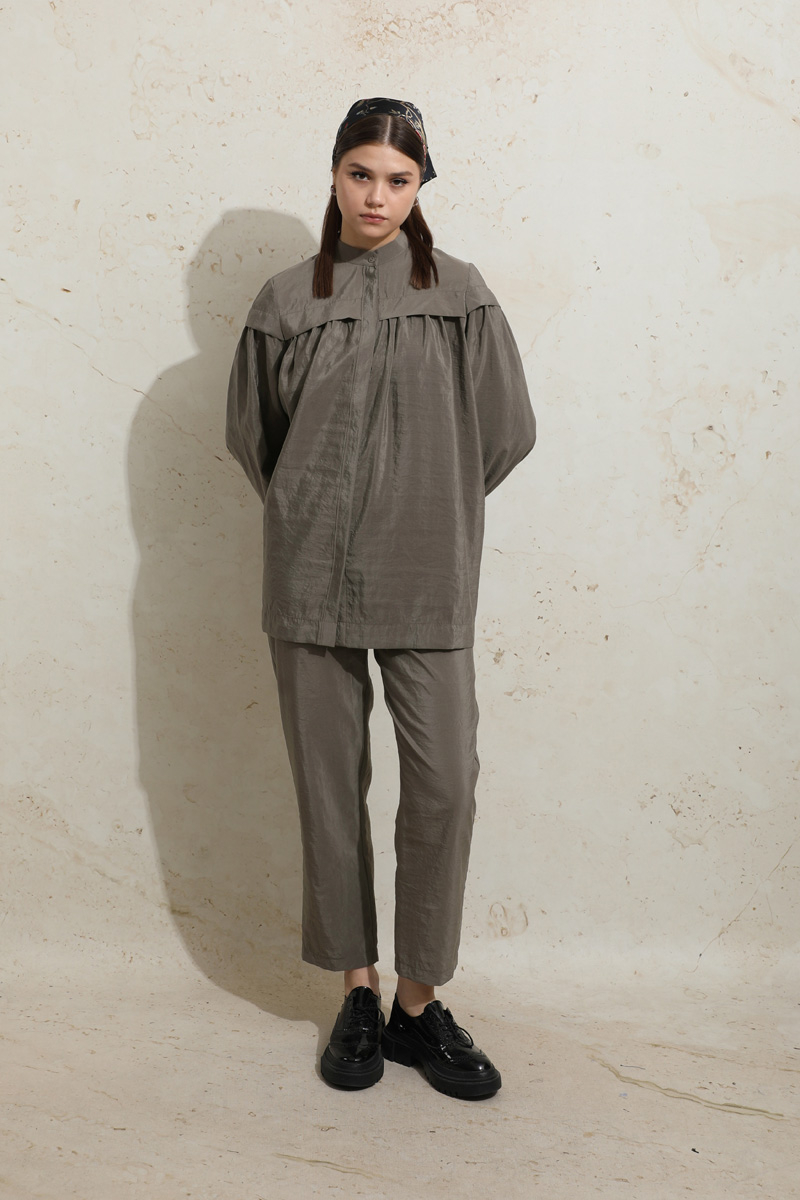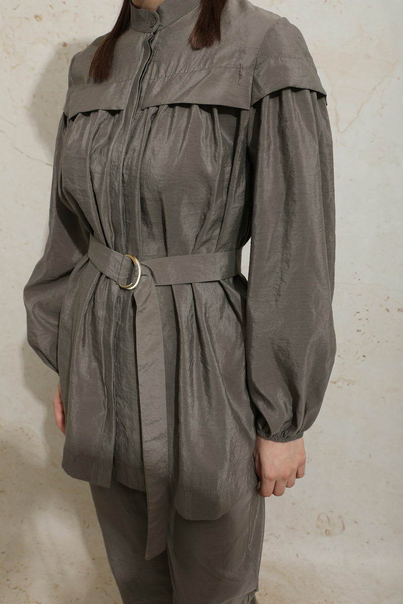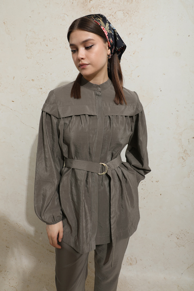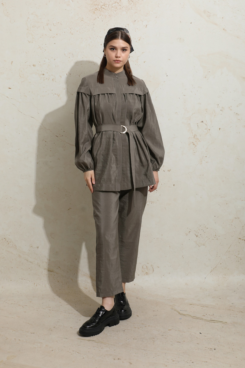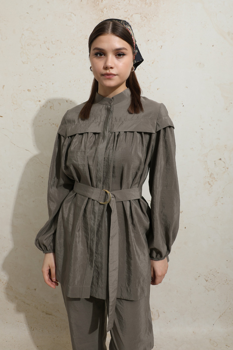 Robası Detaylı Tunik Takım Toprak. Robası parçalıdır, büzgülü ve üzerine dökülen parçası bulunmaktadır, önden tam boy gizli düğmelidir, kuşaklıdır, kuşağı D tokalıdır. Pantolon beli lastiklidir, düz paçadır.