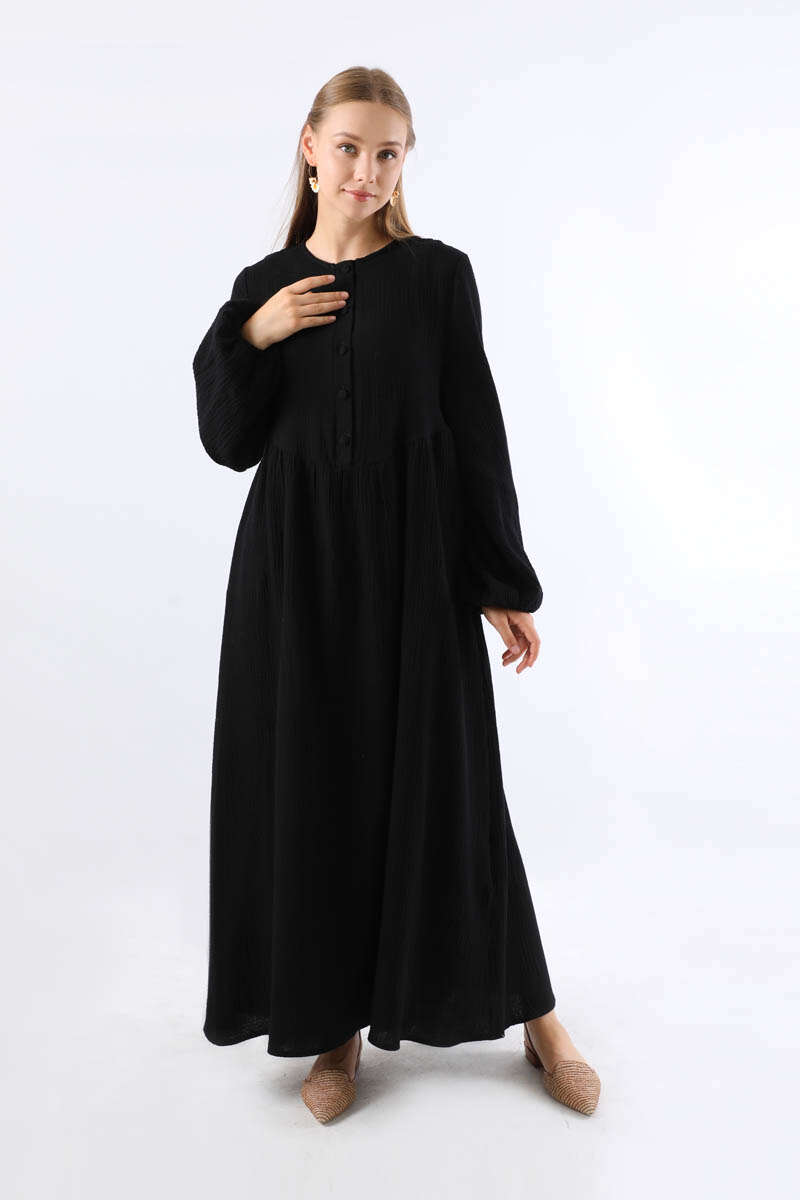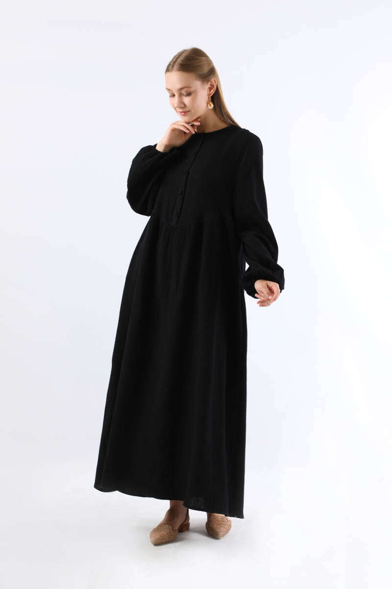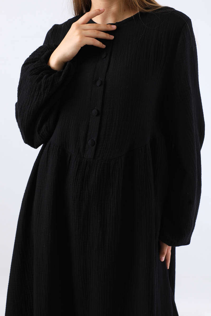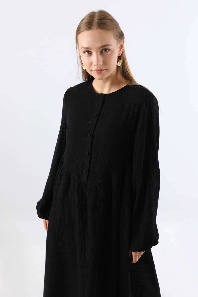 Robası Düğmeli Müslin Elbise Siyah