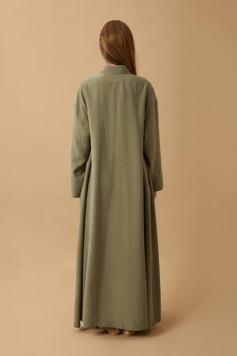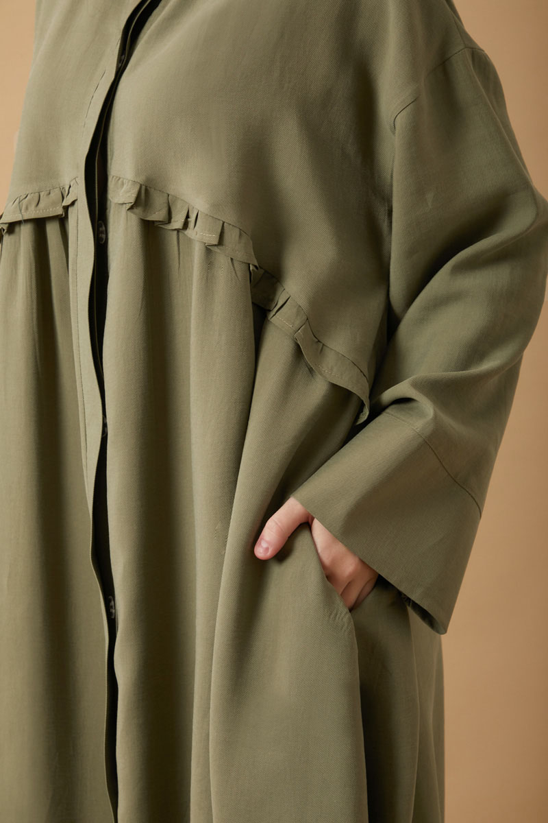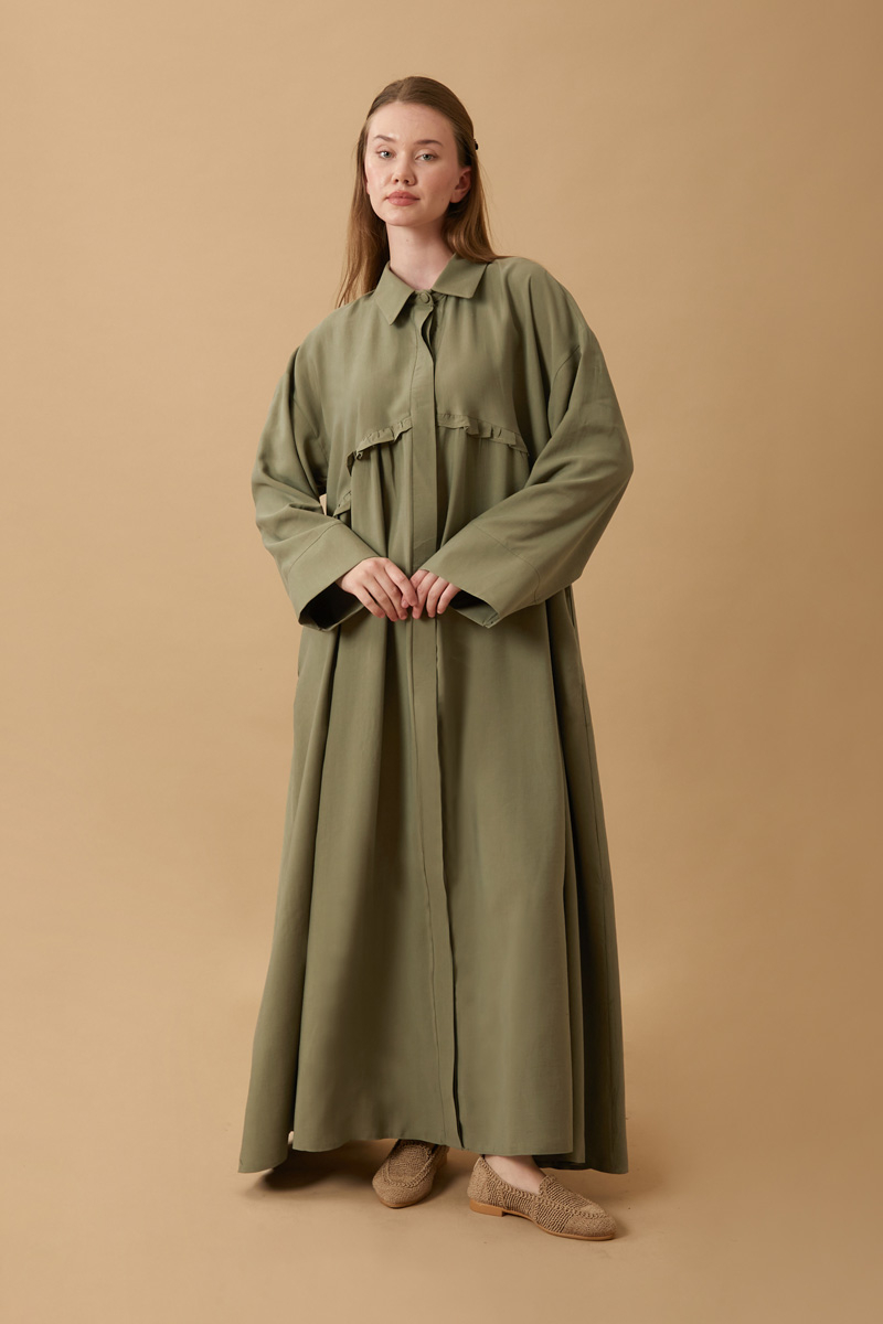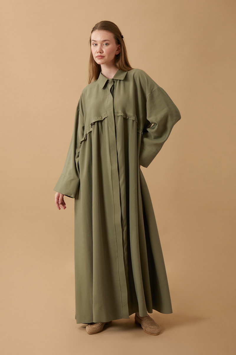 Robası Fırfır Detaylı Elbise Haki, tencel kumaştan üretilen bu dökümlü gömlek elbise, yumuşak dokusu ve nefes alabilen yapısıyla gün boyu konfor sunar. Doğal liflerdenelde edilen Tencel kumaşı sayesinde hem cildinize hem doğaya dostbir tercih yapabilirsiniz