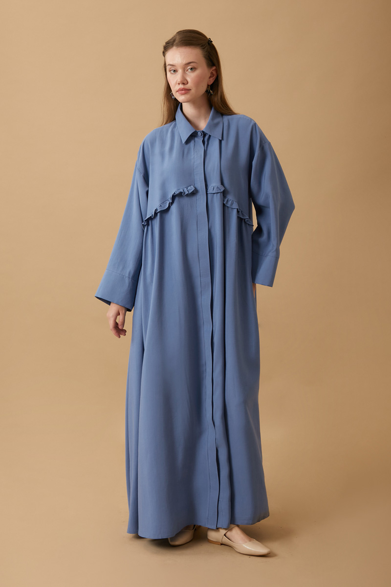 Robası Fırfır Detaylı Elbise İndigo, tencel kumaştan üretilen bu dökümlü gömlek elbise, yumuşak dokusu ve nefes alabilen yapısıyla gün boyu konfor sunar. Doğal liflerden elde edilen Tencel kumaşı sayesinde hem cildinize hem doğaya dost bir tercih yapabilirsiniz