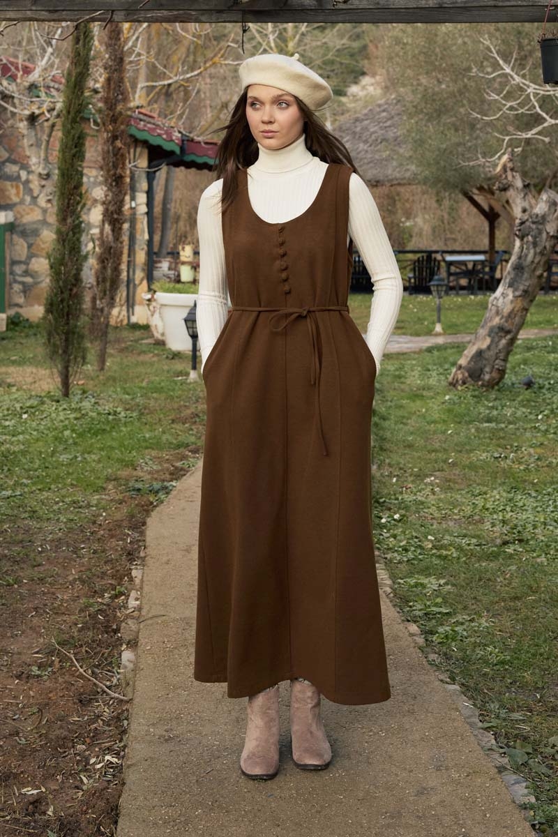 Round Neck Jumper Dress Brown combines classic elegance with modern details through its clean and refined design. Thanks to its round neckline and sleeveless structure, it can be easily styled with shirts and blouses, while the waist-tie detail completes the silhouette in a balanced and feminine way. With its fluid drape, this jumper dress offers all-day comfort and is suitable for a wide range of styling, from office looks to everyday chic combinations.