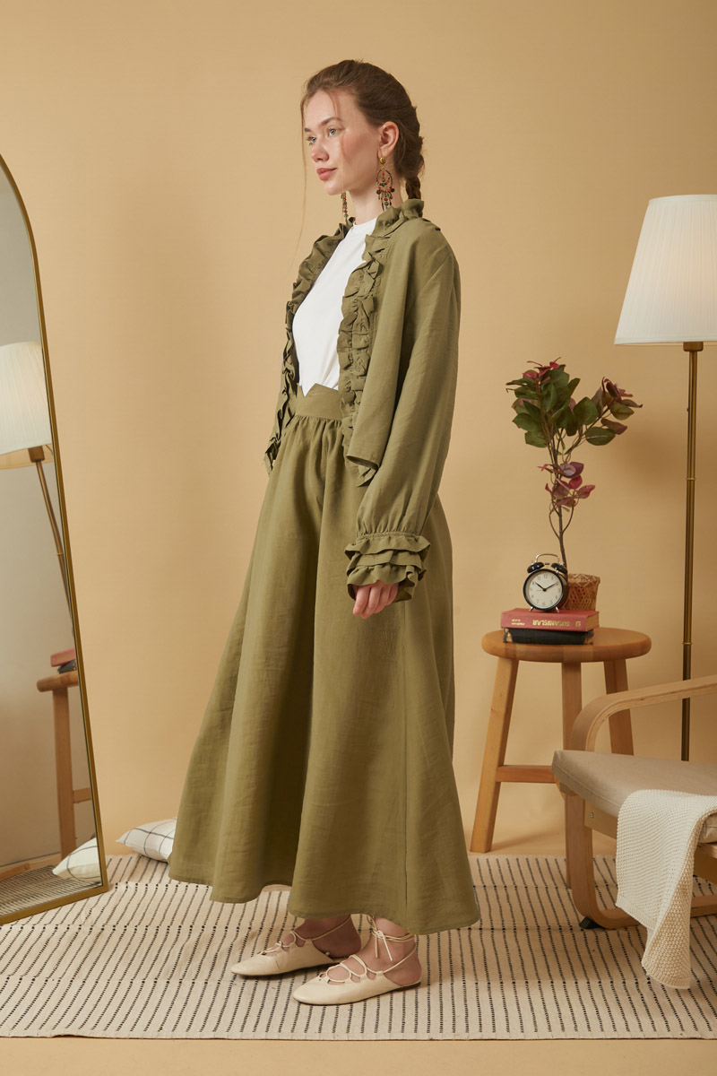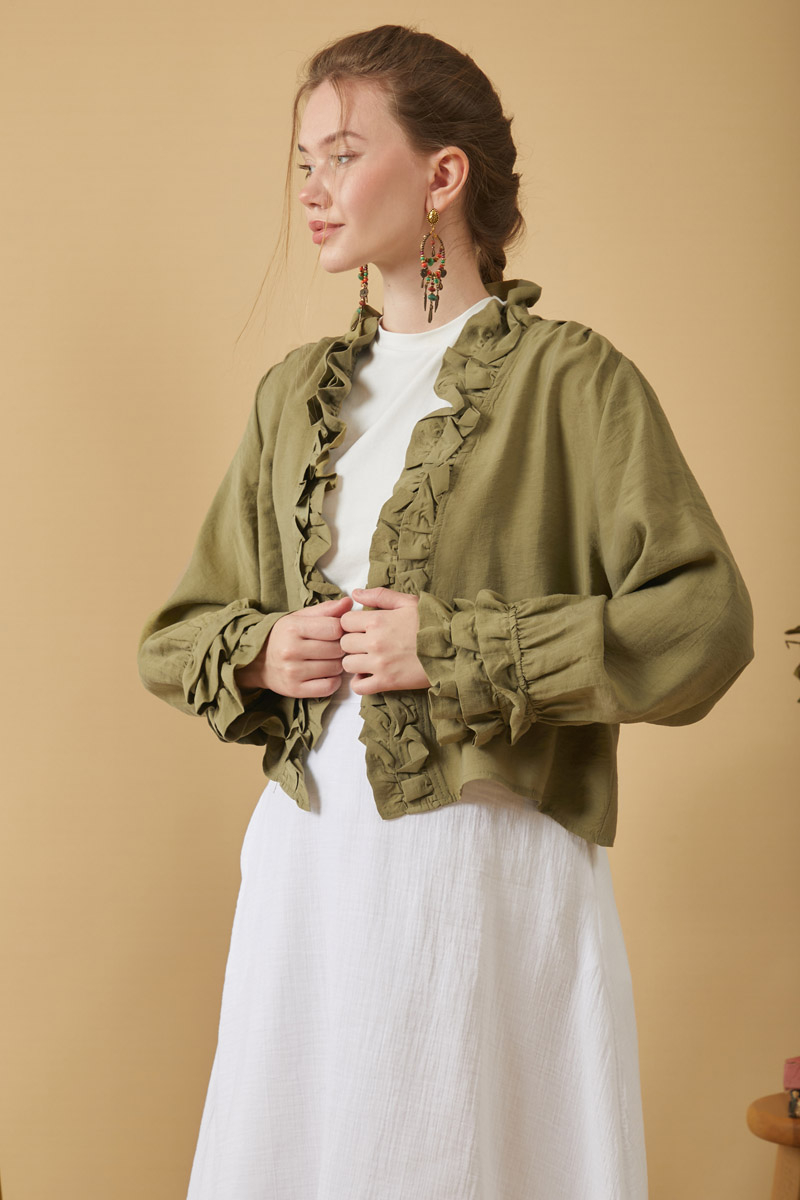 This blouse features eye-catching ruffle details on the front and a V-neck cut, offering a modern elegance. Made with lightweight, flowing fabric, it provides comfort throughout the day. Ideal for both special occasions and everyday styling.