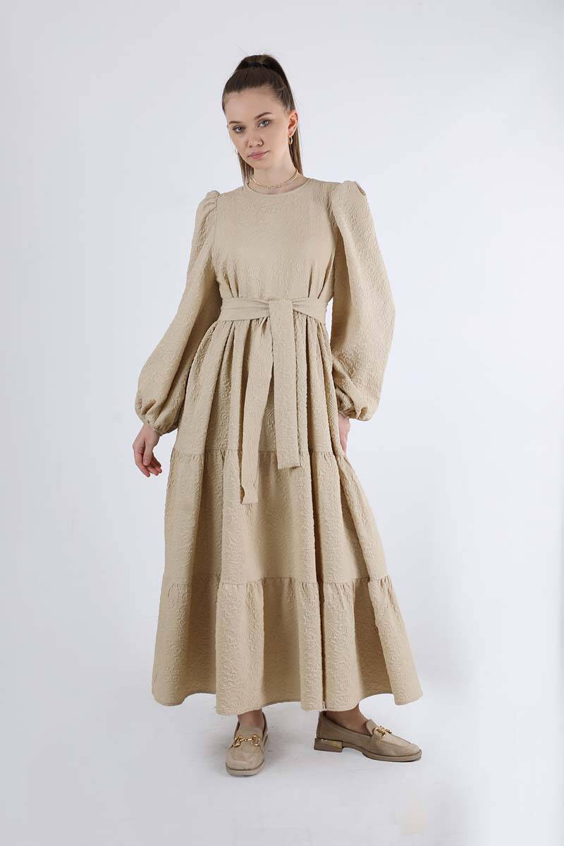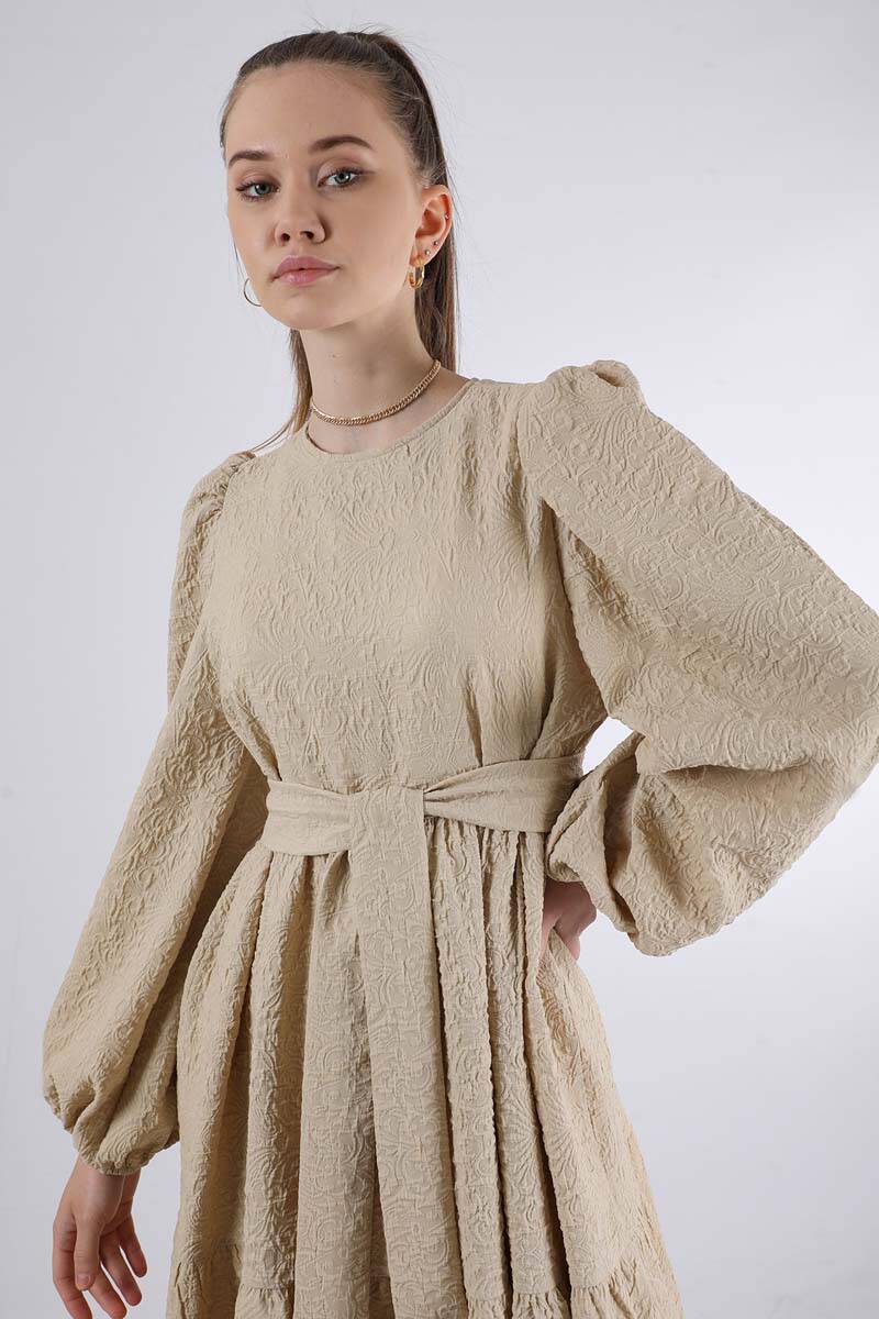 Ruffle Detailed Dress Dark Beige. The top of the shoulder is shirred. Ruffle detail. The cuff is elastic. Bicycle collar. It has a back zipper. It is belted. Unlined (does not show inside). It is an oversized pattern. You can choose it for your daily use and special days.