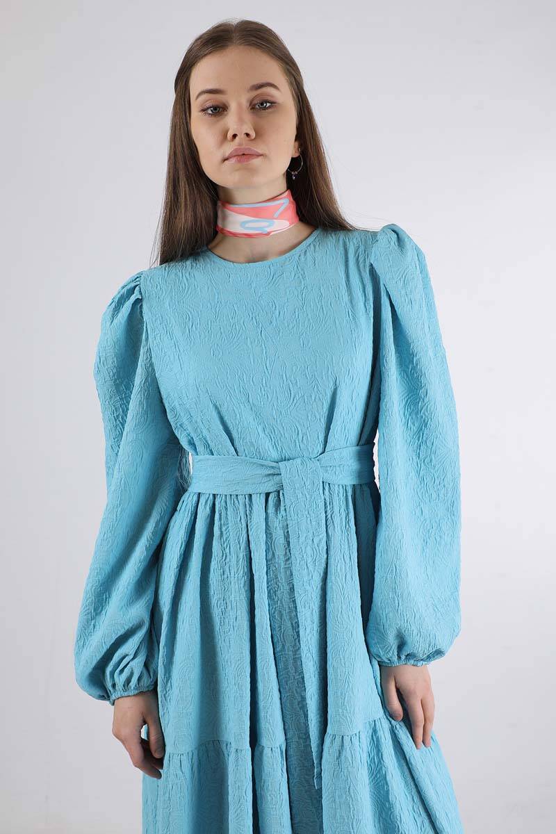 Ruffle Detailed Dress Light Blue. The top of the shoulder is shirred. Ruffle detail. The cuff is elastic. Bicycle collar. It has a back zipper. It is belted. Unlined (does not show inside). It is an oversized pattern. You can choose it for your daily use and special days.
