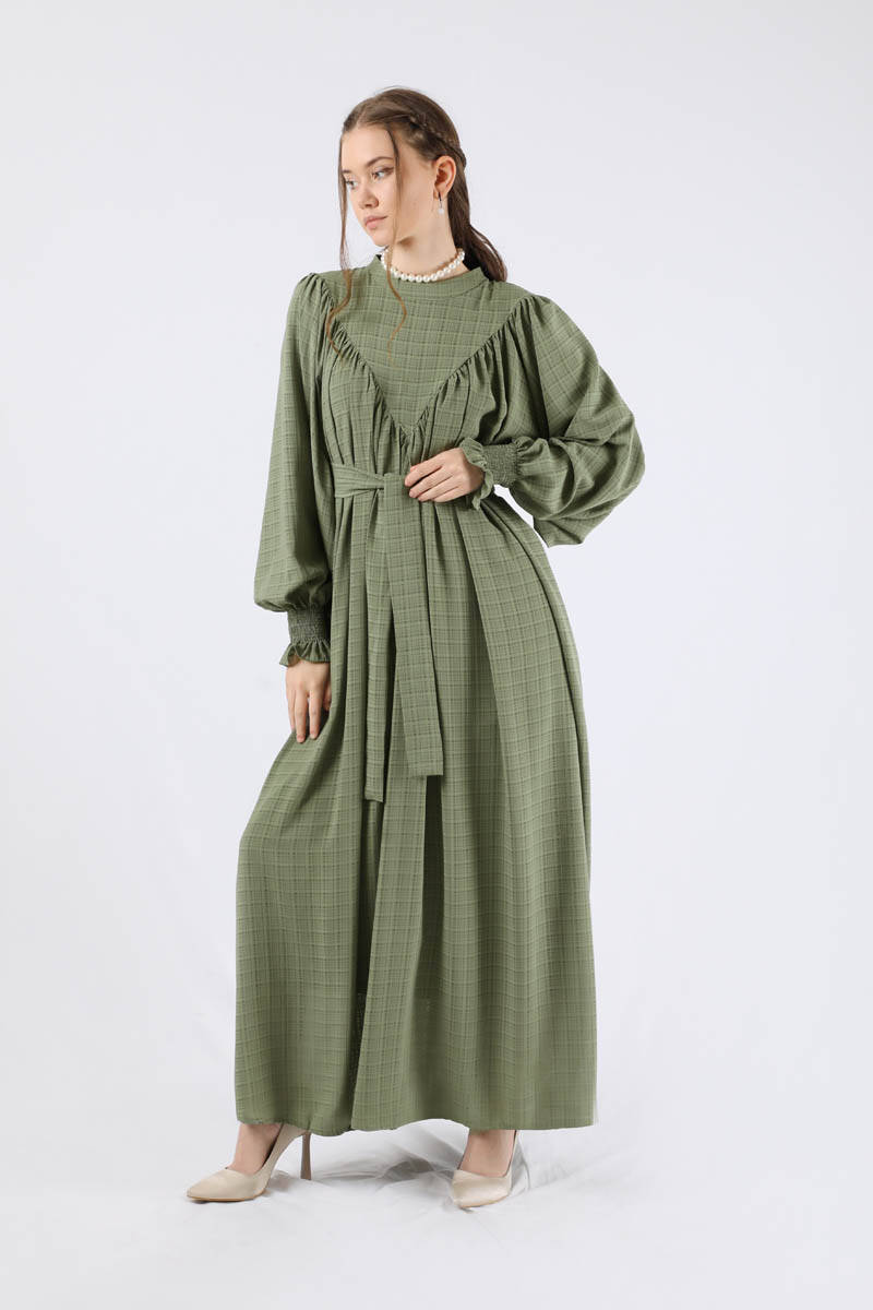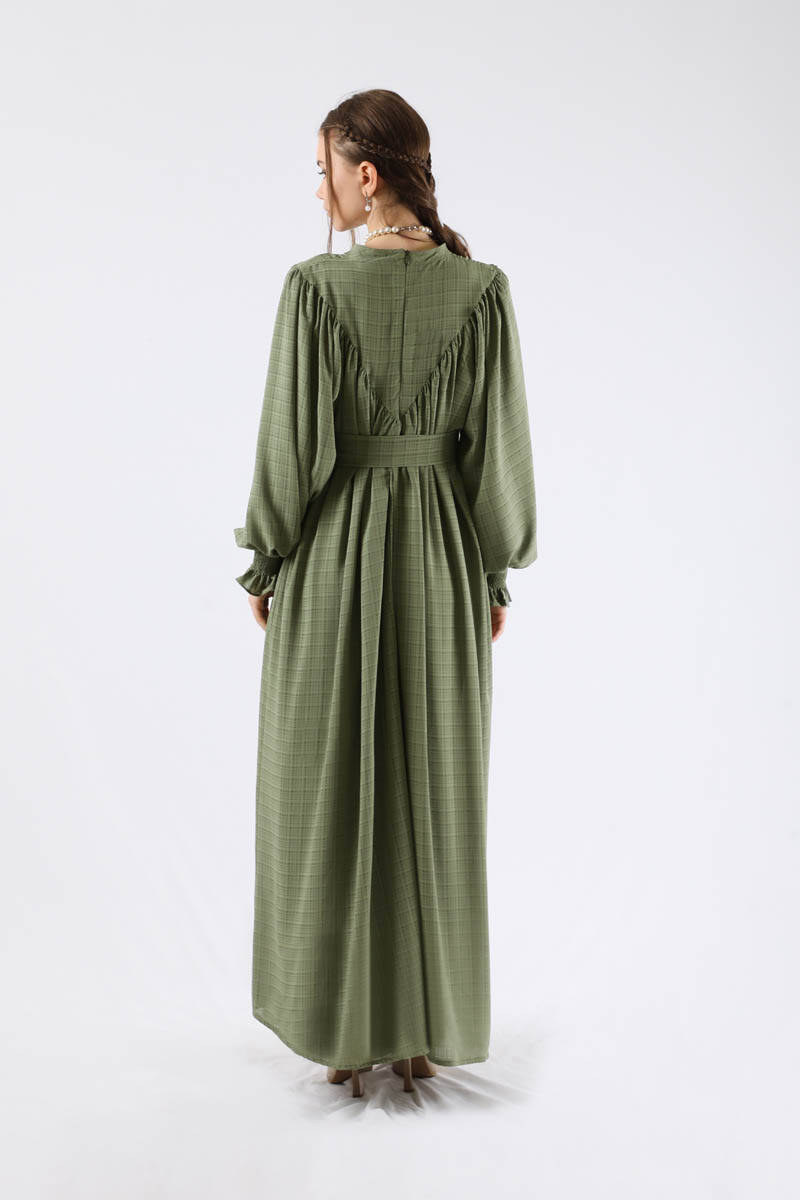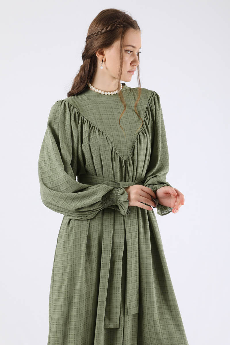 Ruffle Detailed Pleated Dress Khaki. The cuff is frilly detailed, it is gipped. The front yoke is shirred. It is belted. Judge Collar. It has a back zipper. It is lined.