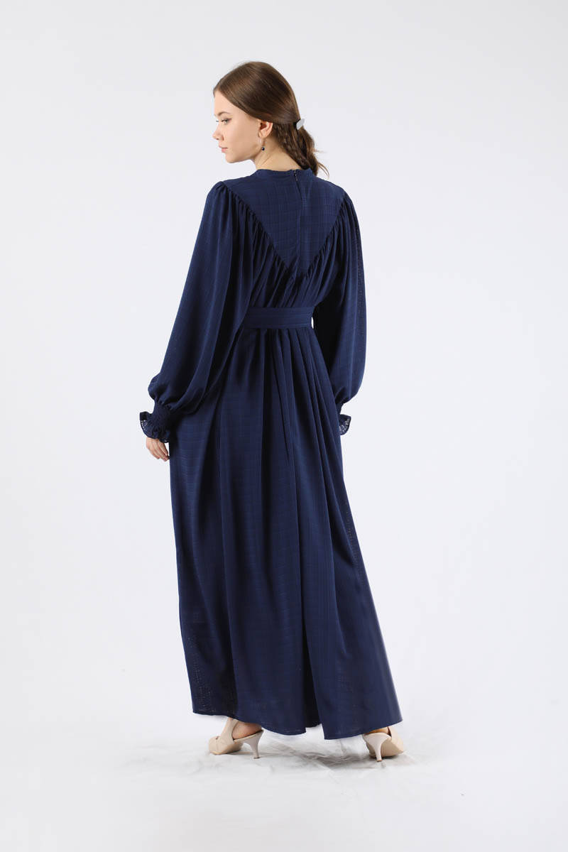 Ruffle Detailed Pleated Dress Navy Blue. The cuff is frilly detailed, it is gipped. The front yoke is shirred. It is belted. Judge Collar. It has a back zipper. It is lined.