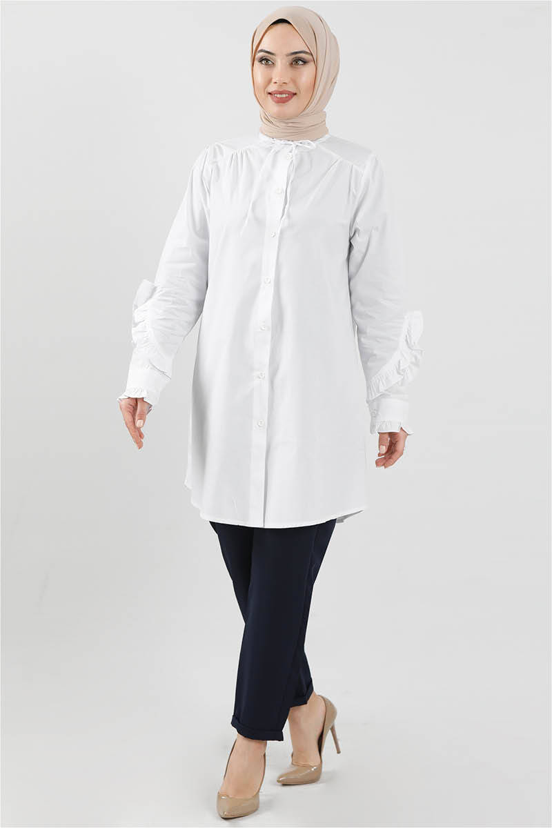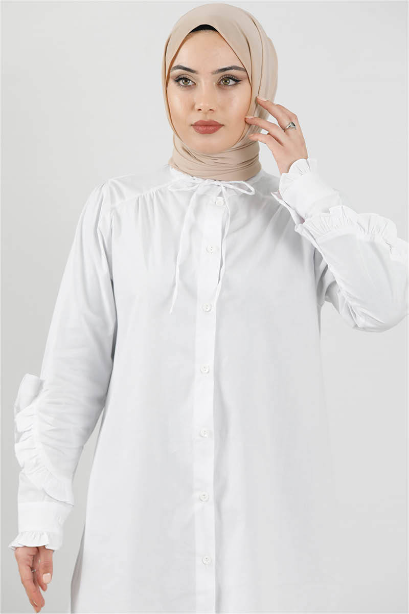 Yaka ve kolu fırfır detayı vardır. Yakası bağcıklıdır. Hakim yaka. Ön omuz da büzgü detayı vardır. Önden düğmelidir.