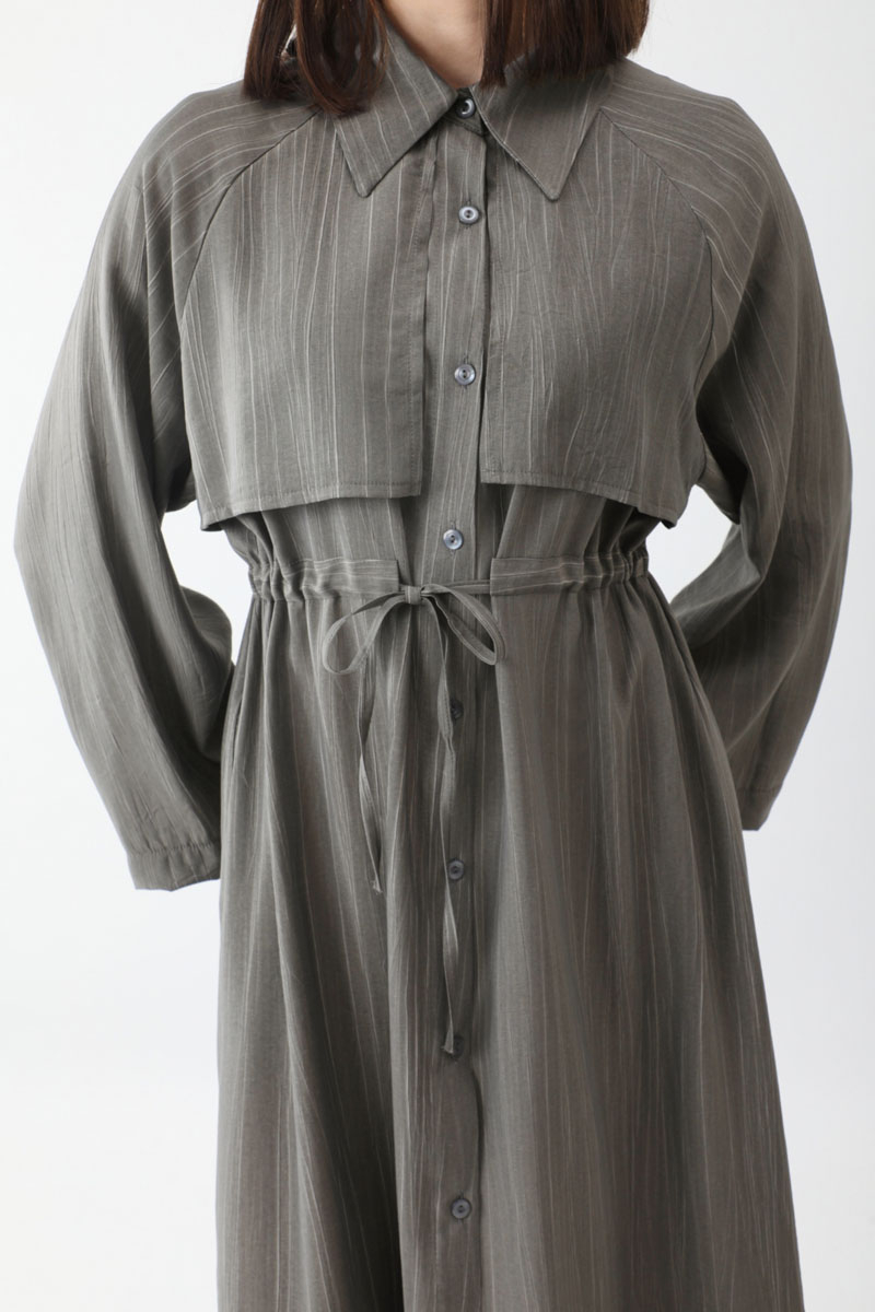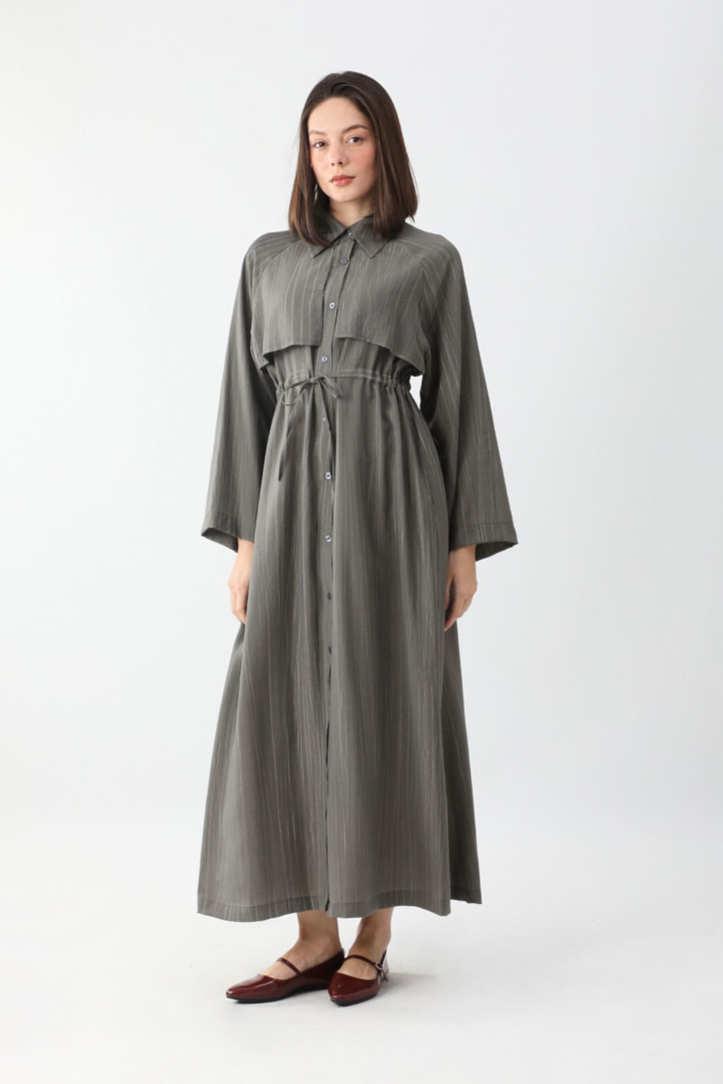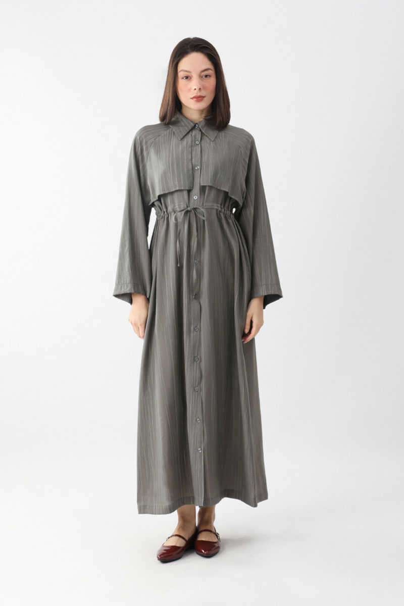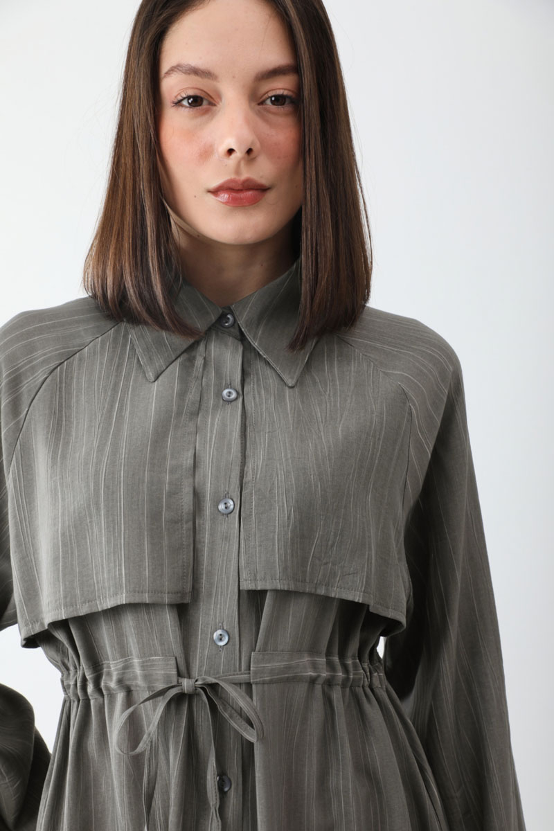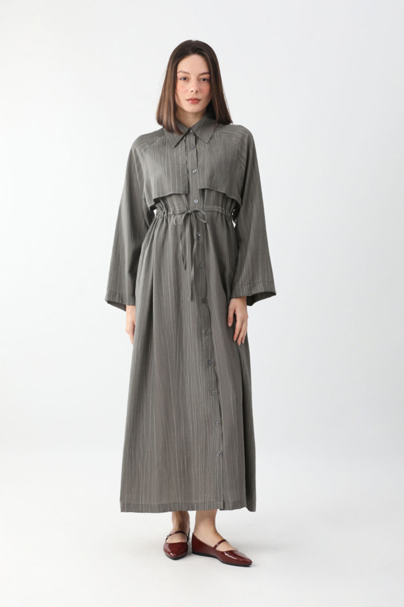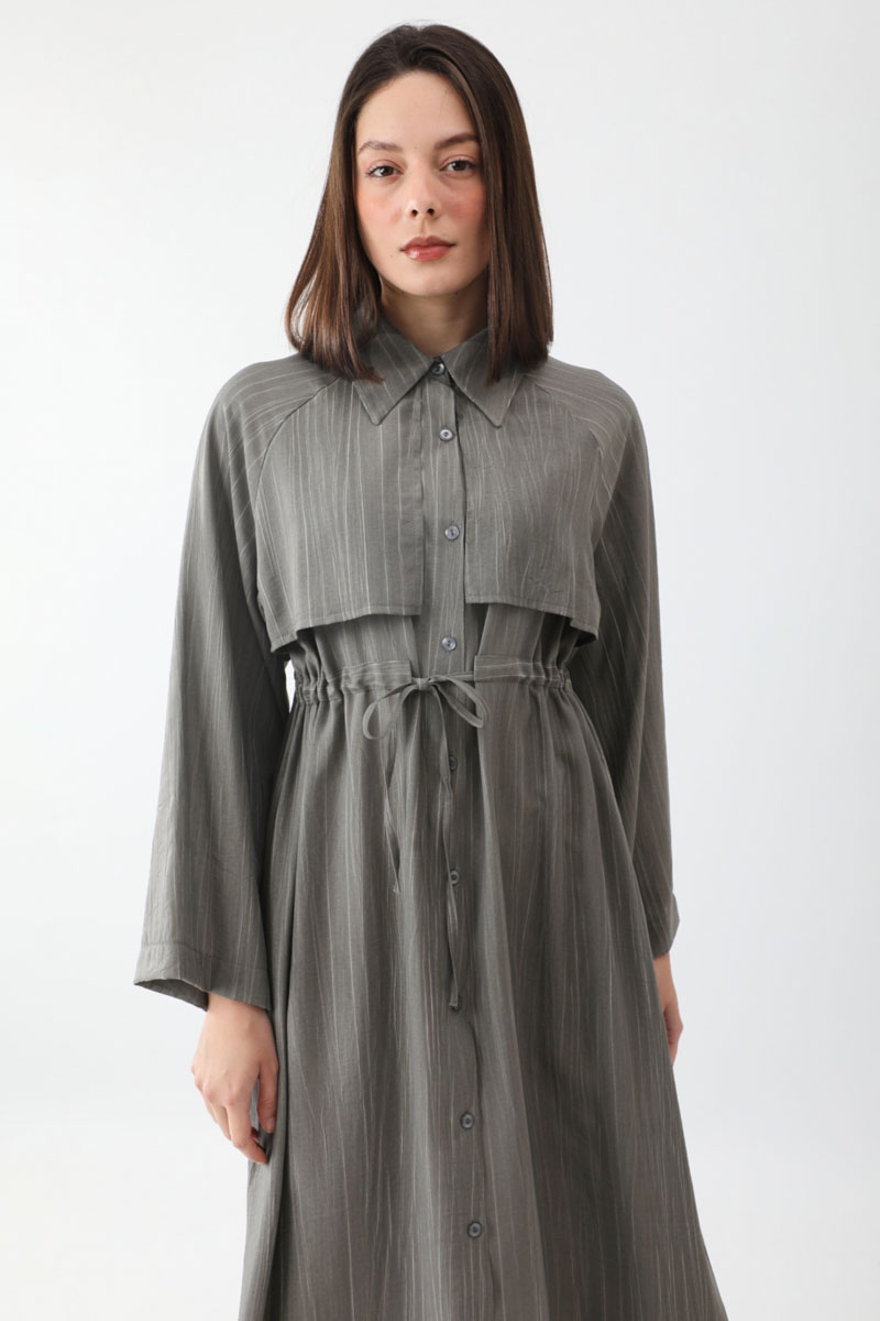 Rüzgarlıklı Gömlek Elbise Antrasit. Gömlek yakadır, önden rüzgarlıklıdır, tünel bağlamalıdır, reglan kolludur, önden düğmelidir, yandan ceplidir, astarsızdır, Günlük kullanım için uygundur.