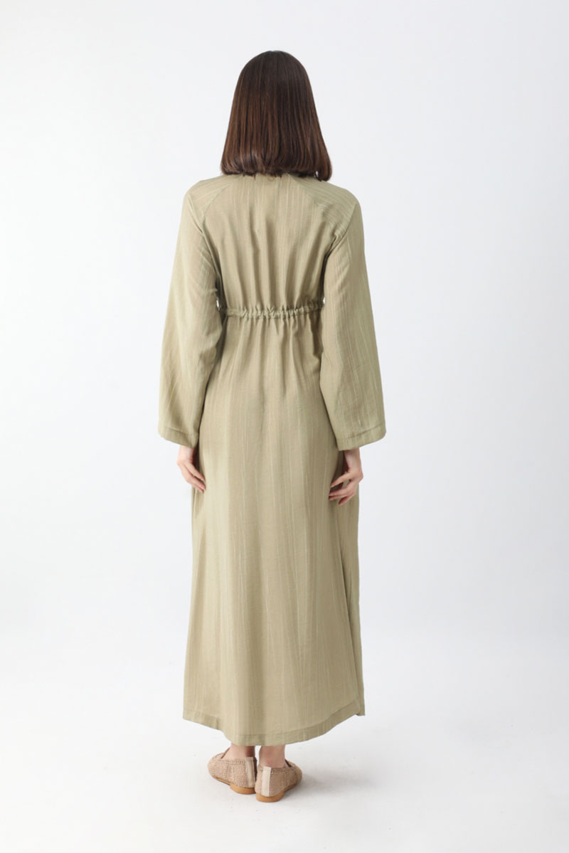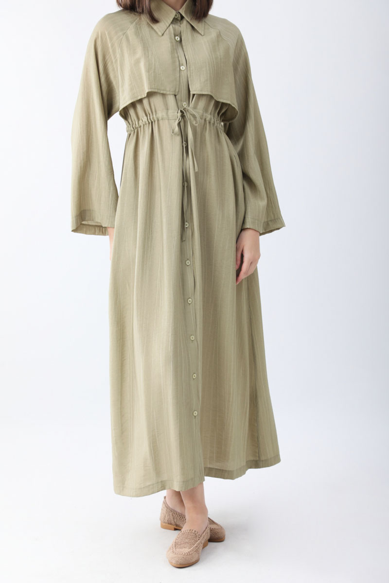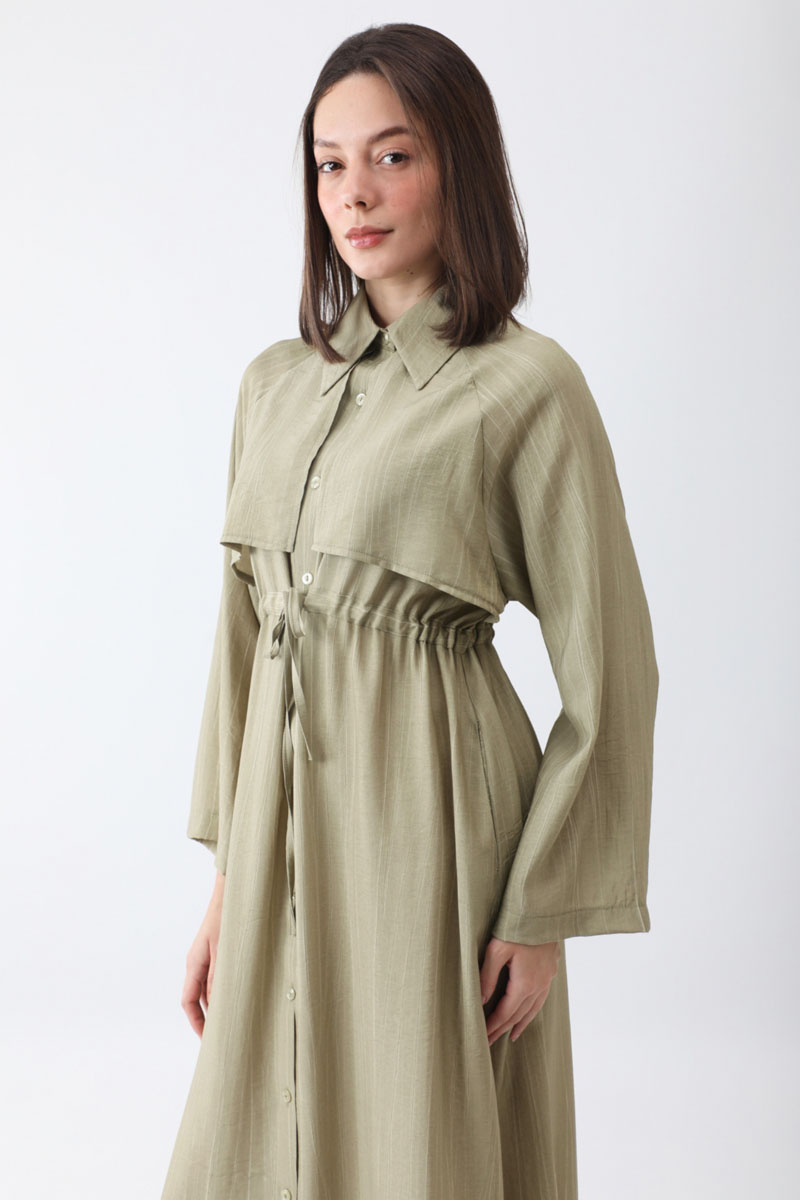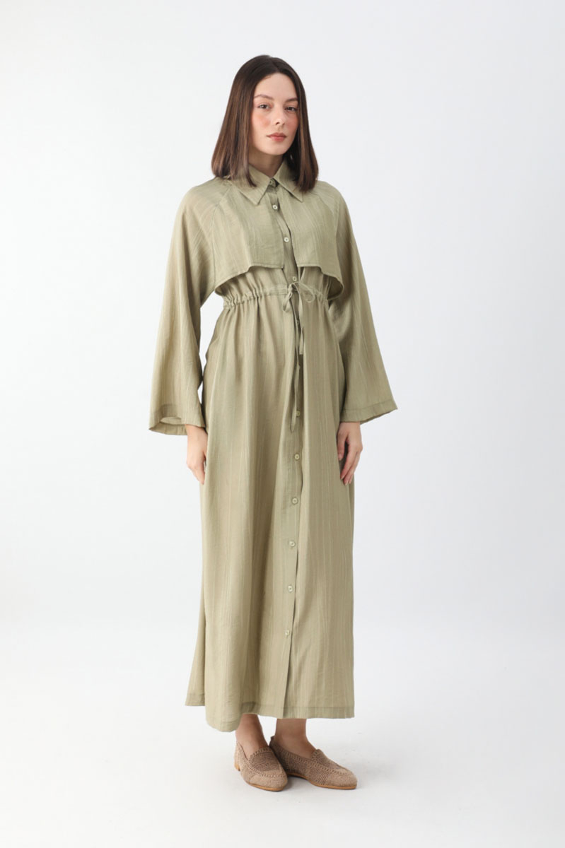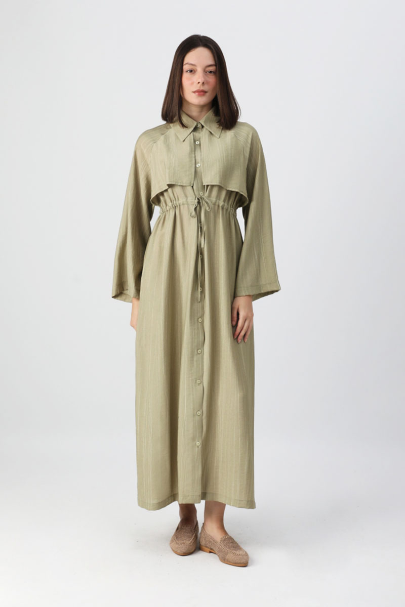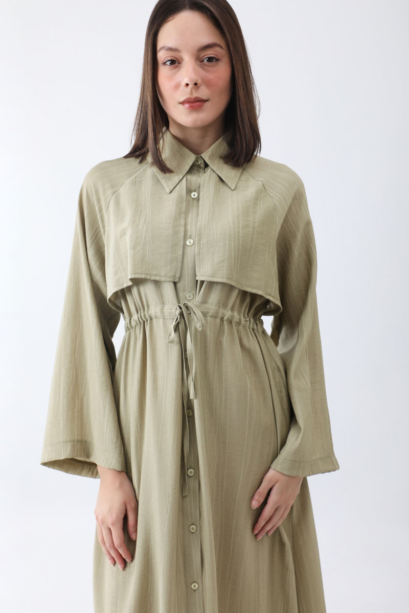 Rüzgarlıklı Gömlek Elbise Haki. Gömlek yakadır, önden rüzgarlıklıdır, tünel bağlamalıdır, reglan kolludur, önden düğmelidir, yandan ceplidir, astarsızdır, Günlük kullanım için uygundur.