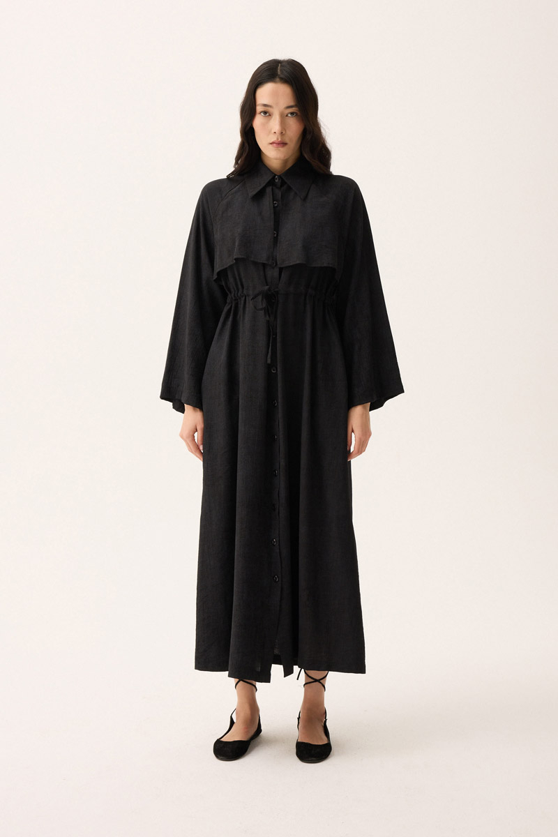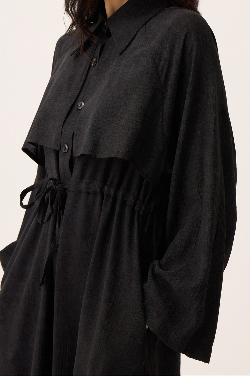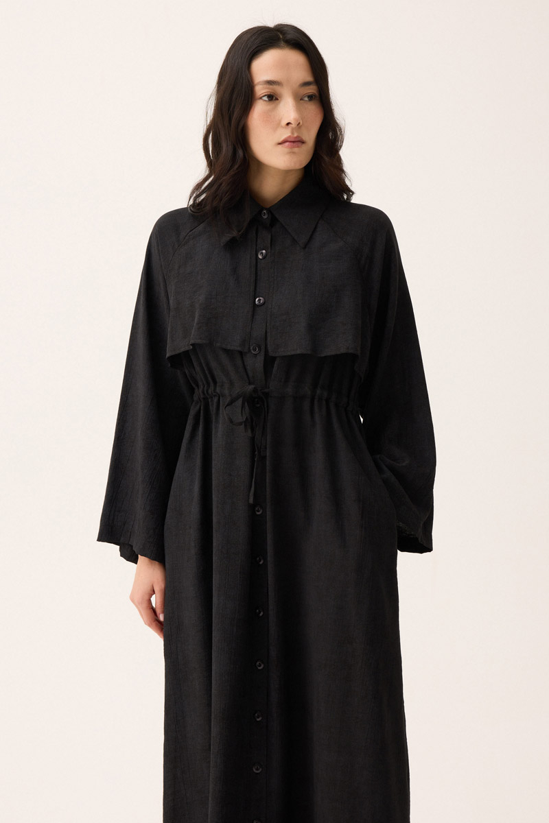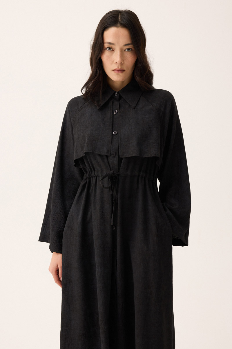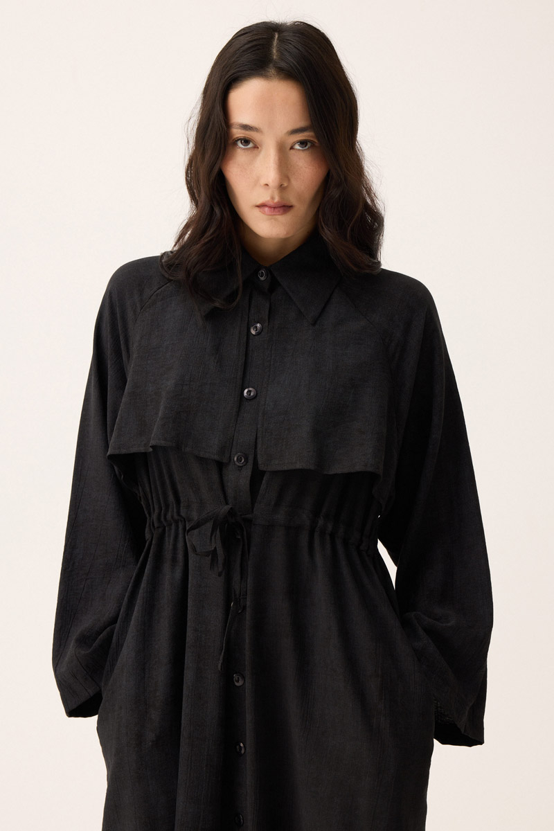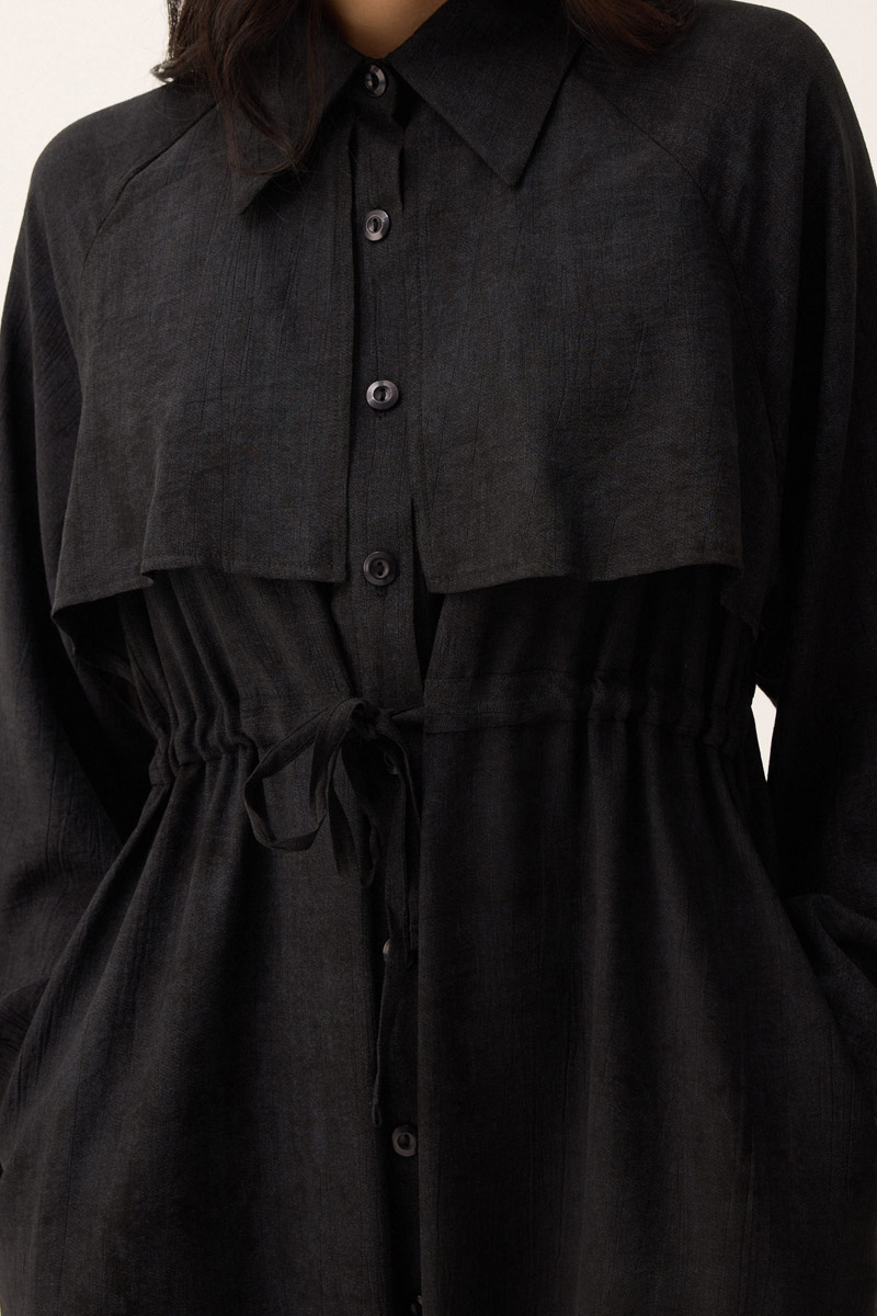 Rüzgarlıklı Gömlek Elbise Siyah. Gömlek yakadır, önden rüzgarlıklıdır, tünel bağlamalıdır, reglan kolludur, önden düğmelidir, yandan ceplidir, astarsızdır, Günlük kullanım için uygundur.