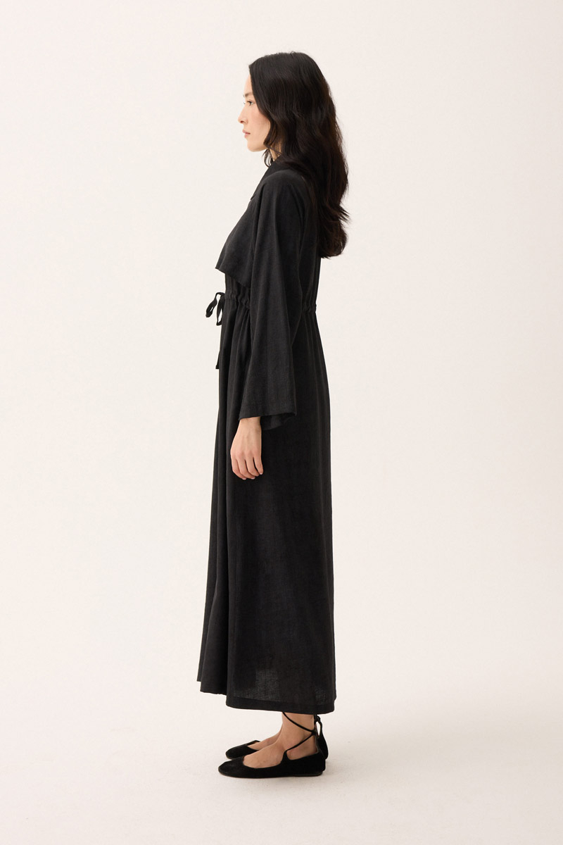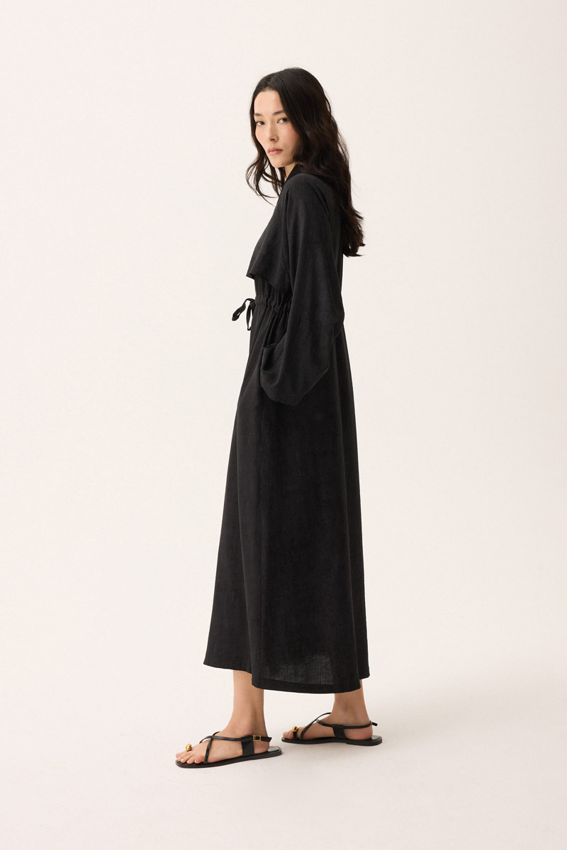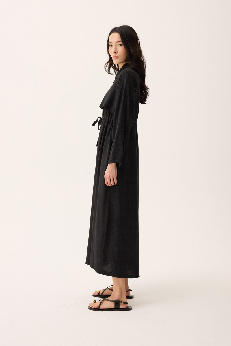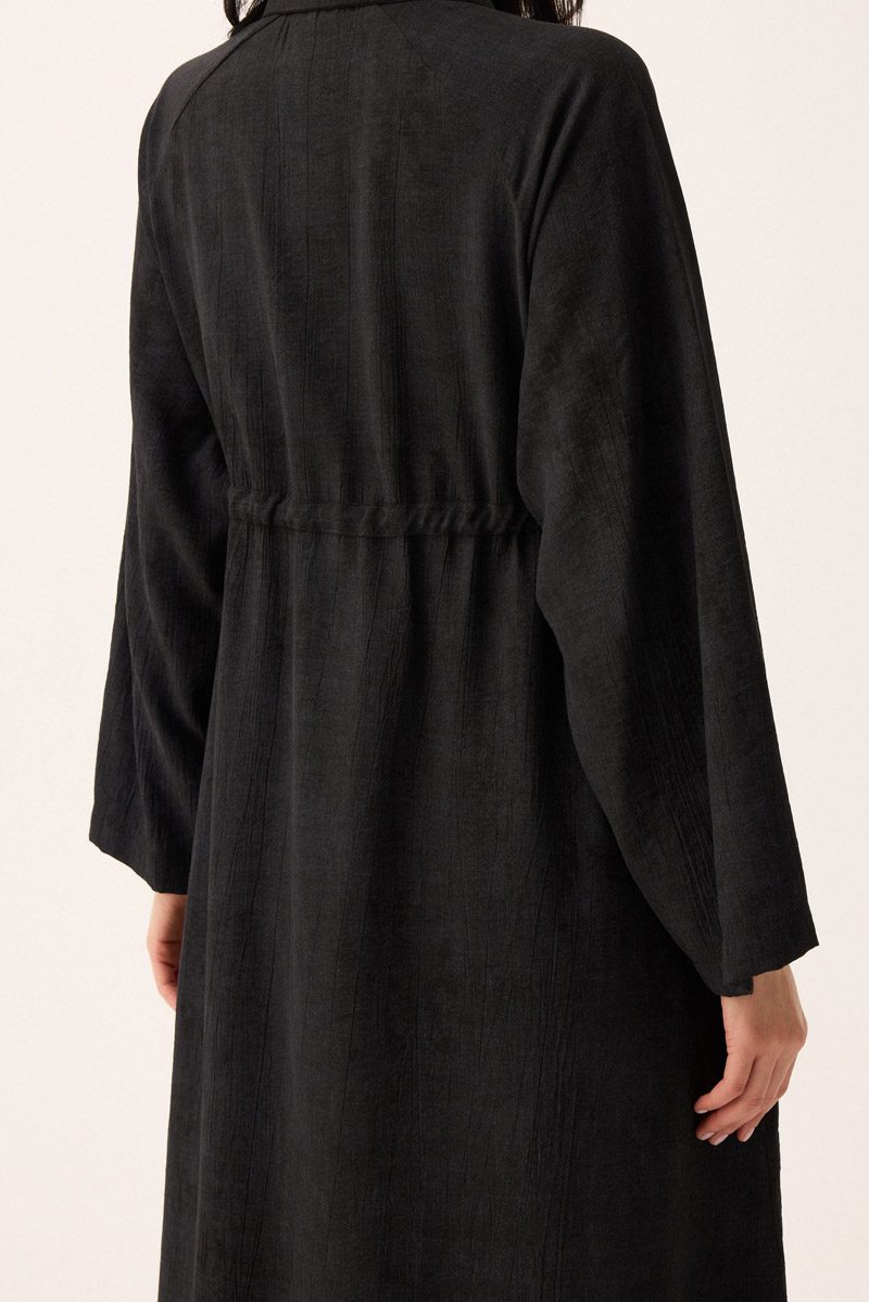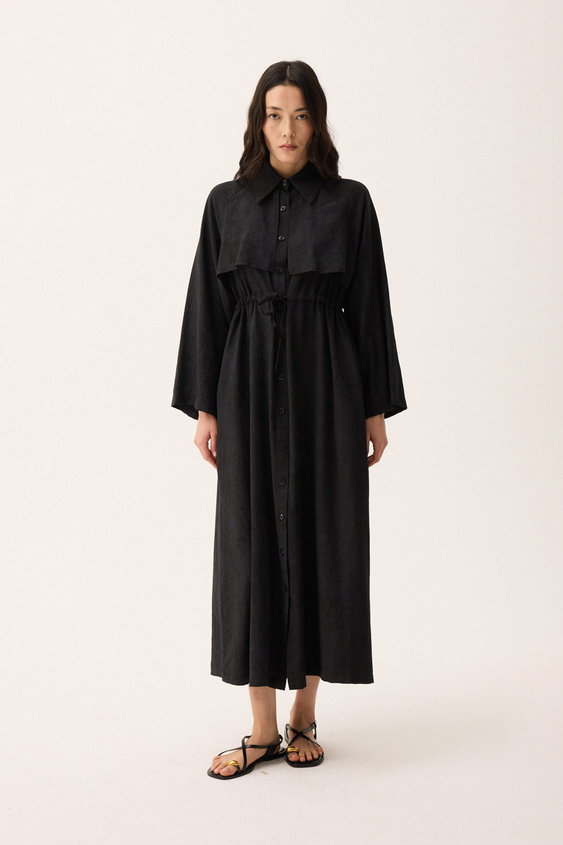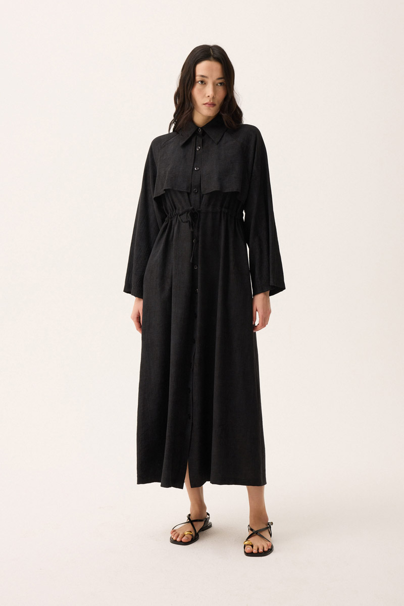 Rüzgarlıklı Gömlek Elbise Siyah. Gömlek yakadır, önden rüzgarlıklıdır, tünel bağlamalıdır, reglan kolludur, önden düğmelidir, yandan ceplidir, astarsızdır, Günlük kullanım için uygundur.