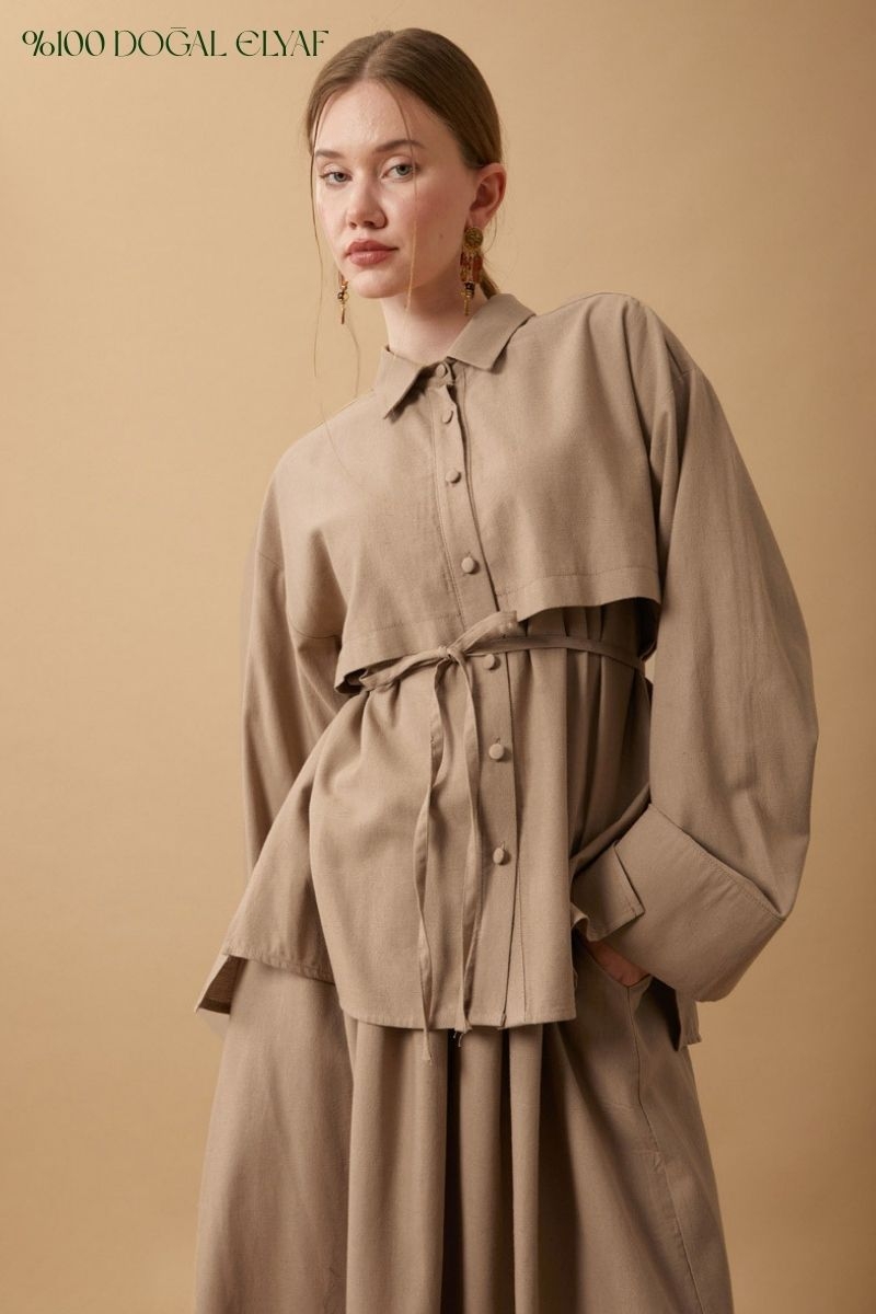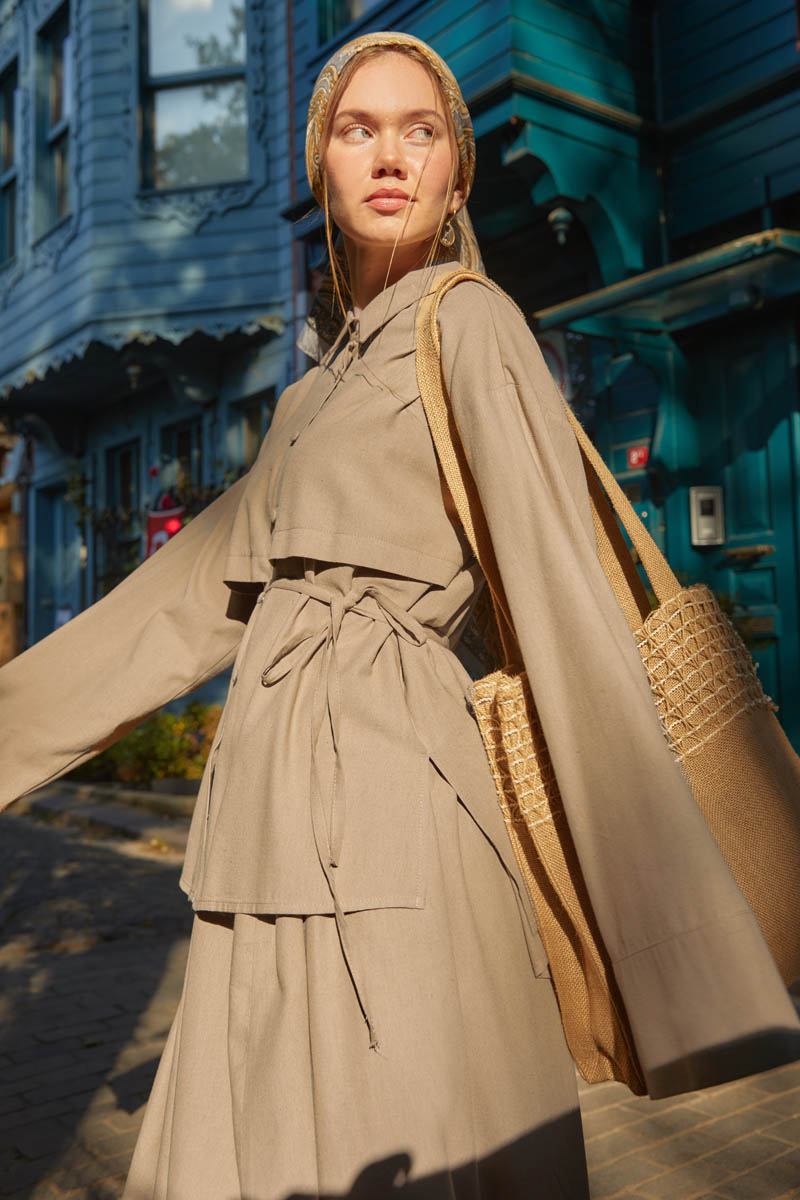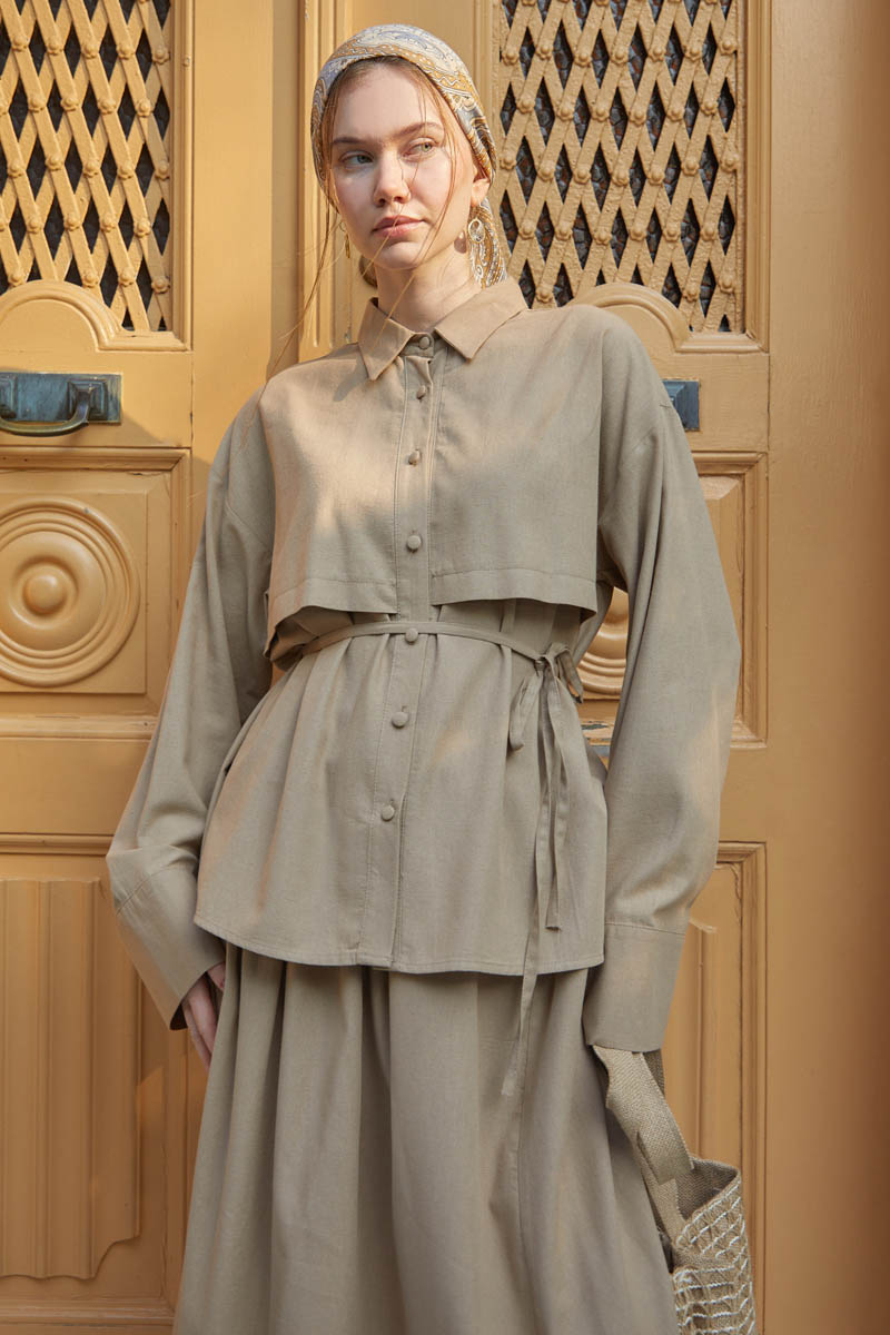 Rüzgarlıklı Keten Etek Takım Vizon