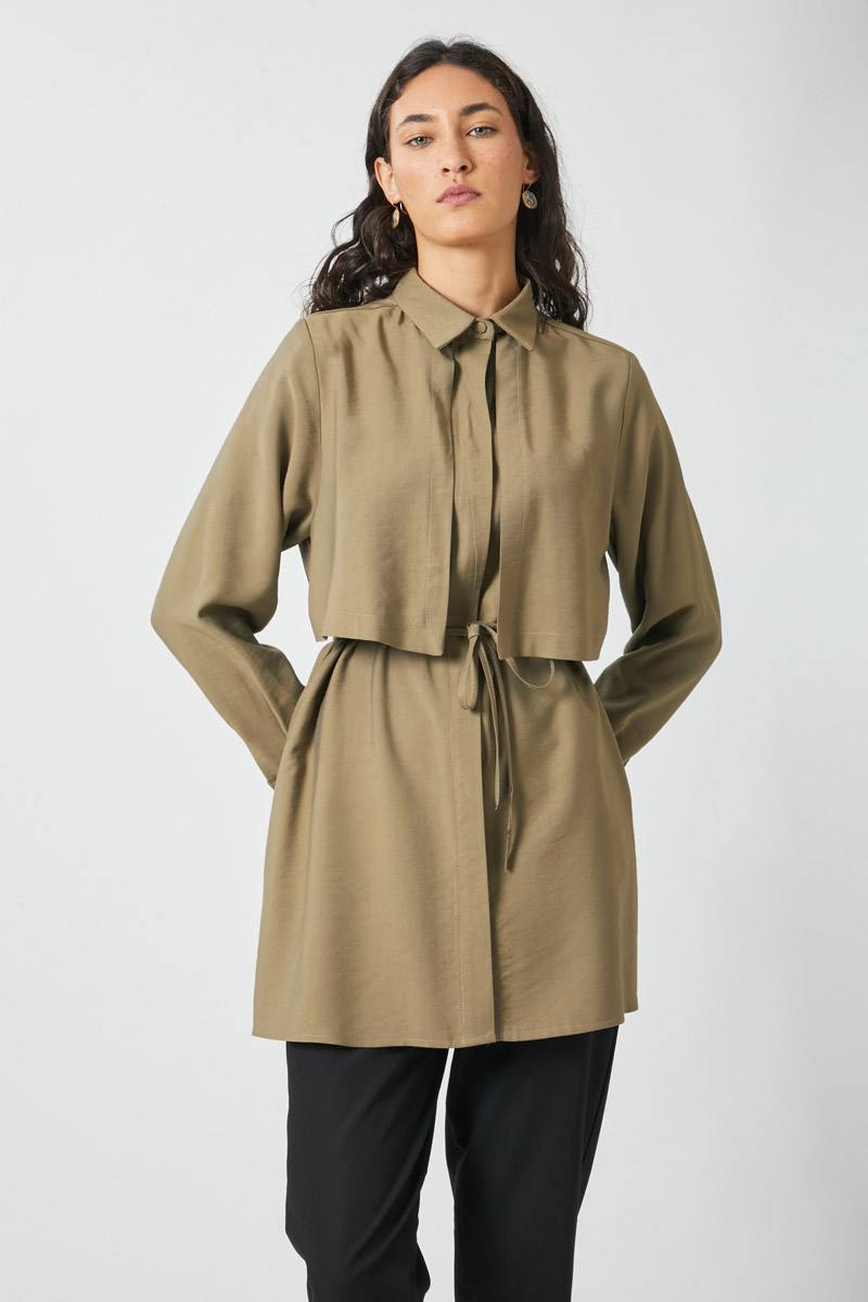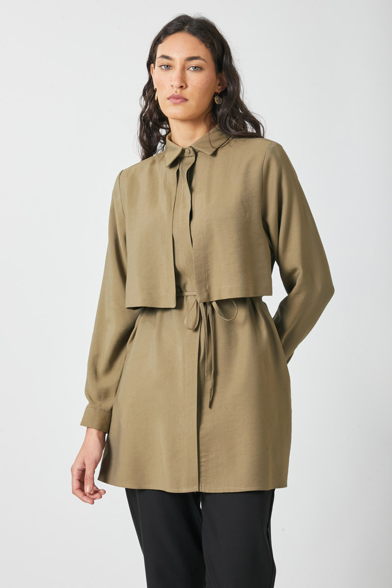 Windbreaker Detail Tencel Shirt Black. Features a classic shirt collar, front button closure, wind flap detail, piping belt, and cuffed sleeves. Ideal for both daily wear and special occasions.