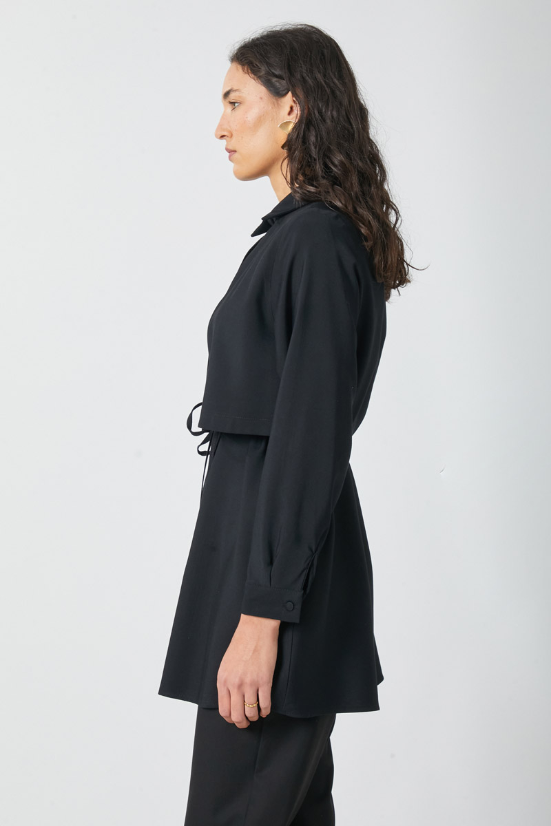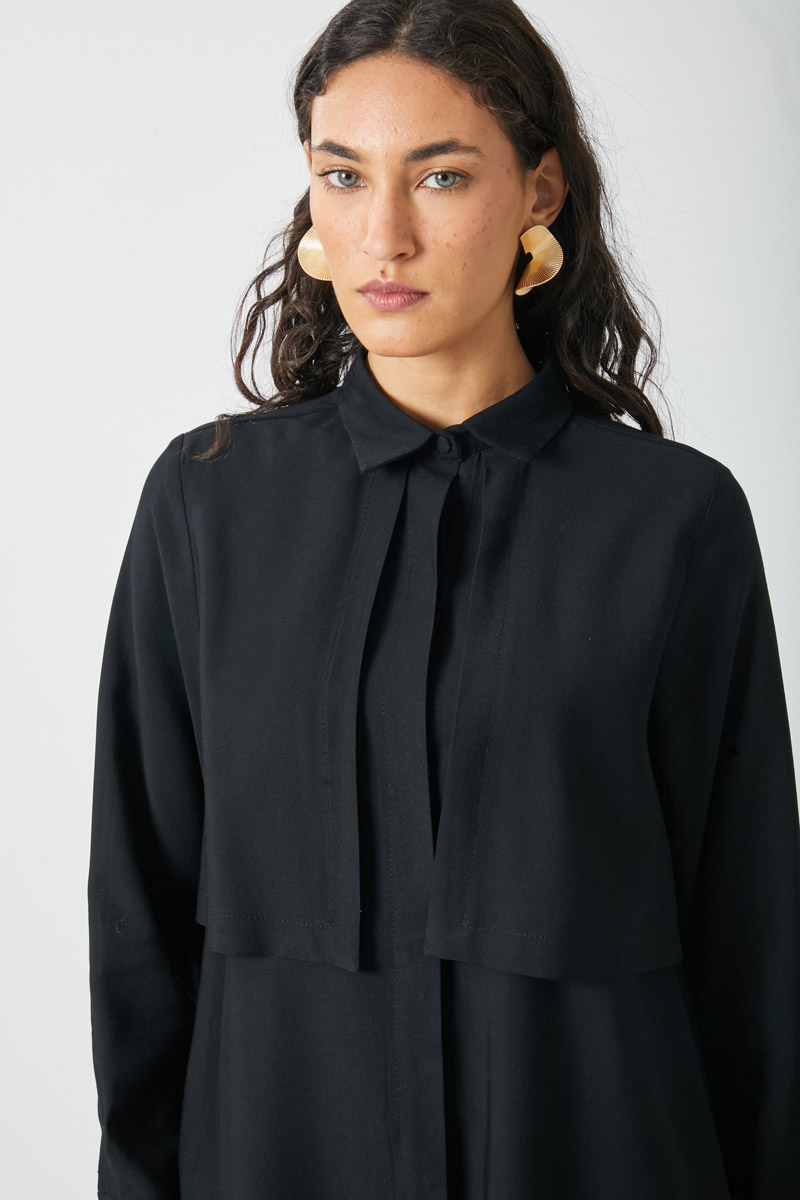 Rüzgarlıklı Tensel Gömlek Siyah. Gömlek yakadır, önden düğmeli ve rüzgarlık detaylıdır, biye kuşaklıdır, bilekleri manşetlidir. Günlük kullanım ve özel günlerinizde tercih edebilirsiniz.